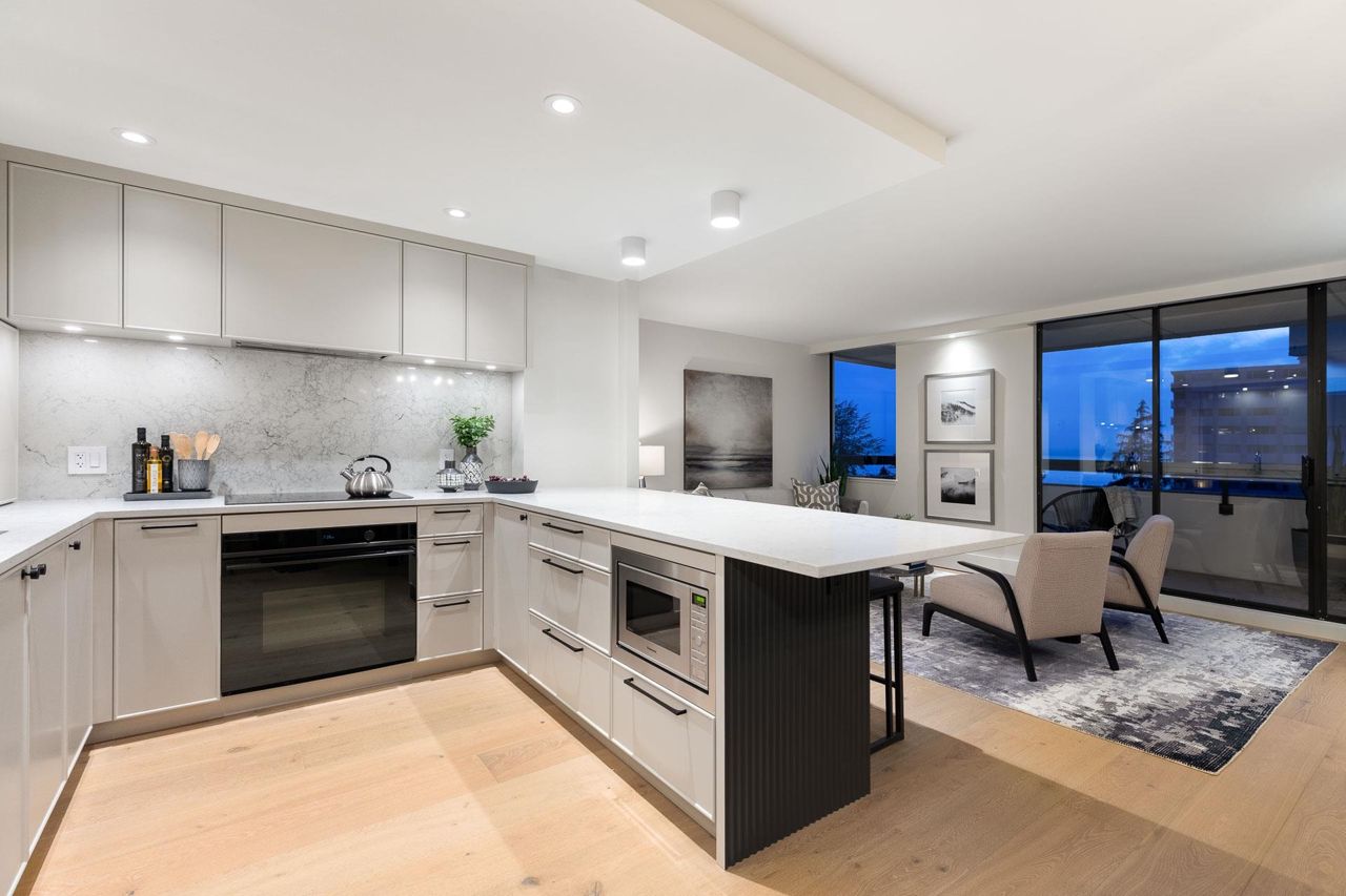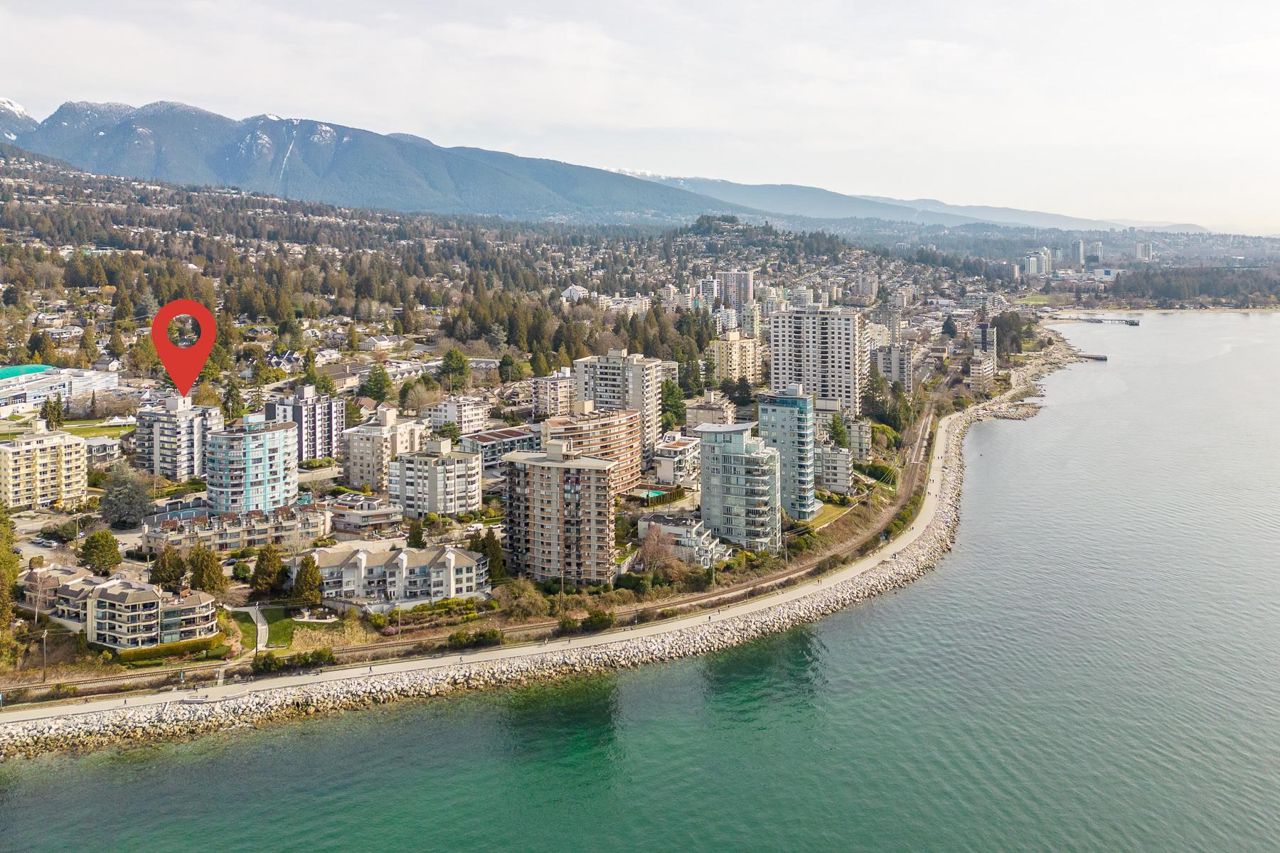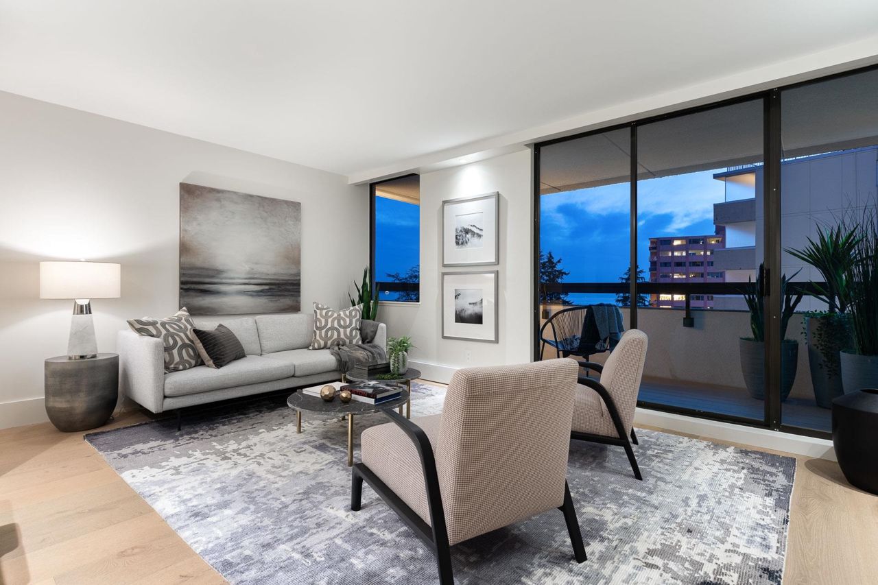 Beautifully redesigned & exceptionally appointed by Linda & Michelle Burger this stunning suite has beautiful views from every room and is located in prime Dundarave just steps to the Seawall, restaurants and WV Community & Seniors Centres.What was once your average 2 bedroom/2bathroom apartment has now been transformed into a stunning suite that shows like new with superior finishings, gorgeous gourmet kitchen with a walk-in pantry, beautiful living & dining areas with wide plank flooring that open onto a pretty exterior deck. The spacious bedrooms have amble separation for privacy, two beautifully updated spa-like bathrooms, stunning entry foyer plus a laundry “room”. With only three suites per floor, two elevators and a lovely outdoor pool setting this is the perfect place to call home!