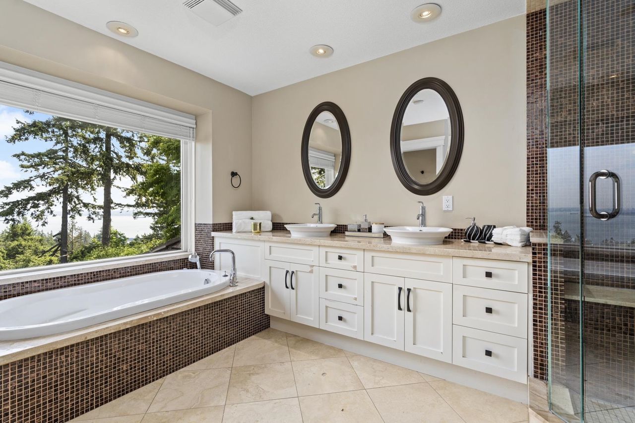 Situated on a sought-after Caulfeild cul-de-sac, contemporary 5 bedrs family home sits on a spacious, sun-soaked 14,746 sq ft lot with stunning ocean and city views! This home boasts a gourmet kitchen with top of the line stainless steel Subzero fridge, Jenn-Air double wall oven, granite countertops and built-in wine rack. Other features includel large livingroom with high ceilings, French doors, master bedroom with large walk-in closet, built-in vanity and 10 piece en-suite with rain shower and mosaic tiling, hardwood floors, 4 fireplaces, complete multimedia system, security cameras, ample storage and large deck for summer entertaining. Within walking distance to Caulfeild Elementary, Rockridge High School and Caulfeild Shopping Centre.