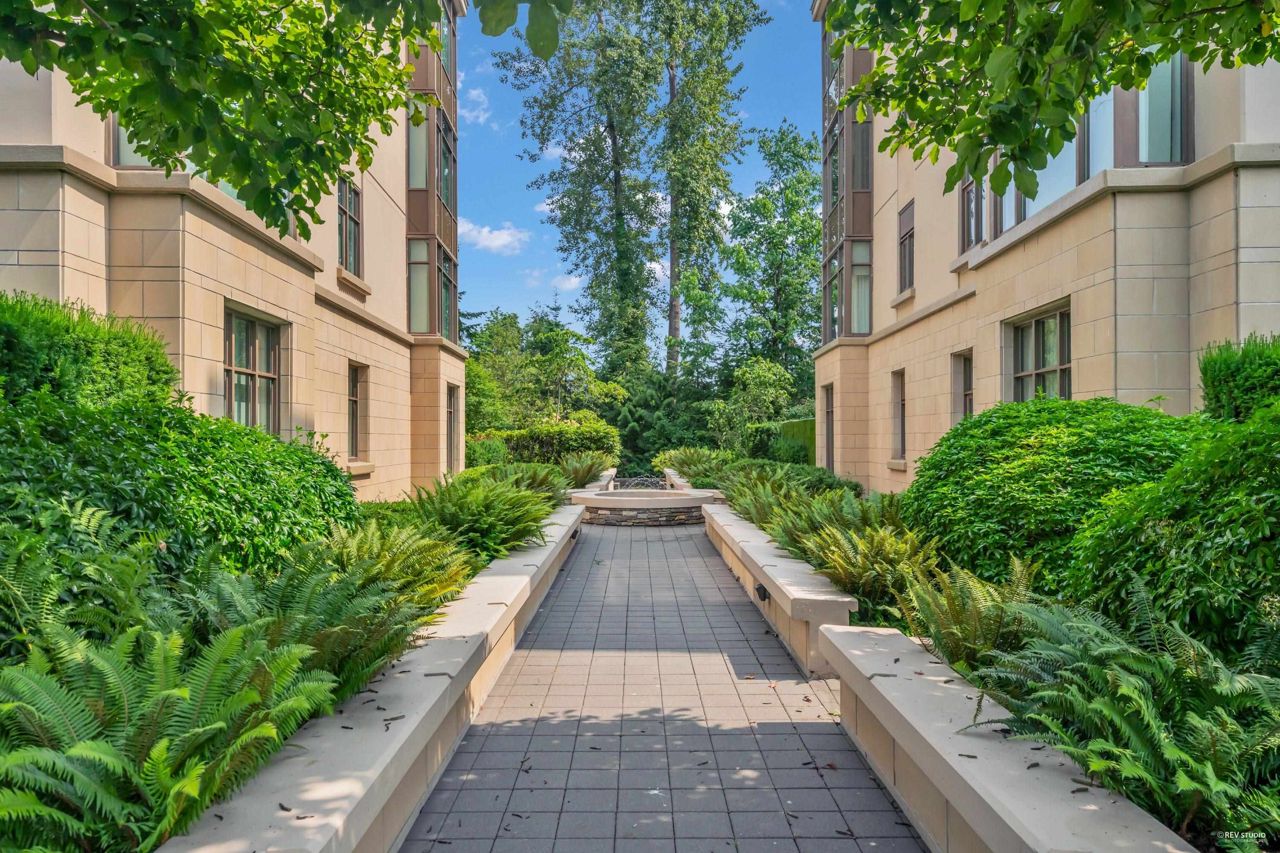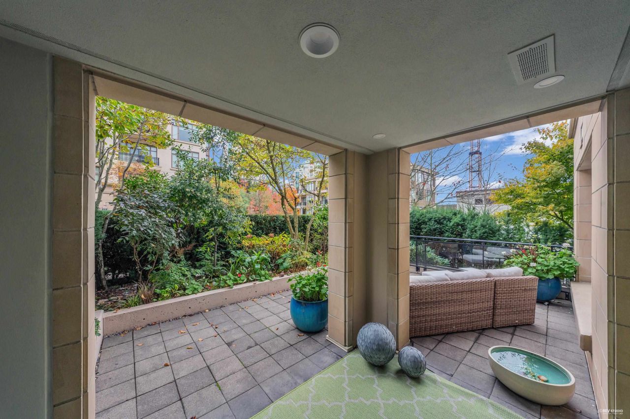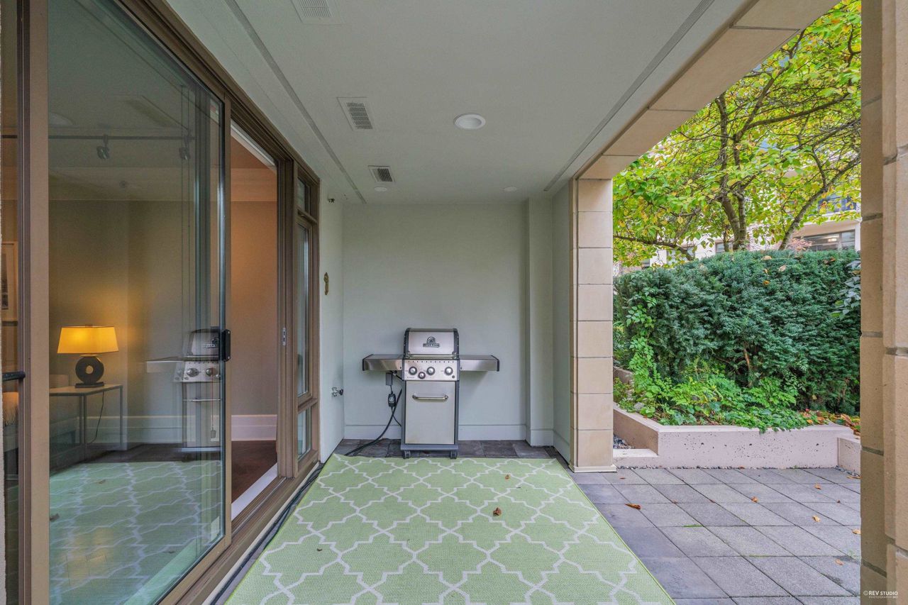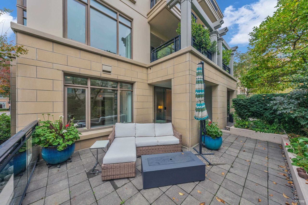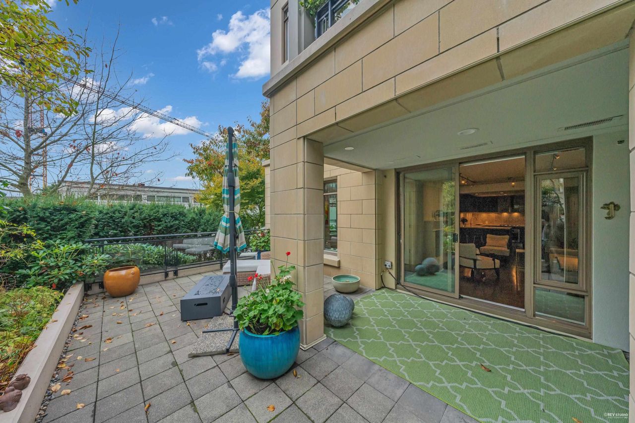 Elegant living at prestigious Waters Edge. Enjoy indoor/outdoor living at this exceptional S/W corner with unique large Private Garden Patio/Terrace (322 Sq ft) home designed by world renowned Robert Stern. Exquisite finishings, high ceilings, oak h/w flooring, solid wood doors, moldings, Euro style Kitchen with subzero fridge, gas range, air con. & fireplace. Originally 2 Bedrooms & Solarium (2nd bedroom & solarium now 1 large flex room, easily changed back). Concierge, impressive Library/Social Lounge, Fitness Centre, Steam/Sauna Spa. Pet friendly, great community & carefree living at wonderfully maintained & landscaped property. Access to Capilano Pacific Trails & public transit. Walk to all conveniences, Park Royal, Ambleside Beach & Seawall. Pleasure to Show!