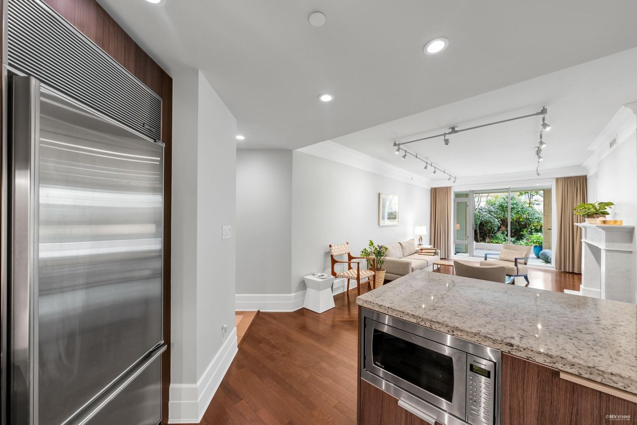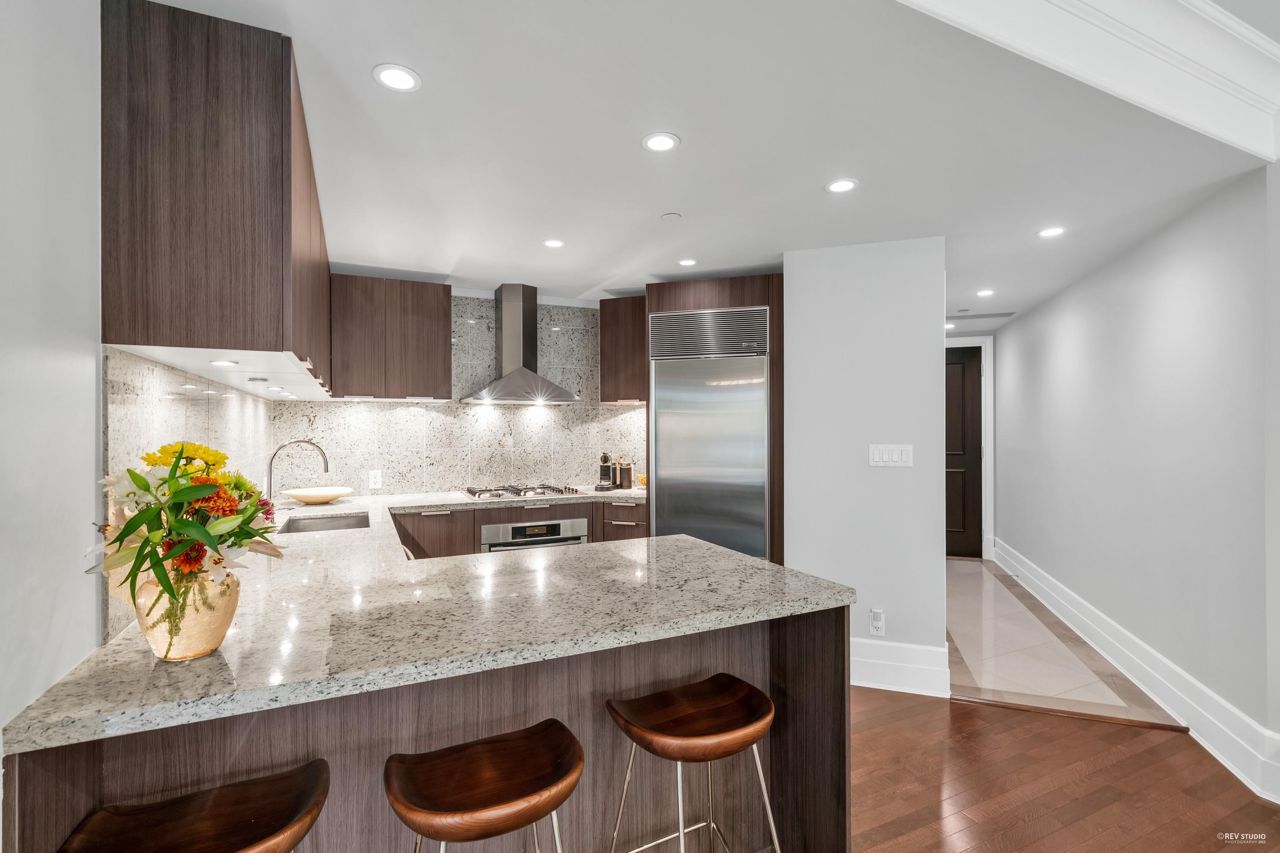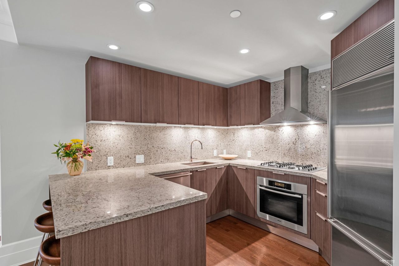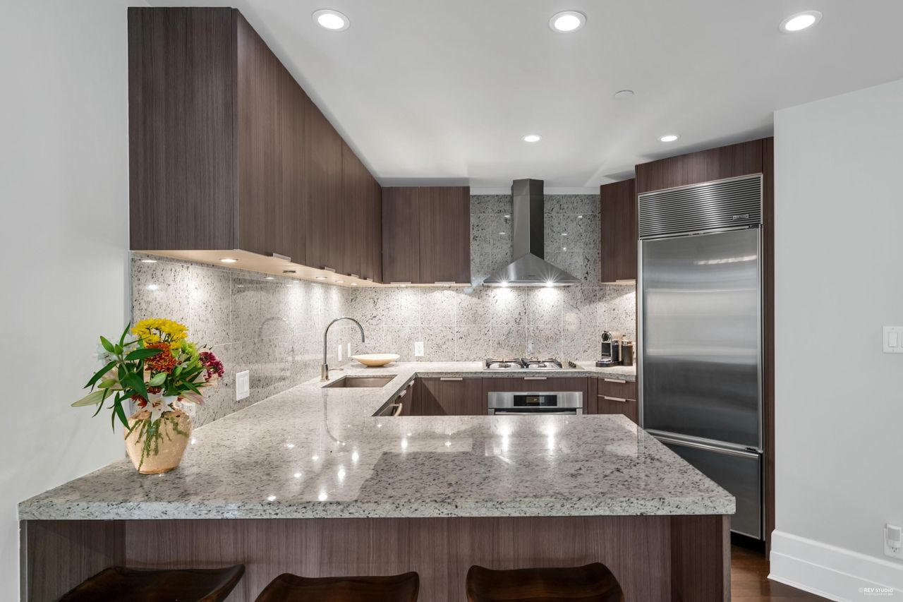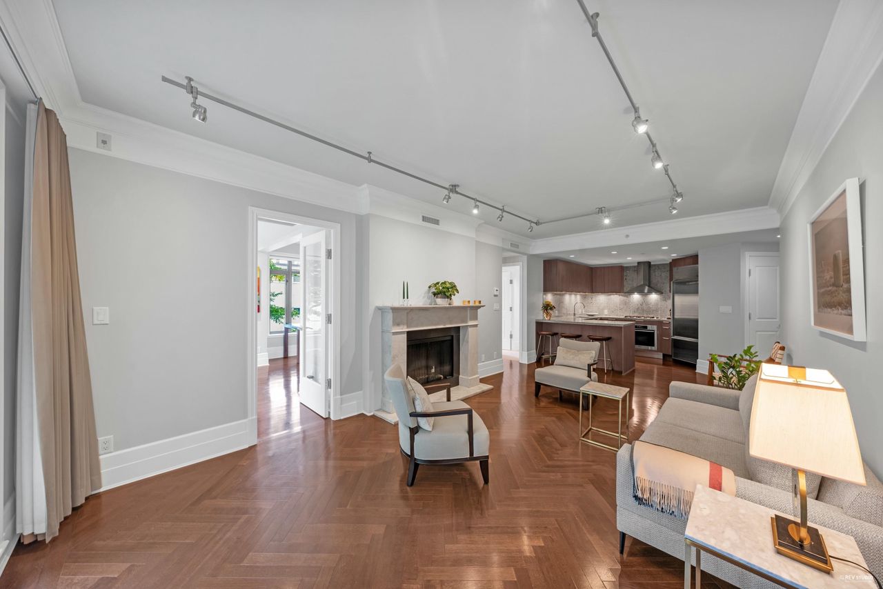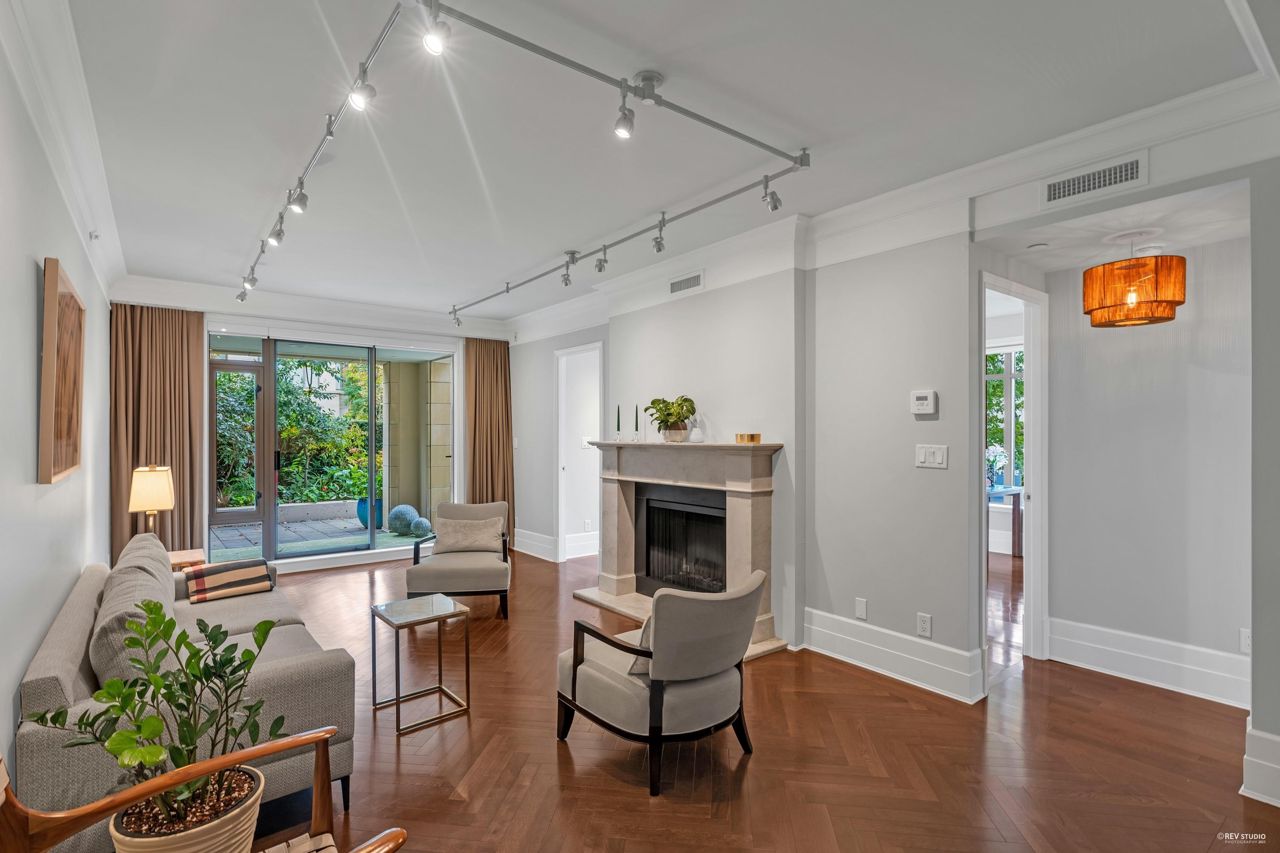 Elegant living at prestigious Waters Edge. Enjoy indoor/outdoor living at this exceptional S/W corner with unique large Private Garden Patio/Terrace (322 Sq ft) home designed by world renowned Robert Stern. Exquisite finishings, high ceilings, oak h/w flooring, solid wood doors, moldings, Euro style Kitchen with subzero fridge, gas range, air con. & fireplace. Originally 2 Bedrooms & Solarium (2nd bedroom & solarium now 1 large flex room, easily changed back). Concierge, impressive Library/Social Lounge, Fitness Centre, Steam/Sauna Spa. Pet friendly, great community & carefree living at wonderfully maintained & landscaped property. Access to Capilano Pacific Trails & public transit. Walk to all conveniences, Park Royal, Ambleside Beach & Seawall. Pleasure to Show!