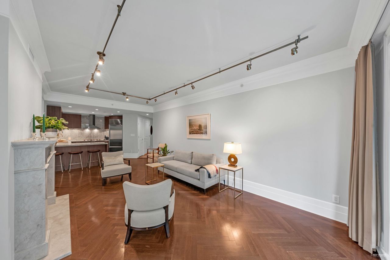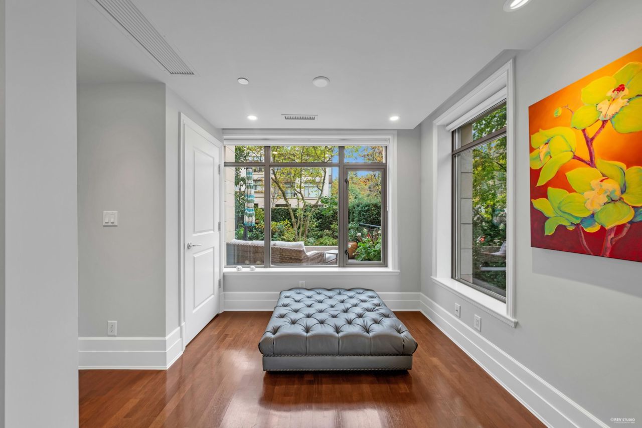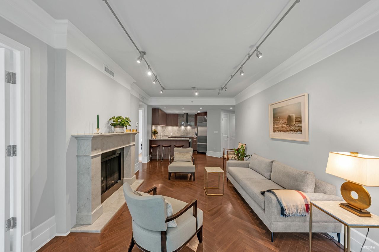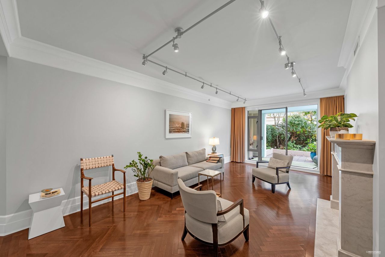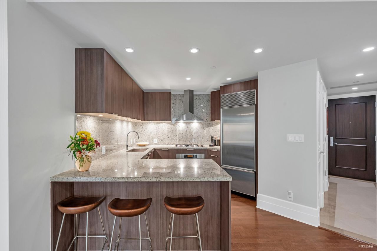 Elegant living at prestigious Waters Edge. Enjoy indoor/outdoor living at this exceptional S/W corner with unique large Private Garden Patio/Terrace (322 Sq ft) home designed by world renowned Robert Stern. Exquisite finishings, high ceilings, oak h/w flooring, solid wood doors, moldings, Euro style Kitchen with subzero fridge, gas range, air con. & fireplace. Originally 2 Bedrooms & Solarium (2nd bedroom & solarium now 1 large flex room, easily changed back). Concierge, impressive Library/Social Lounge, Fitness Centre, Steam/Sauna Spa. Pet friendly, great community & carefree living at wonderfully maintained & landscaped property. Access to Capilano Pacific Trails & public transit. Walk to all conveniences, Park Royal, Ambleside Beach & Seawall. Pleasure to Show!