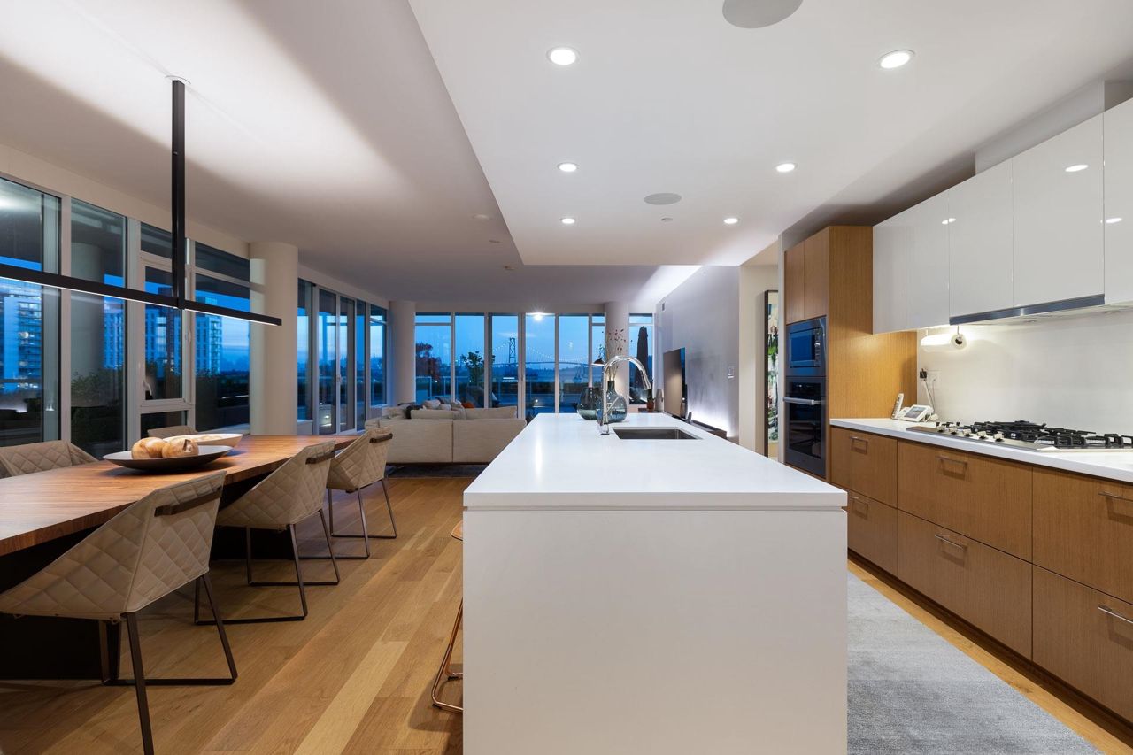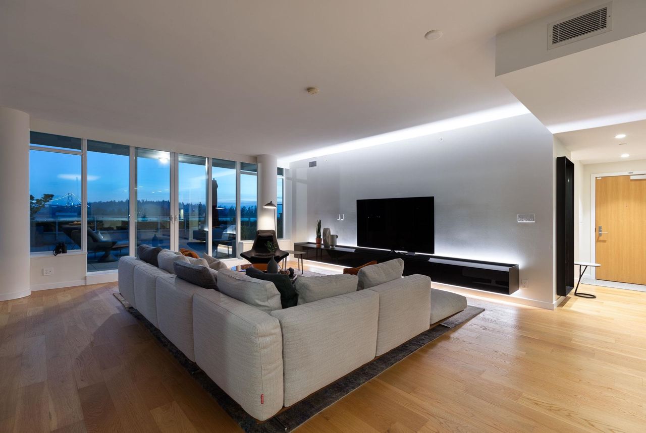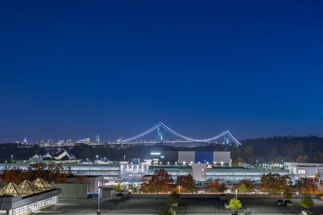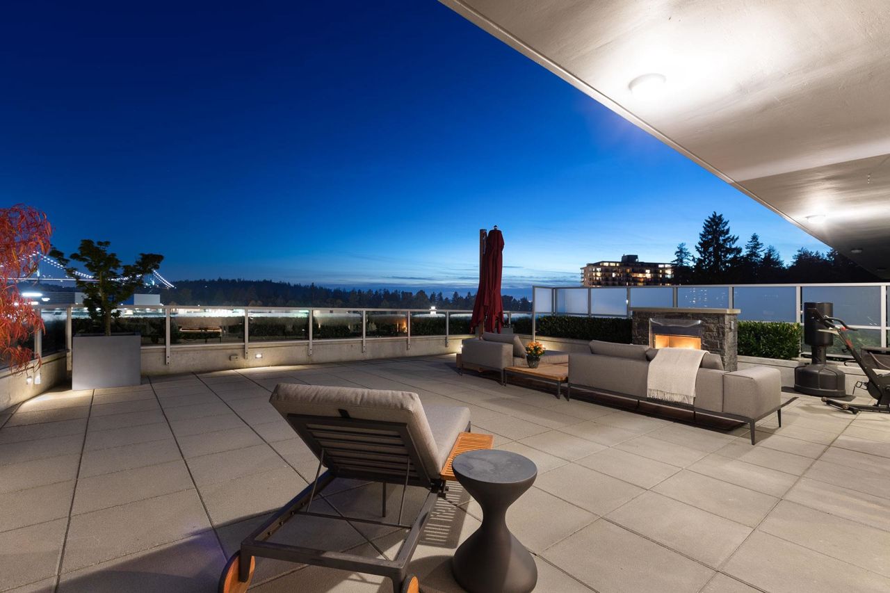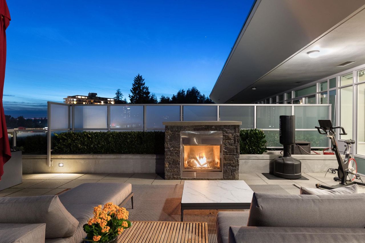 Stunning Sub-Penthouse residence is nothing short of spectacular-captivating views -custom designed interior and an exceptional seamless connection to the partially covered outdoor terrace complete with a gas fireplace and accessible from all rooms. Relaxed open concept contemporary designed kitchen, living and dining areas adorned with huge windows and natural light. Three full bathrooms, private den, two luxurious bedrooms, each ensuited with two walk-ins closets in the master, second bedroom redesigned into a gorgeous custom home office. Additional features include air conditioning, a laundry room, concierge, full gym, private double garage, two lockers and two secure bike lockers. Quick access to downtown or walk to Park Royal this beautiful suite offers an extraordinary !lifestyle!