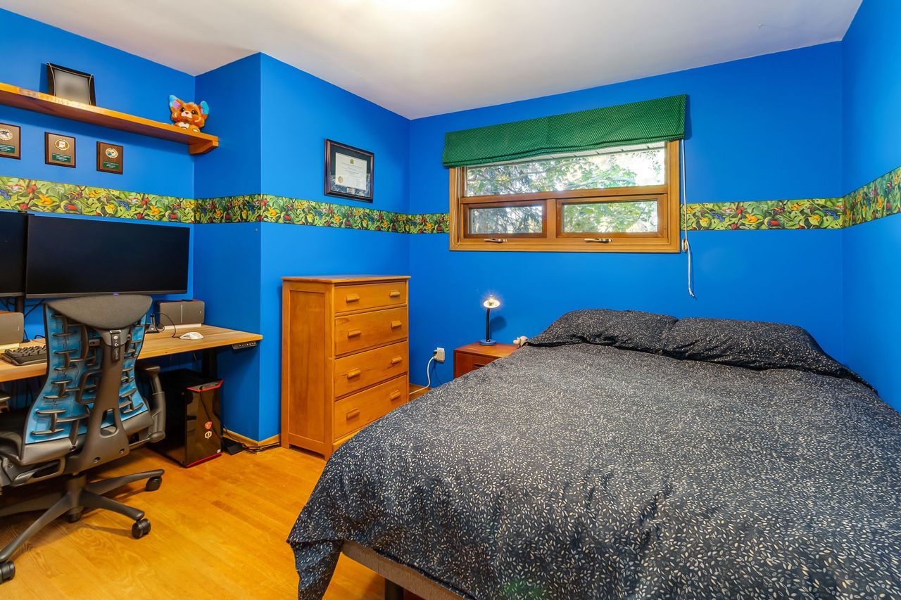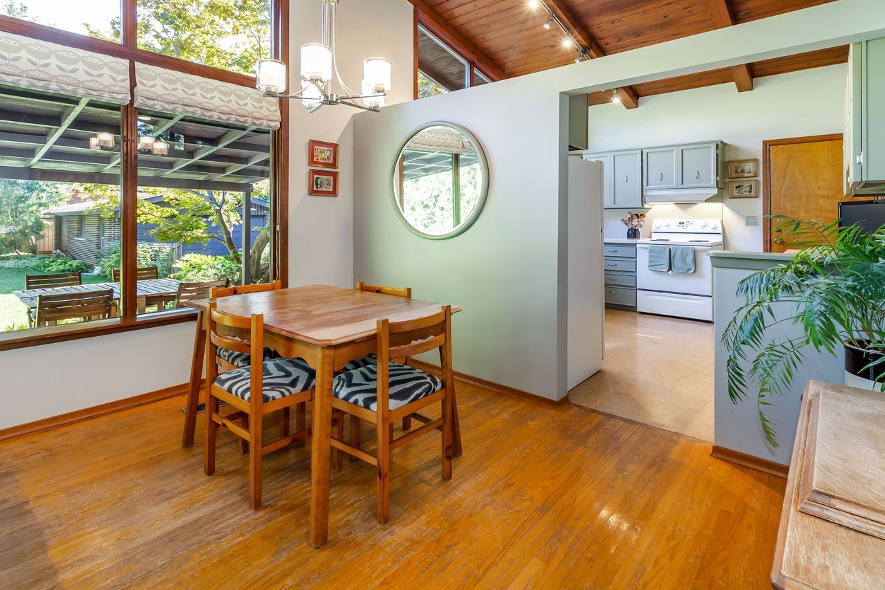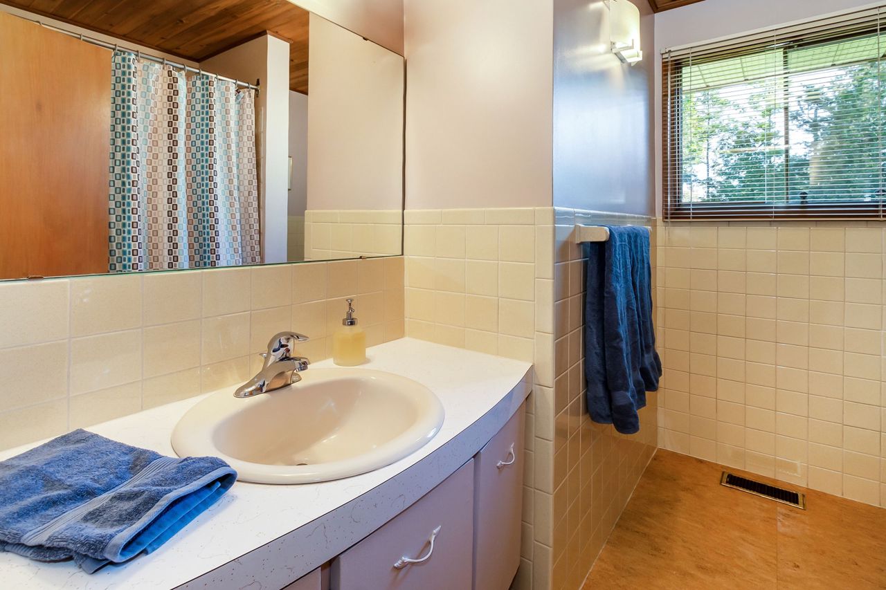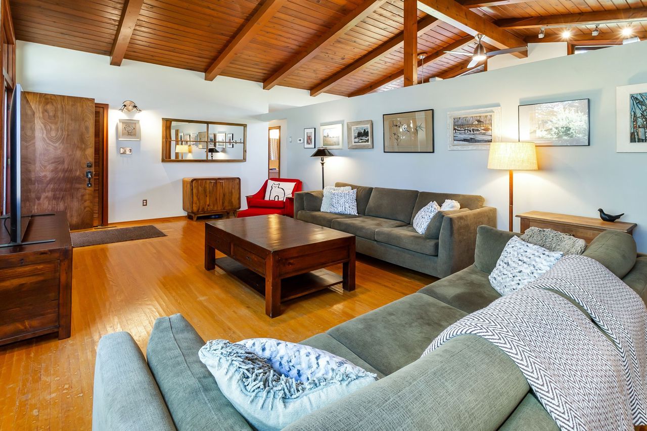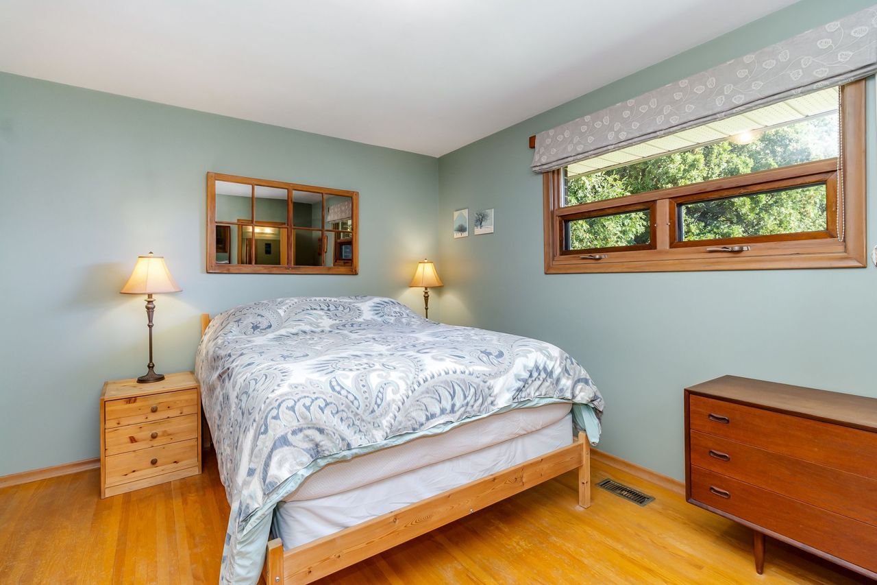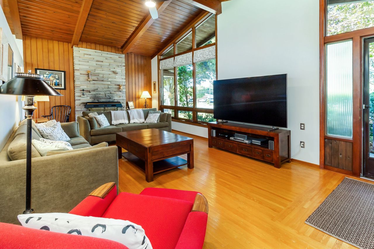 Nestled in the trees on a large 73 x 200 ft lot, this mid-century bungalow is anything but cookie-cutter! Lovingly maintained by the same family since 1986, this home offers loads of original charm. Main floor boasts original hardwood floors, with stunning 12-1/2" vaulted ceilings made from 2 x 6 cedar planks and Fir beams from B.C. Enjoy cold winter nights around the floor to ceiling angelstone fireplace surrounded by large windows that bring the outside in. The kitchen has been updated to fit with that original aesthetic, while offering modern finishes including beautiful quartz counters!. Three good-sized bedrooms provides room for the entire family, & the primary bedroom has a 3-piece ensuite, rare for the era of this home. Lower level has endless possibilities, with wide open spaces, high ceilings & large windows. The additional bathroom & laundry with kitchen appliance hookups, could be easily converted into a lovely in-law suite. Homes with this much character are hard to find!The oversized yard has loads of space for entertaining friends & family. The 28' 8" x18' 10" detached garage is the perfect spot for that car enthusiast or handyman. The long private driveway is ideal for accommodating extra vehicles.