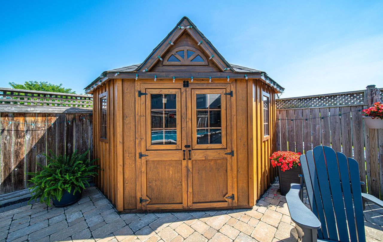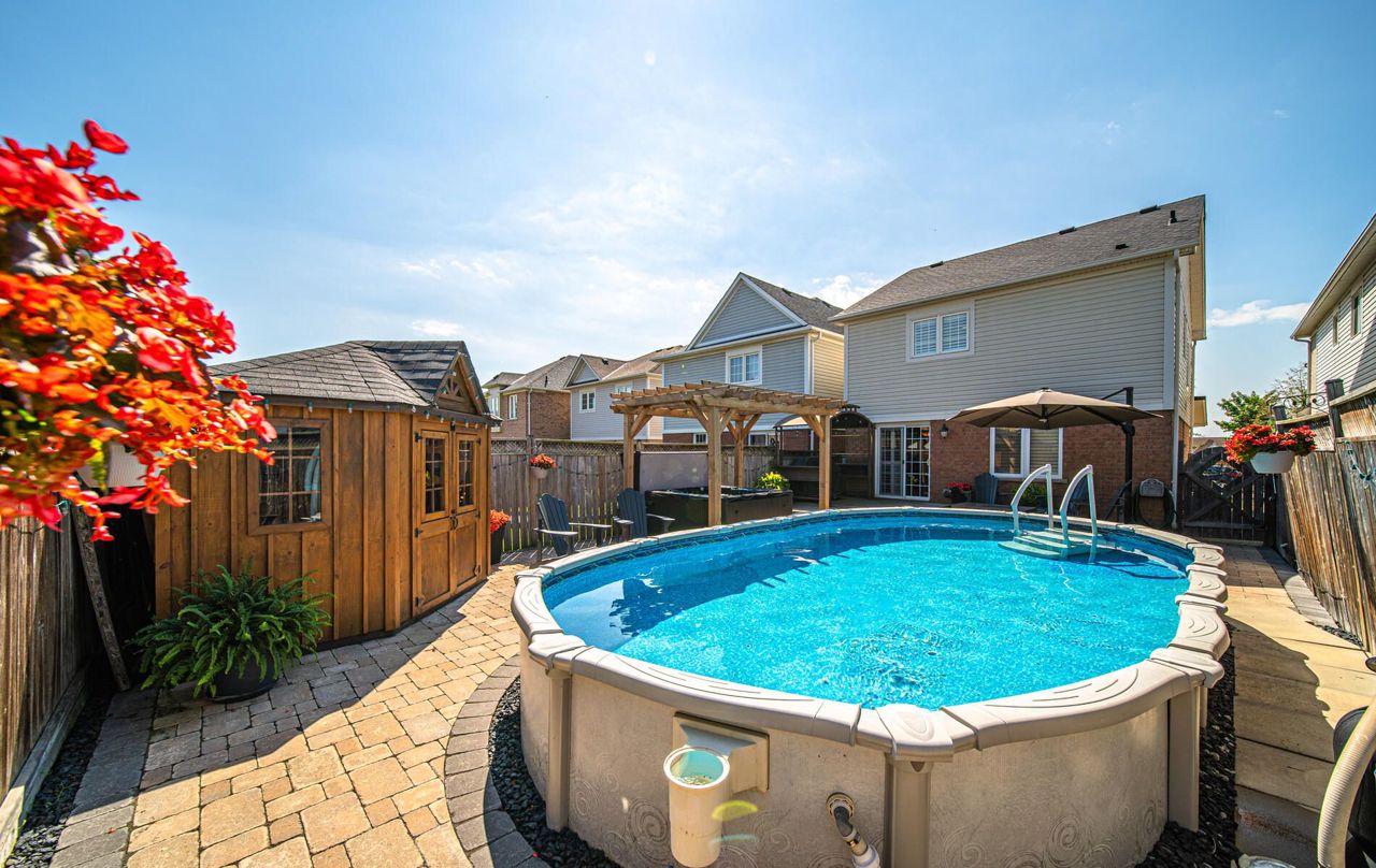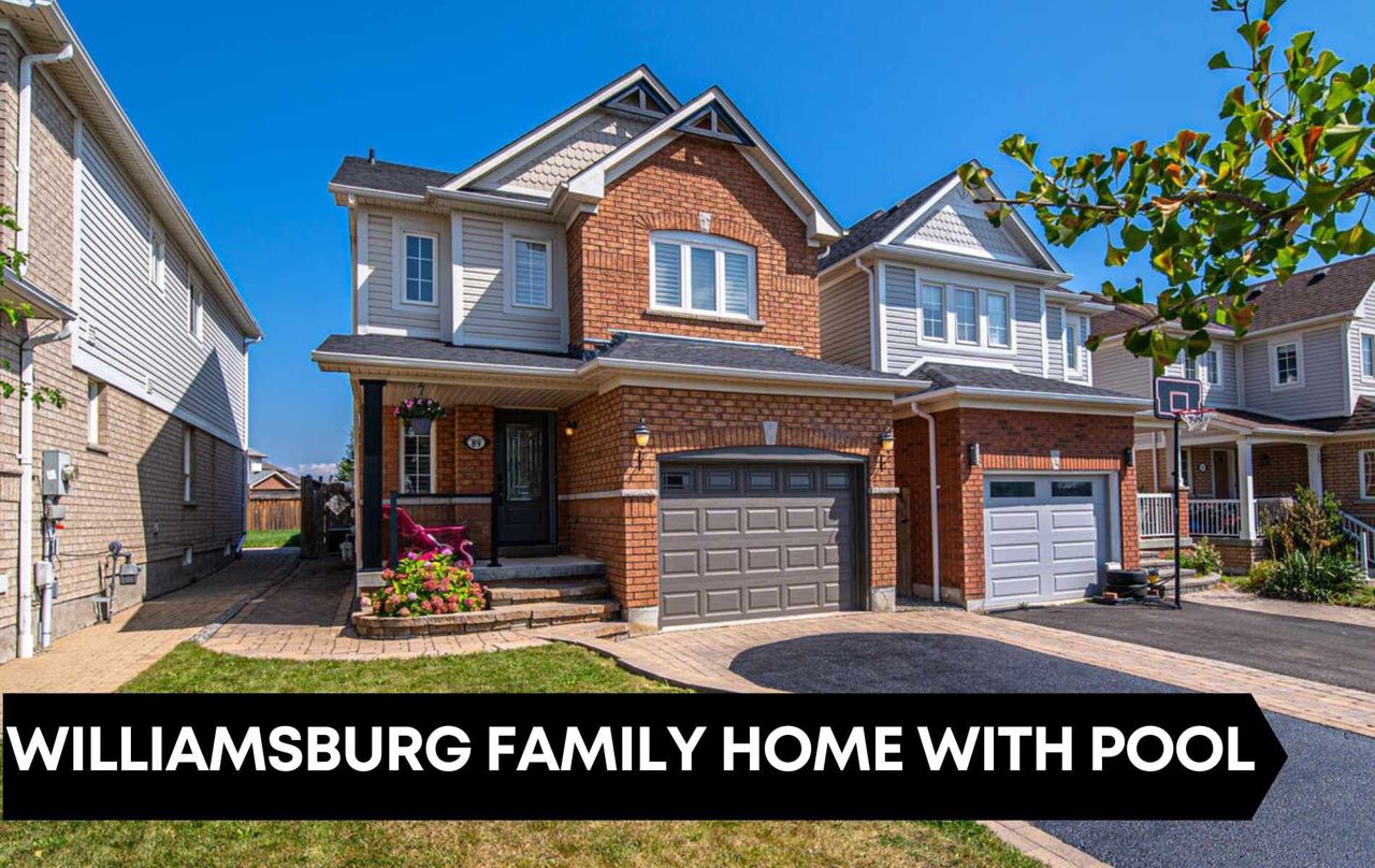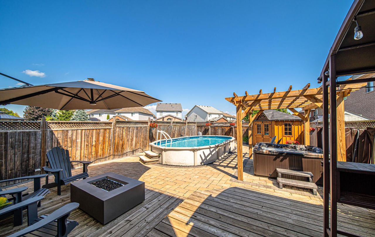 Gorgeous 3 bedroom 2 storey home in highly desirable Williamsburg family neighbourhood. Steps to the Rocketship park and splash pad, great schools and just 5 minutes to Hwy 412 and 407. This updated home features spacious and modern open concept design with California shutters throughout. The kitchen overlooks the family room with electric fireplace and the breakfast area with walk-out to deck. Garage access to main floor, 2 piece powder room and an upgraded laundry room. The upper level showcases 3 well-sized and comfortable bedrooms all with closet organizers. The primary bedroom features an updated 4 piece ensuite bath and walk-in closet. Outside boasts of landscaped backyard, a sunken pool partially above ground and partially in ground, pergola for relaxing or entertaining, and custom shed with power and lights. No are no neighbors directly behind the property, only on the sides.Fridge and freezer in basement Cabinets in basement (white upper and grey bottom) Gazebo over the BBQ ( BBQ is excluded) Nest thermostat
