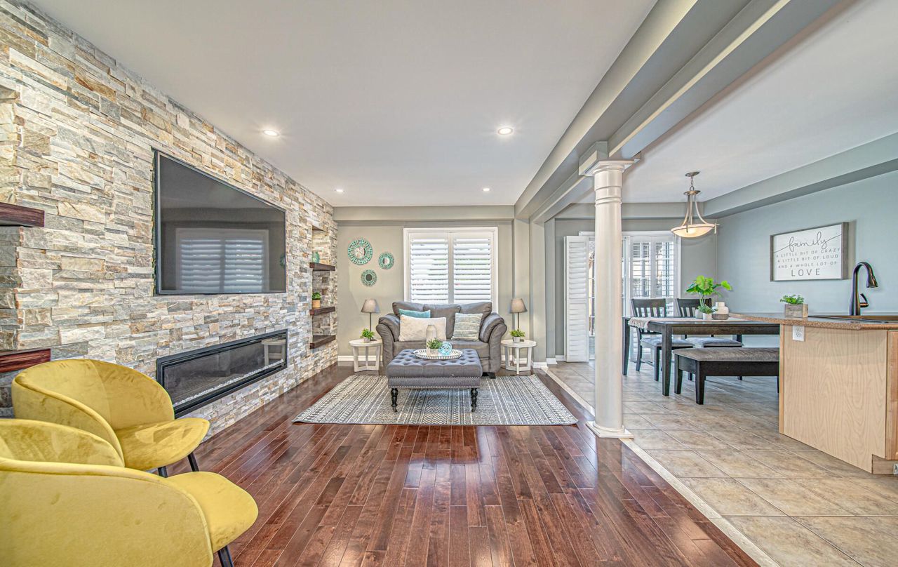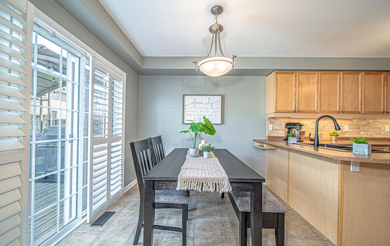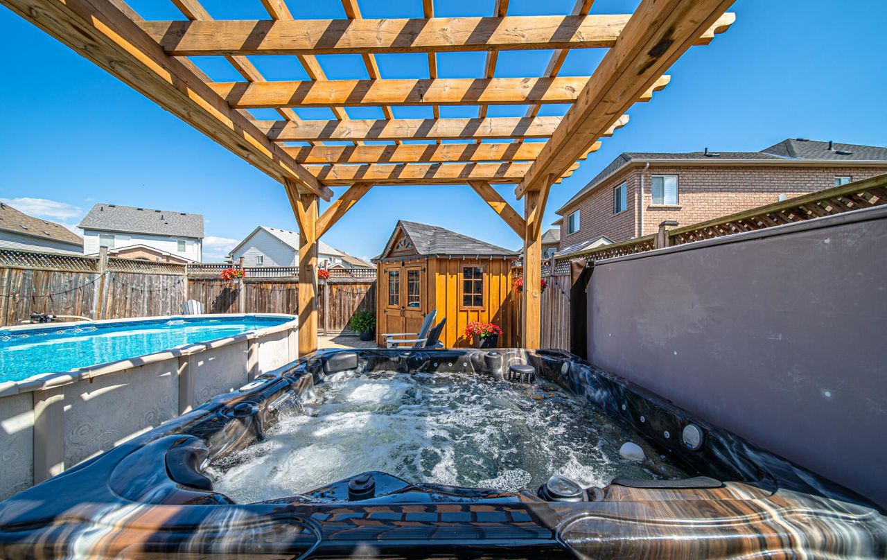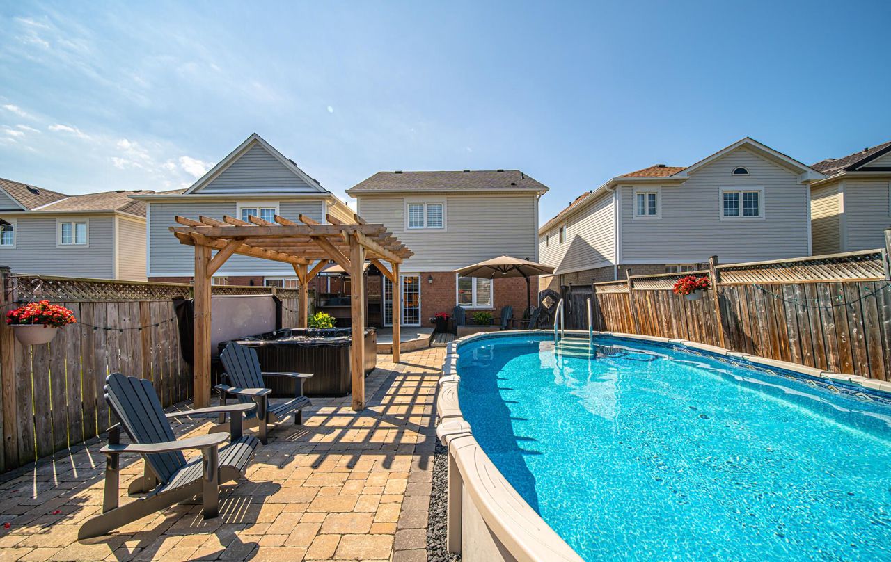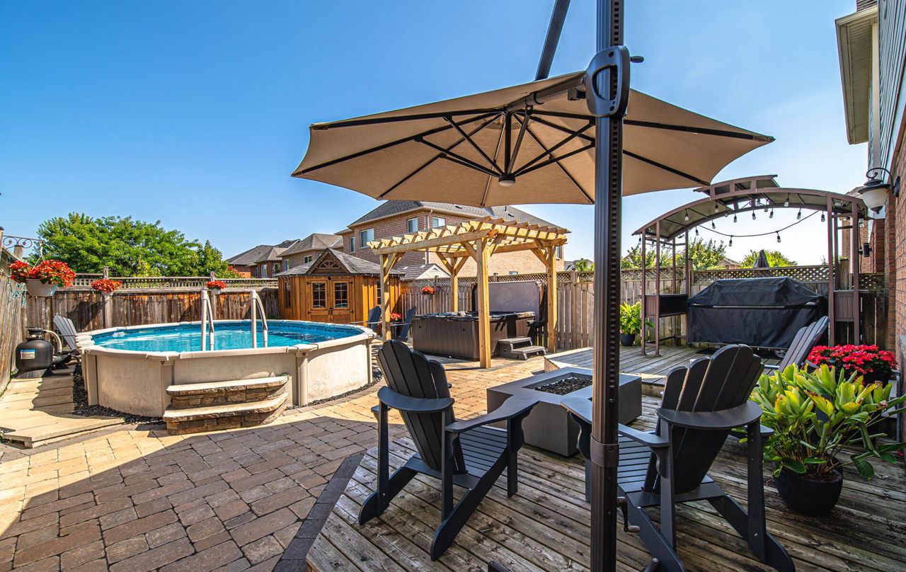 Gorgeous 3 bedroom 2 storey home in highly desirable Williamsburg family neighbourhood. Steps to the Rocketship park and splash pad, great schools and just 5 minutes to Hwy 412 and 407. This updated home features spacious and modern open concept design with California shutters throughout. The kitchen overlooks the family room with electric fireplace and the breakfast area with walk-out to deck. Garage access to main floor, 2 piece powder room and an upgraded laundry room. The upper level showcases 3 well-sized and comfortable bedrooms all with closet organizers. The primary bedroom features an updated 4 piece ensuite bath and walk-in closet. Outside boasts of landscaped backyard, a sunken pool partially above ground and partially in ground, pergola for relaxing or entertaining, and custom shed with power and lights. No are no neighbors directly behind the property, only on the sides.Fridge and freezer in basement Cabinets in basement (white upper and grey bottom) Gazebo over the BBQ ( BBQ is excluded) Nest thermostat