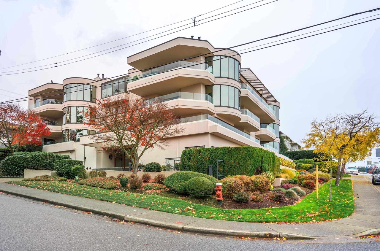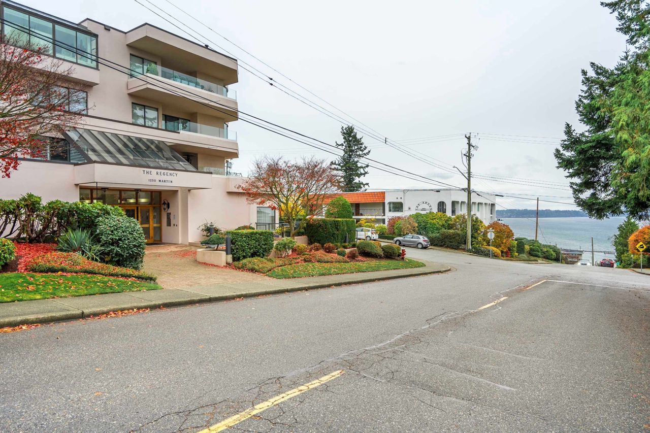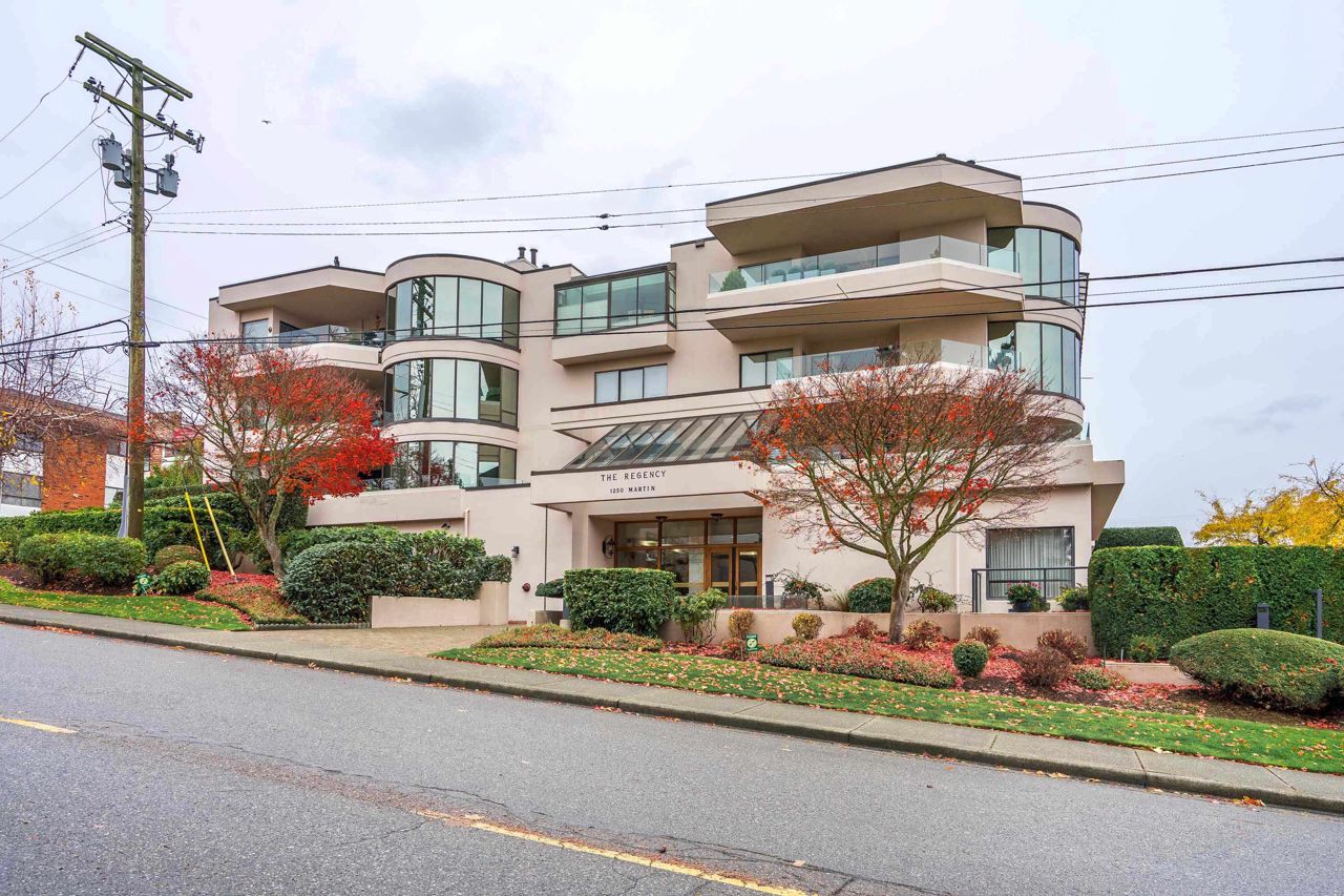 Welcome to The Regency! Rare opportunity to purchase in this fabulous 12 Unit concrete building. This spacious Top Floor Corner home has a partial Ocean View from the Living Room and Balcony. Boasting 1,348 sqft of living space plus a large covered, private balcony. Very bright with lots of natural light. Features a huge Bedroom with Dressing Room/Vanity & Sink, a cozy gas Fireplace in the Living Room, radiant heat throughout and in-suite laundry. Amenities include a Recreation Room & Workshop. Located on a quiet street in a central convenient area, close to shops, restaurants and just a few blocks to White Rock beach.