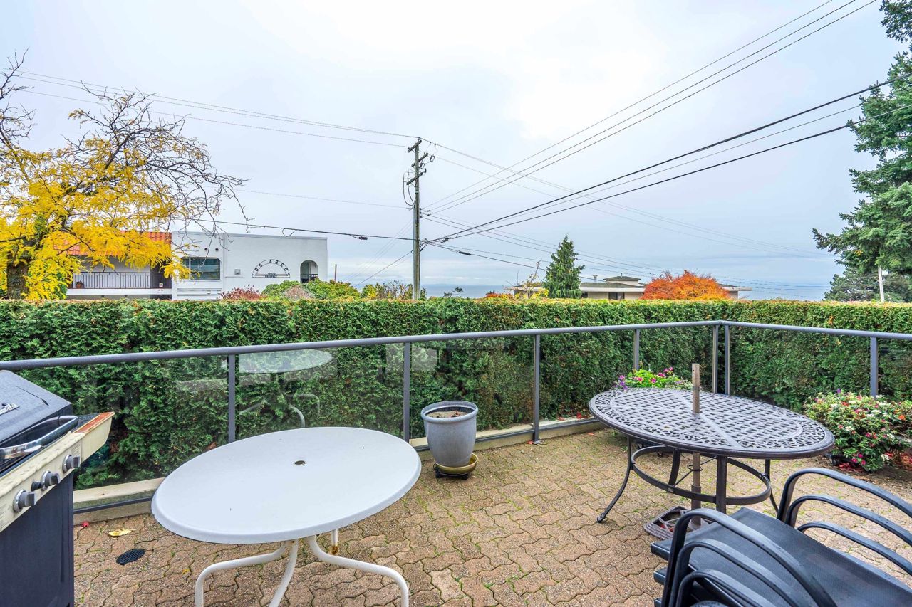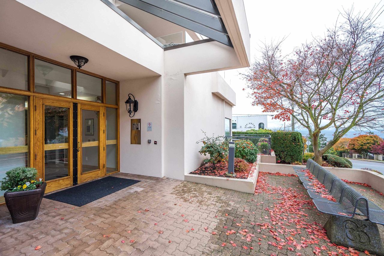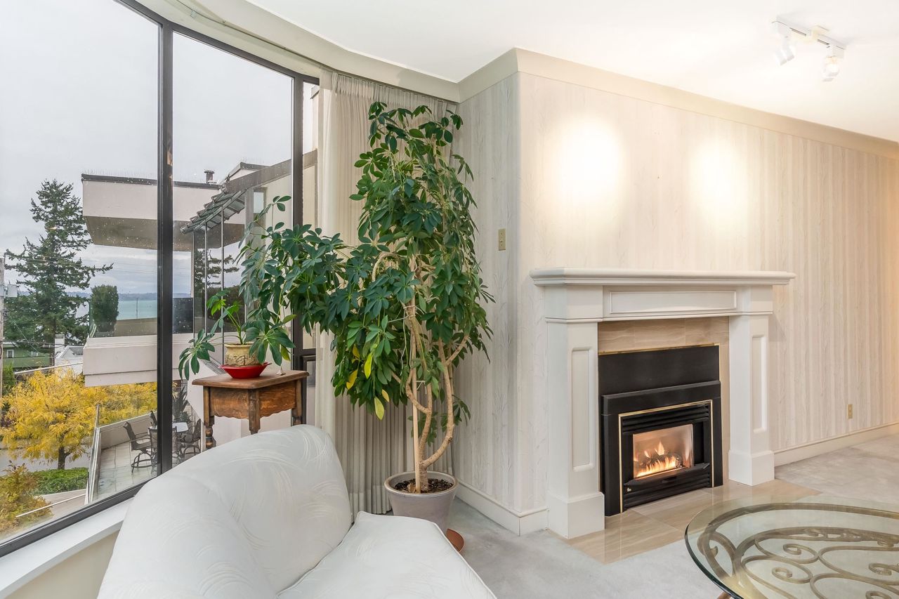 Welcome to The Regency! Rare opportunity to purchase in this fabulous 12 Unit concrete building. This spacious Top Floor Corner home has a partial Ocean View from the Living Room and Balcony. Boasting 1,348 sqft of living space plus a large covered, private balcony. Very bright with lots of natural light. Features a huge Bedroom with Dressing Room/Vanity & Sink, a cozy gas Fireplace in the Living Room, radiant heat throughout and in-suite laundry. Amenities include a Recreation Room & Workshop. Located on a quiet street in a central convenient area, close to shops, restaurants and just a few blocks to White Rock beach.