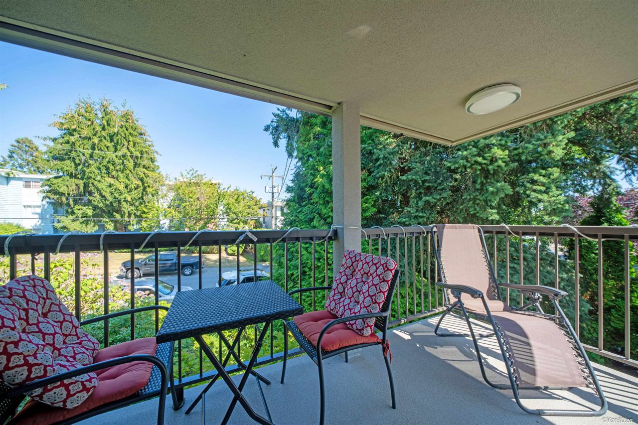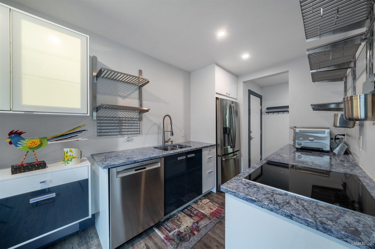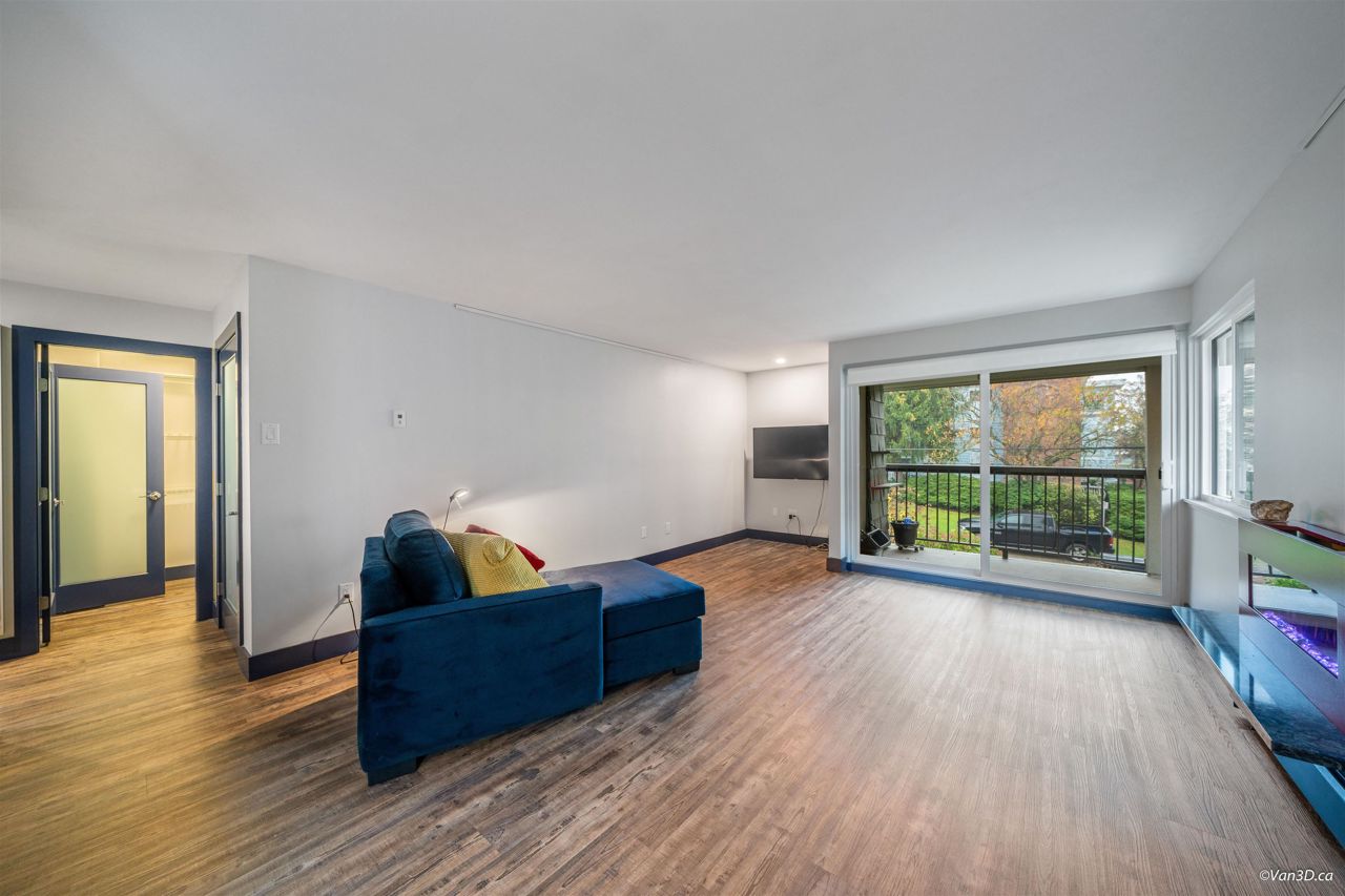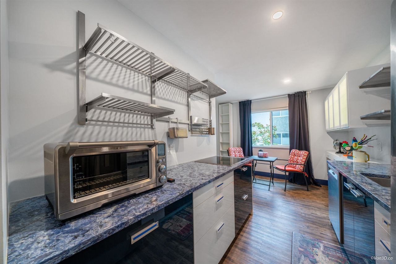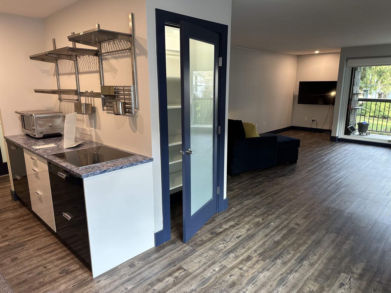 Complete quality renovation, bright S/E corner, white ceilings & off-white walls w/blue trim. Qualified/licensed trades conducted all work. Featuring 829 sqft. of living space, an outdoor corner balcony with a treed view & some ocean view in winter. Attention to detail and quality workmanship are evident. Vinyl plank flooring, smooth ceilings with pot lighting. Enjoy a walk-in glass steam shower; all interior custom doors have tinted glass fillers. Well-run boutique 17-unit strata, with a new central boiler, guest room, and main floor new laundry facility. Underground parking stall equipped for EV + storage locker & workshop. Pleasant & well-maintained building in a central location for all essentials. Walk to 5-Corners + Thrift Ave shopping & cafes. No age restrictions and pet-friendly!