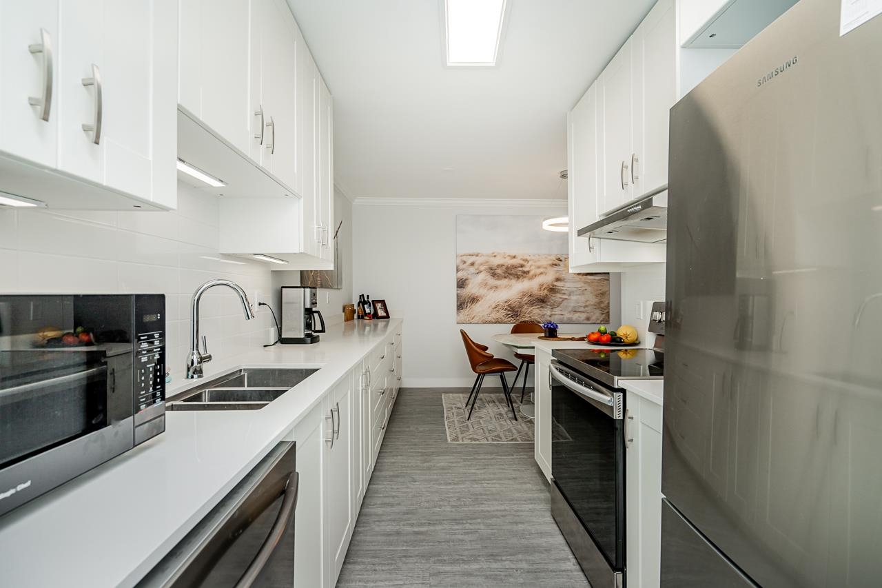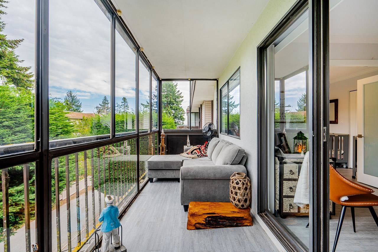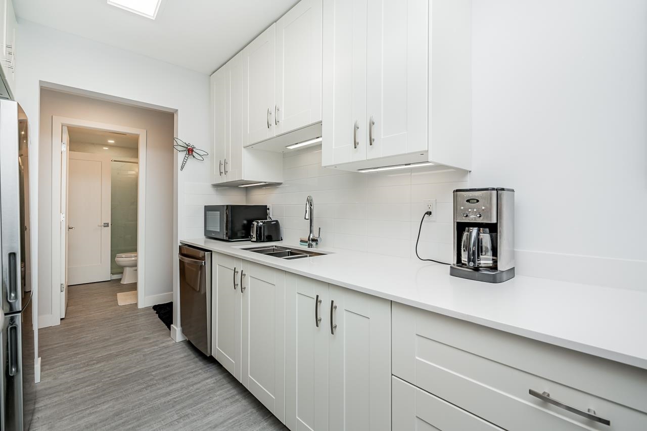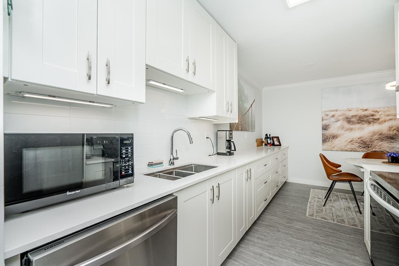 Welcome to The West Winds on Martin Street! This top-floor unit is situated on the quiet side of the building and has undergone a stunning remodel! The kitchen features quartz countertops, new white sharker cabinetry, high end stainless steel appliances and a deep sink adding style and function. Other features include vinyl plank flooring that extends throughout complimented by new blinds and crown moulding. Enjoy your morning coffee on the enclosed balcony that is not included in the square footage. This unit offers 1 parking stall and 1 storage locker. Close to White rock town centre and only a 14-minute walk to the beach. Call today for your private viewing! 55+ Age restricted building.