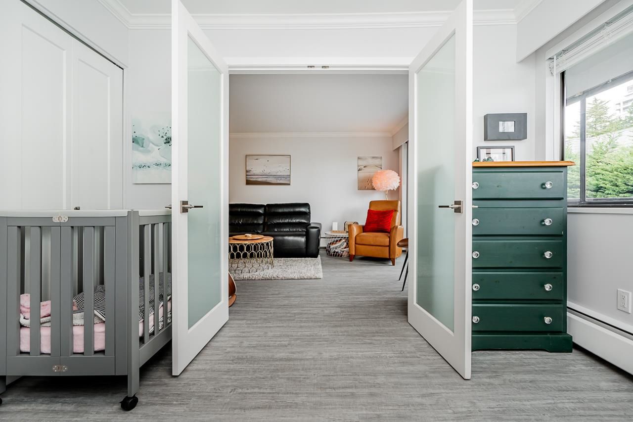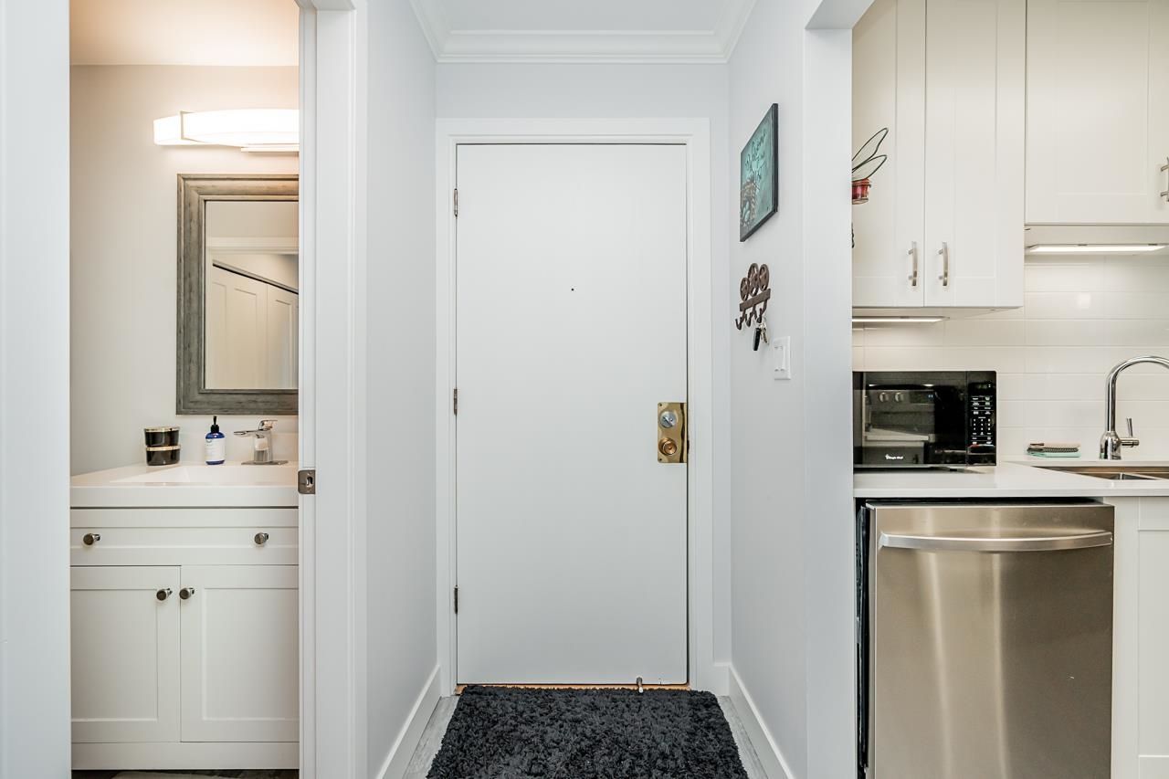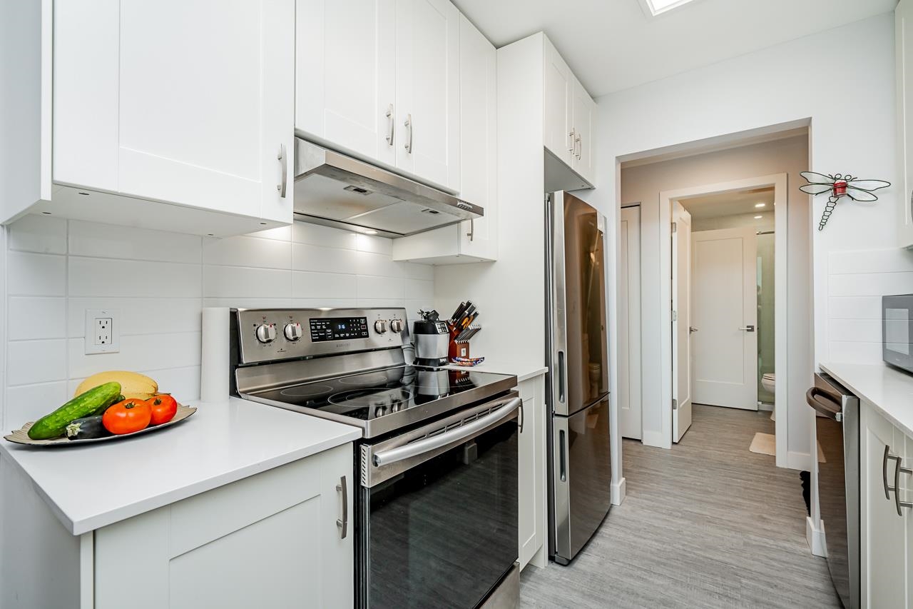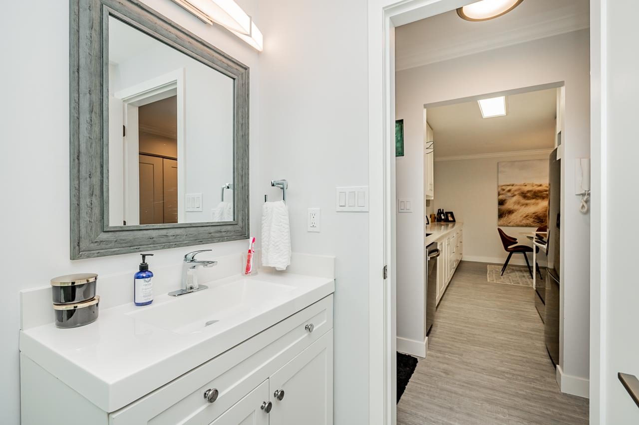 Welcome to The West Winds on Martin Street! This top-floor unit is situated on the quiet side of the building and has undergone a stunning remodel! The kitchen features quartz countertops, new white sharker cabinetry, high end stainless steel appliances and a deep sink adding style and function. Other features include vinyl plank flooring that extends throughout complimented by new blinds and crown moulding. Enjoy your morning coffee on the enclosed balcony that is not included in the square footage. This unit offers 1 parking stall and 1 storage locker. Close to White rock town centre and only a 14-minute walk to the beach. Call today for your private viewing! 55+ Age restricted building.