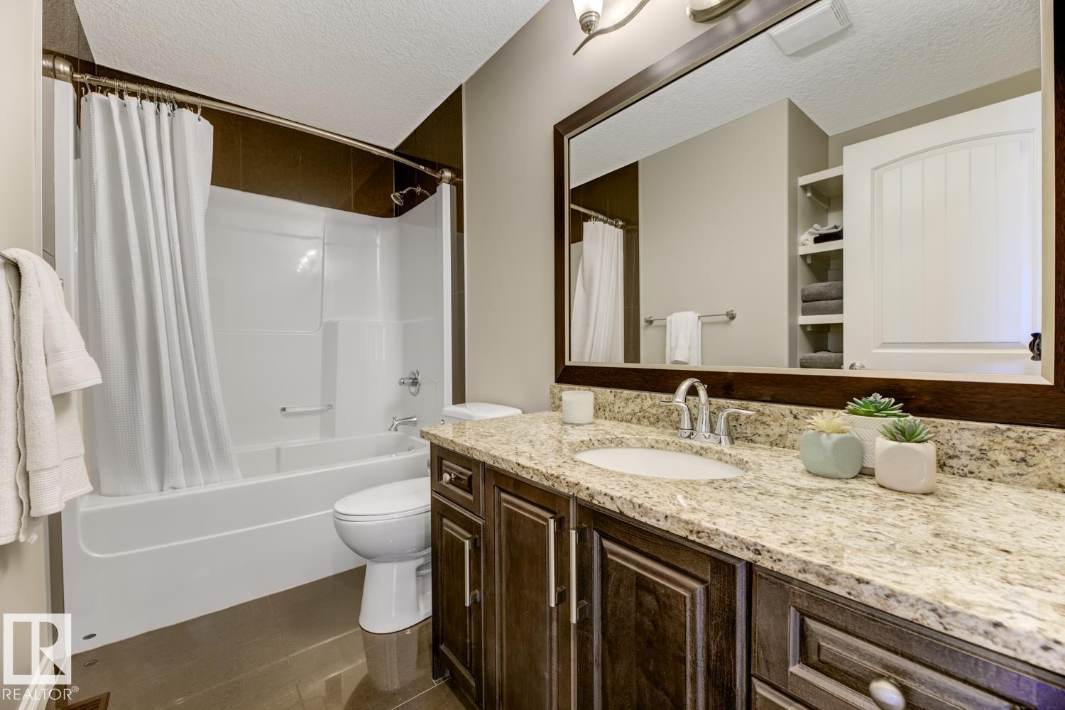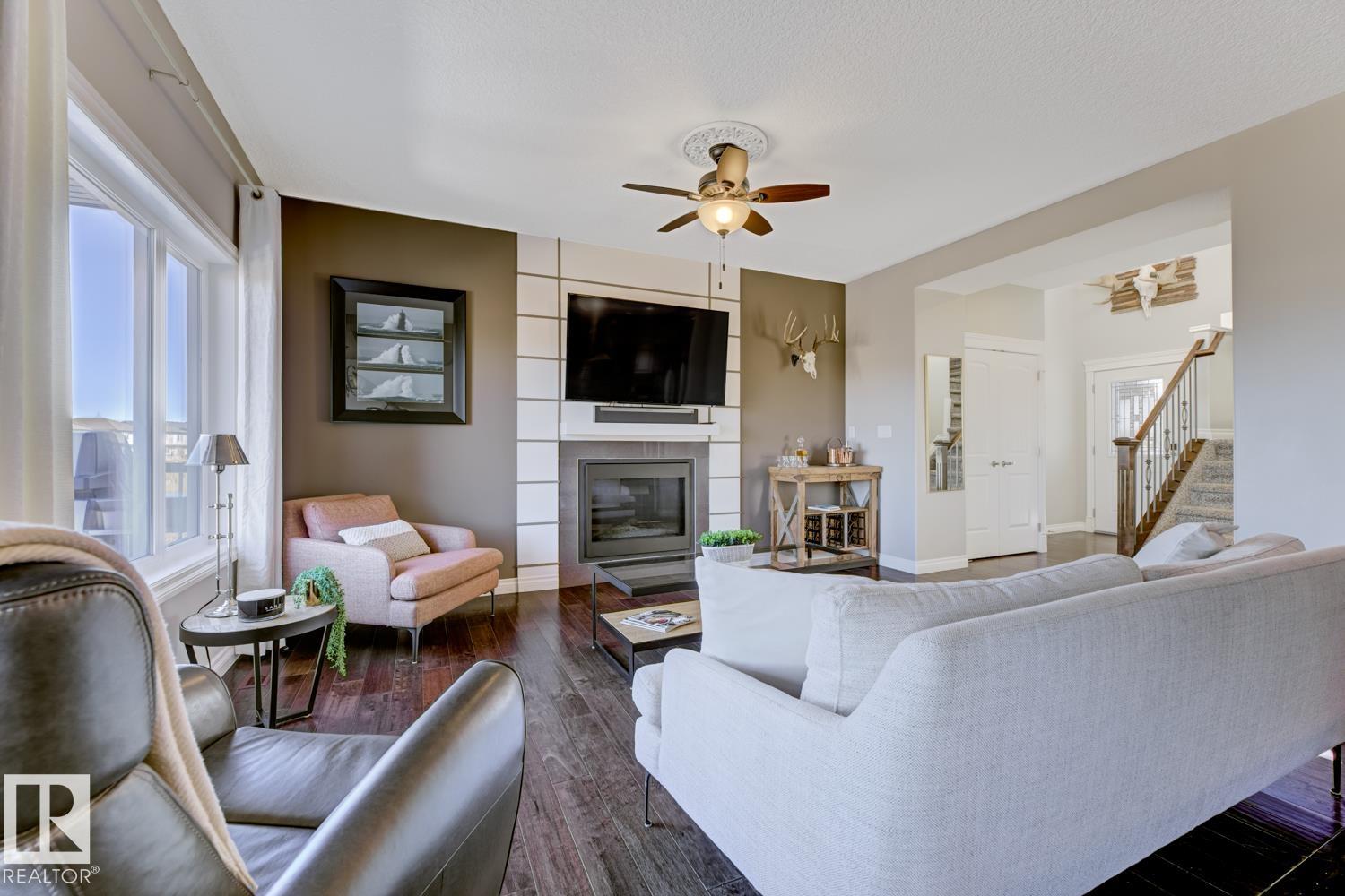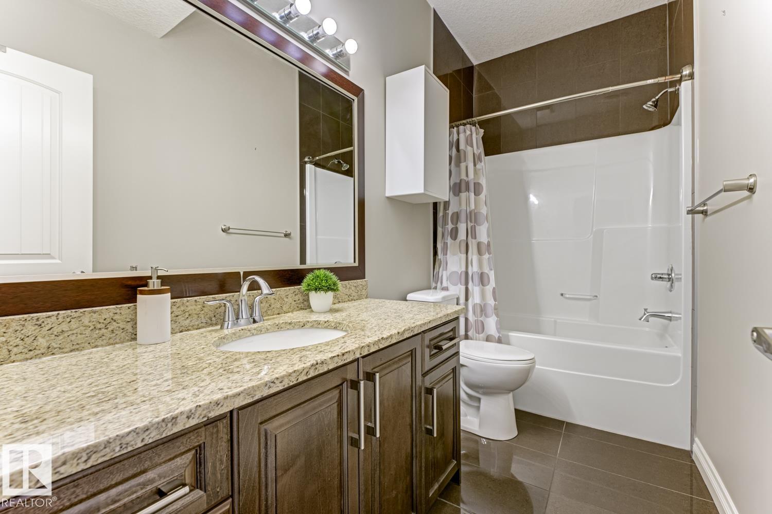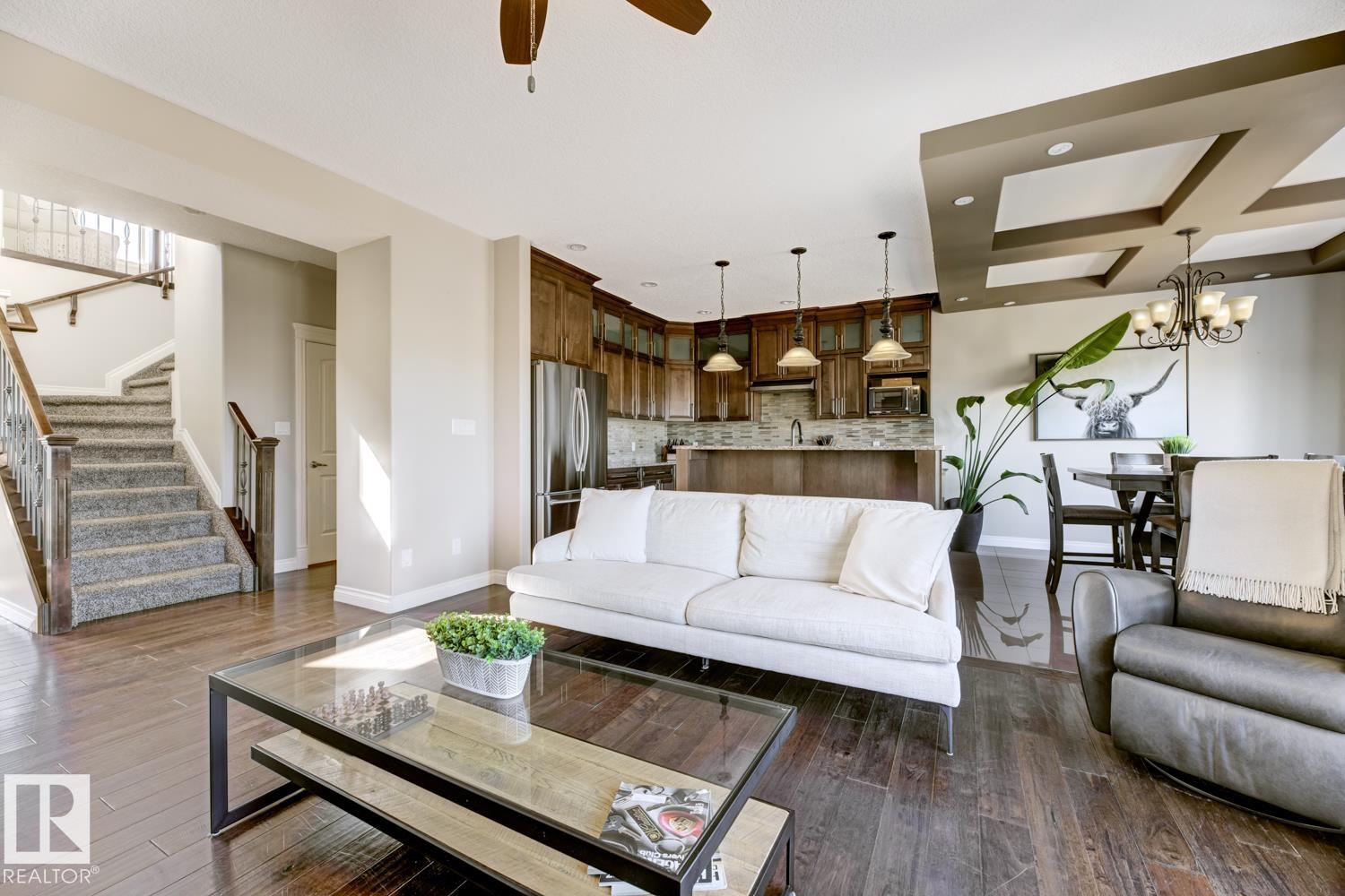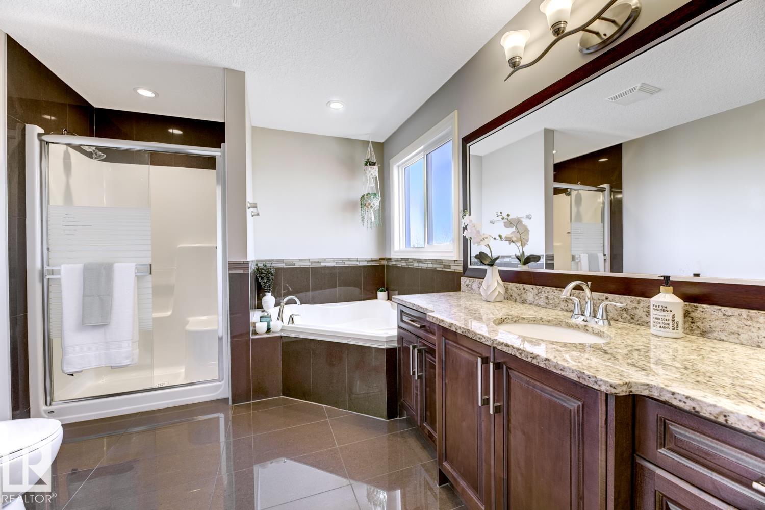 Stunning walkout home backing onto green space. This 1858 sq.ft. two storey features 4 bedrooms and 3.5 baths with a fully finished walkout basement. The main floor offers hardwood floors, a bright dining area, and a high end kitchen with full height cabinets and generous prep space. Enjoy peaceful views from your deck overlooking the greenbelt. Upstairs includes a vaulted bonus room and three large bedrooms. The primary suite has a walk in closet and a 4 piece ensuite with a corner soaker tub. The professionally finished basement includes a fourth bedroom, full bathroom, and spacious family room that opens to the patio and fully fenced yard. Other features include central air conditioning and an oversized 23x23 attached garage. Move in ready and located in a beautiful setting with no rear neighbors. A perfect family home in a sought after location.
