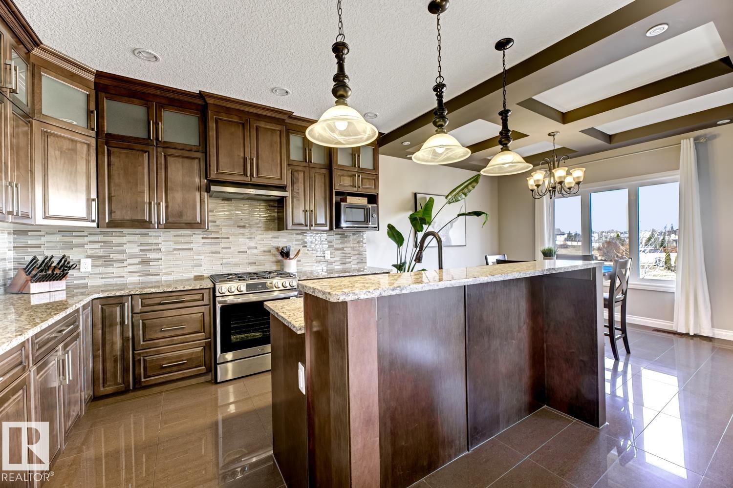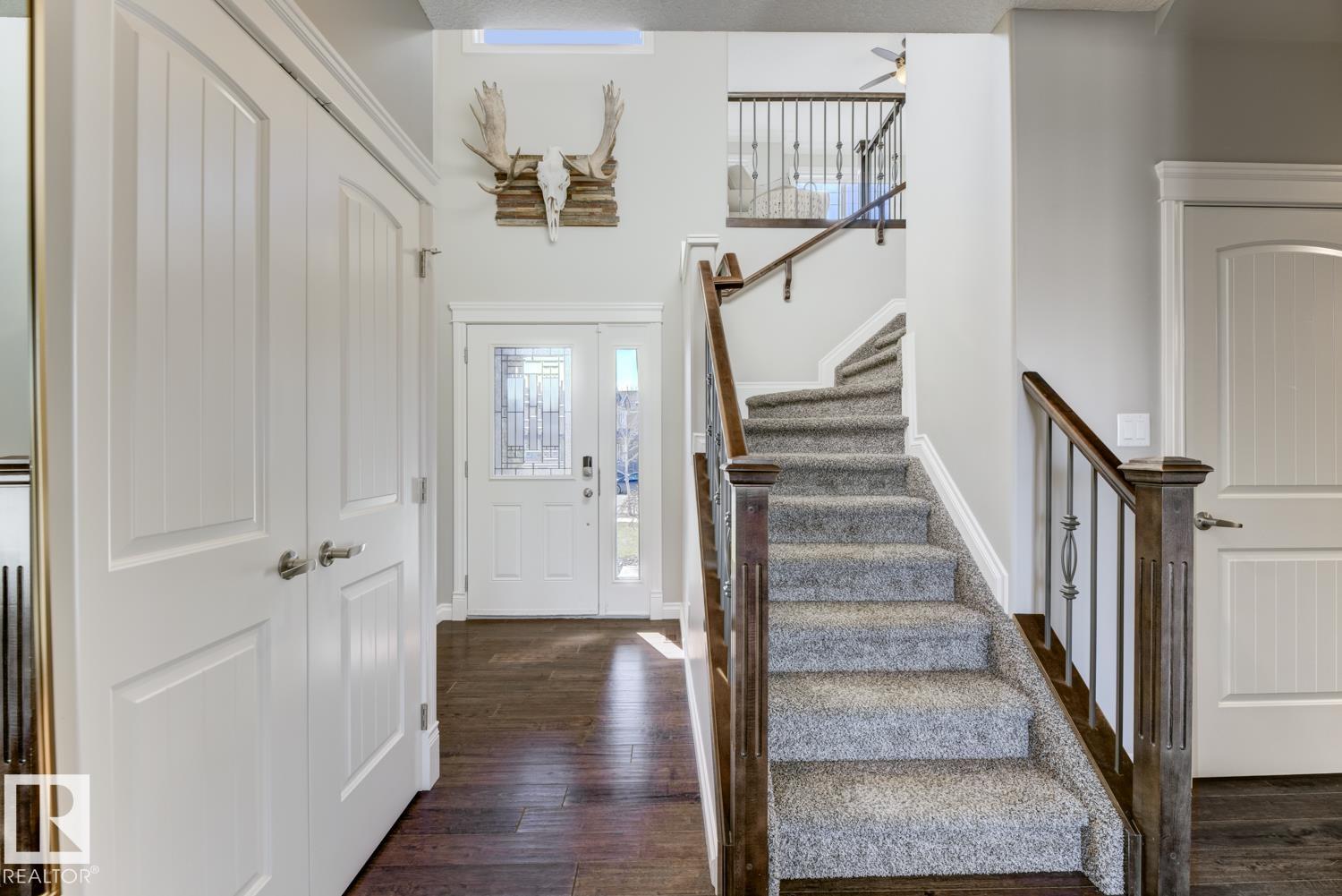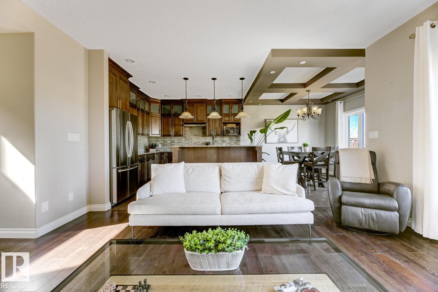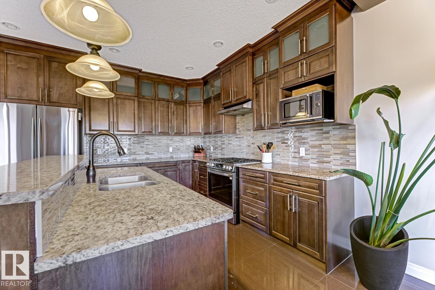 Stunning walkout home backing onto green space. This 1858 sq.ft. two storey features 4 bedrooms and 3.5 baths with a fully finished walkout basement. The main floor offers hardwood floors, a bright dining area, and a high end kitchen with full height cabinets and generous prep space. Enjoy peaceful views from your deck overlooking the greenbelt. Upstairs includes a vaulted bonus room and three large bedrooms. The primary suite has a walk in closet and a 4 piece ensuite with a corner soaker tub. The professionally finished basement includes a fourth bedroom, full bathroom, and spacious family room that opens to the patio and fully fenced yard. Other features include central air conditioning and an oversized 23x23 attached garage. Move in ready and located in a beautiful setting with no rear neighbors. A perfect family home in a sought after location.
