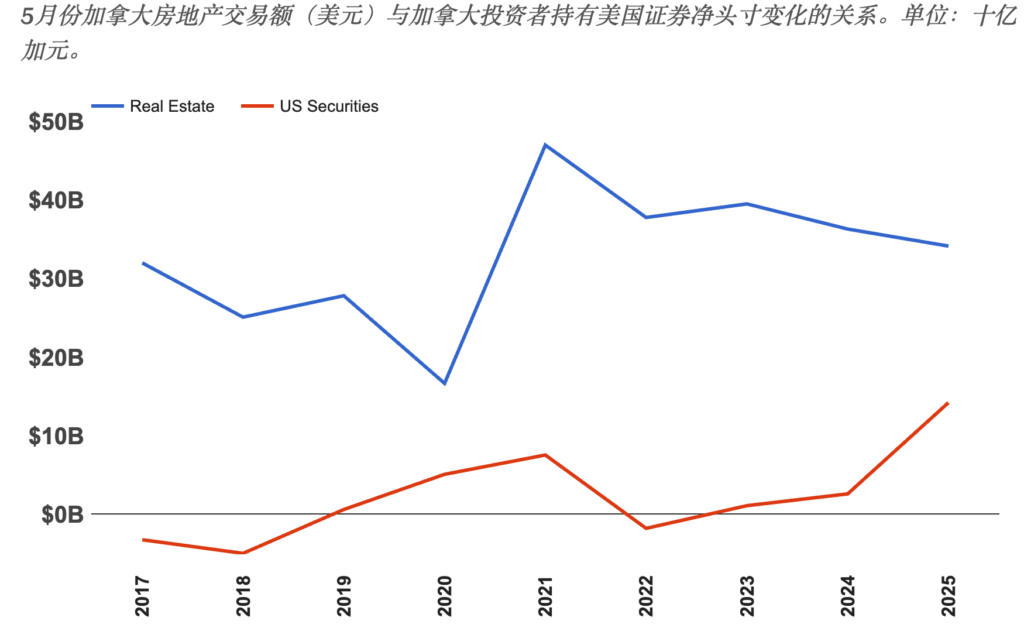 这是自1987年以来月度净买入美股第六高的纪录,且其中大多数发生在过去两年。在2020年之前,加拿大人通常会在市场波动时撤出美股,并将资金重新投入本国房地产,可如今这一趋势已彻底逆转。