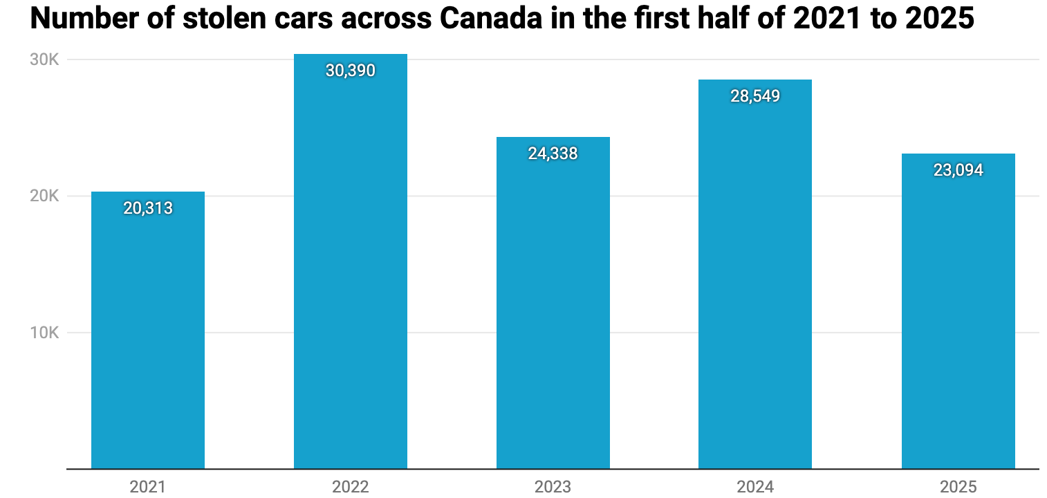 一份最新报告显示,2025年上半年,加拿大全国汽车盗窃案件较去年同期下降19%。这是自疫情期间盗窃潮爆发以来首次出现的显著下降趋势,安大略省和魁北克省的降幅尤为突出,分别为25.9%和22%。