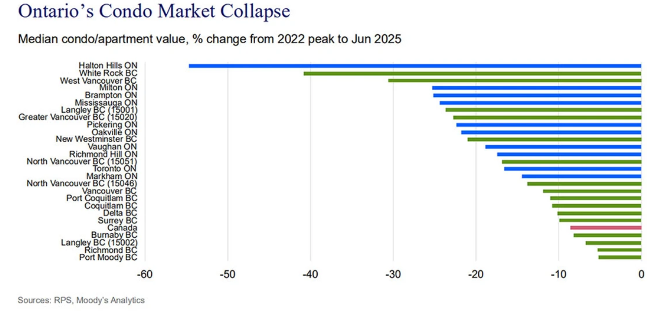 根据穆迪分析公司(Moody’s Analytics)最新报告,安省的哈尔顿山(Halton Hills)等多伦多周边社区的公寓房价,从市场高点至今已暴跌超过50%。布兰普顿、密西沙加和奥克维尔也出现了远高于多伦多市区的跌幅。