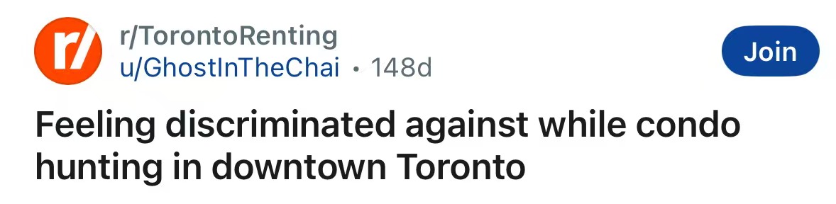 文章来源:https://www.reddit.com/r/TorontoRenting/comments/1joy8cj/feeling_discriminated_against_while_condo_hunting/