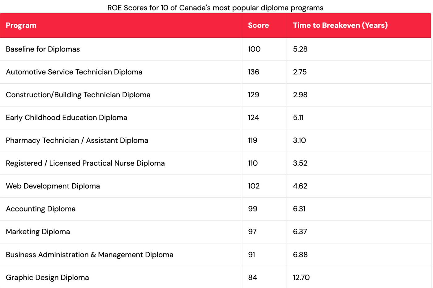 报告显示,回报率最高的文凭课程是 汽车服务技师,得分 136,平均只需 2.75 年即可收支平衡。