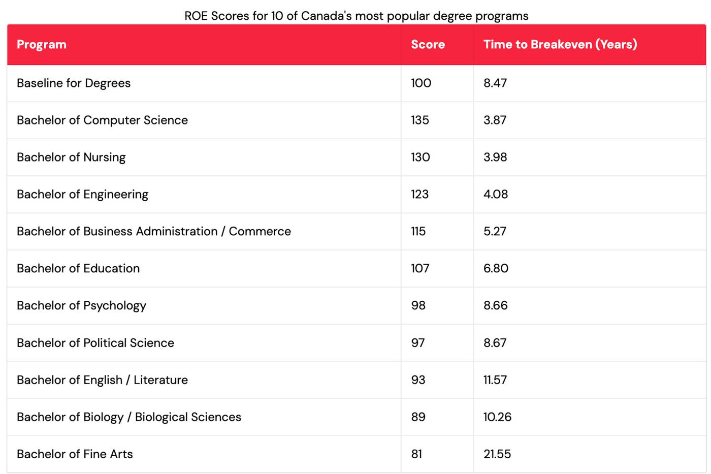 相反,加拿大一些热门学位,如心理学、政治学、生物学、英语,往往需要继续深造才能在就业市场获得优势,因此收支平衡时间通常超过 6 年。