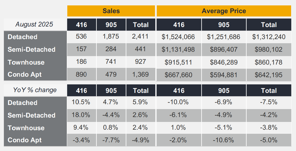 多伦多地区房地产委员会(TRREB)最新报告显示,2025 年8月大多伦多地区(GTA)房屋销量同比小幅上升,而房源库存增长更快,令买家从中受益。由于各细分市场选择增多,平均售价继续承压下行。