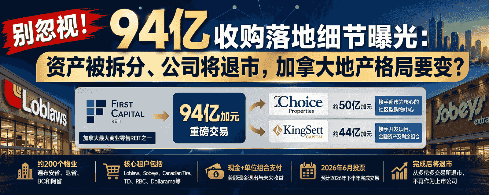 加拿大今年最重磅的地产交易之一,终于披露完整结构。First Capital REIT 已同意被收购,总金额高达94亿加元,买方为 KingSett Capital 与 Choice Properties REIT。这不仅是一次大额交易,更是一场“拆分式收购”,直接改变资产归属与市场格局。