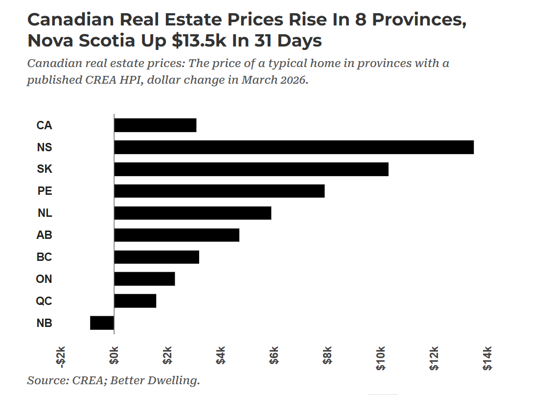 加拿大房地产销售可能最多只是不温不火,但楼市的回调似乎被严重夸大了。加拿大房地产协会报告称,3月房价上涨0.5%(+3,100加元)至664,400加元。深入查看各省的房价指数发现,上个月所有省份中只有一个省份的房价出现下跌。新斯科舍省甚至在短短31天内出现了令人难以置信的五位数价格上涨。尽管全国房价显示出显著回调,但实际上只有两个省份出现了有意义的下跌。