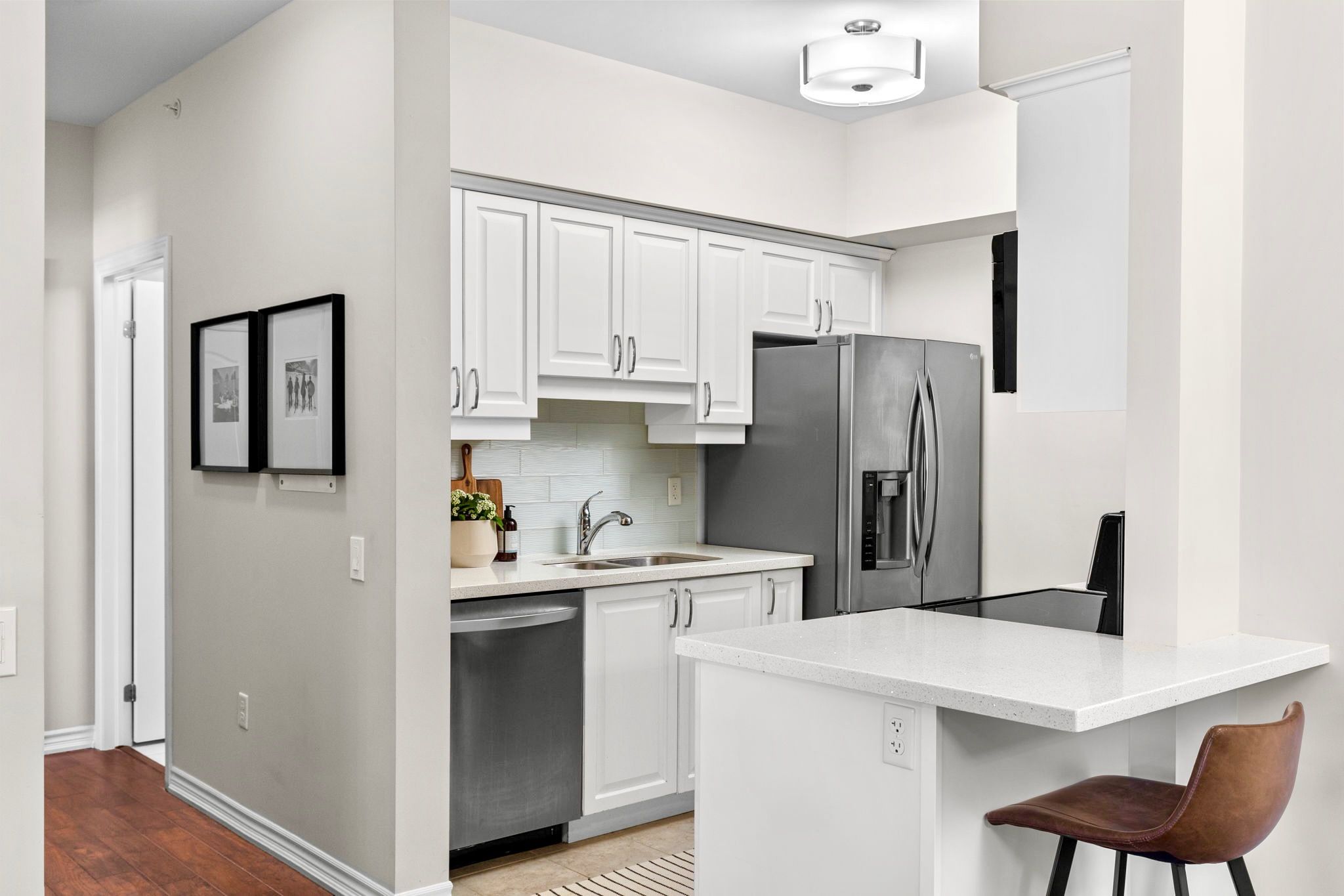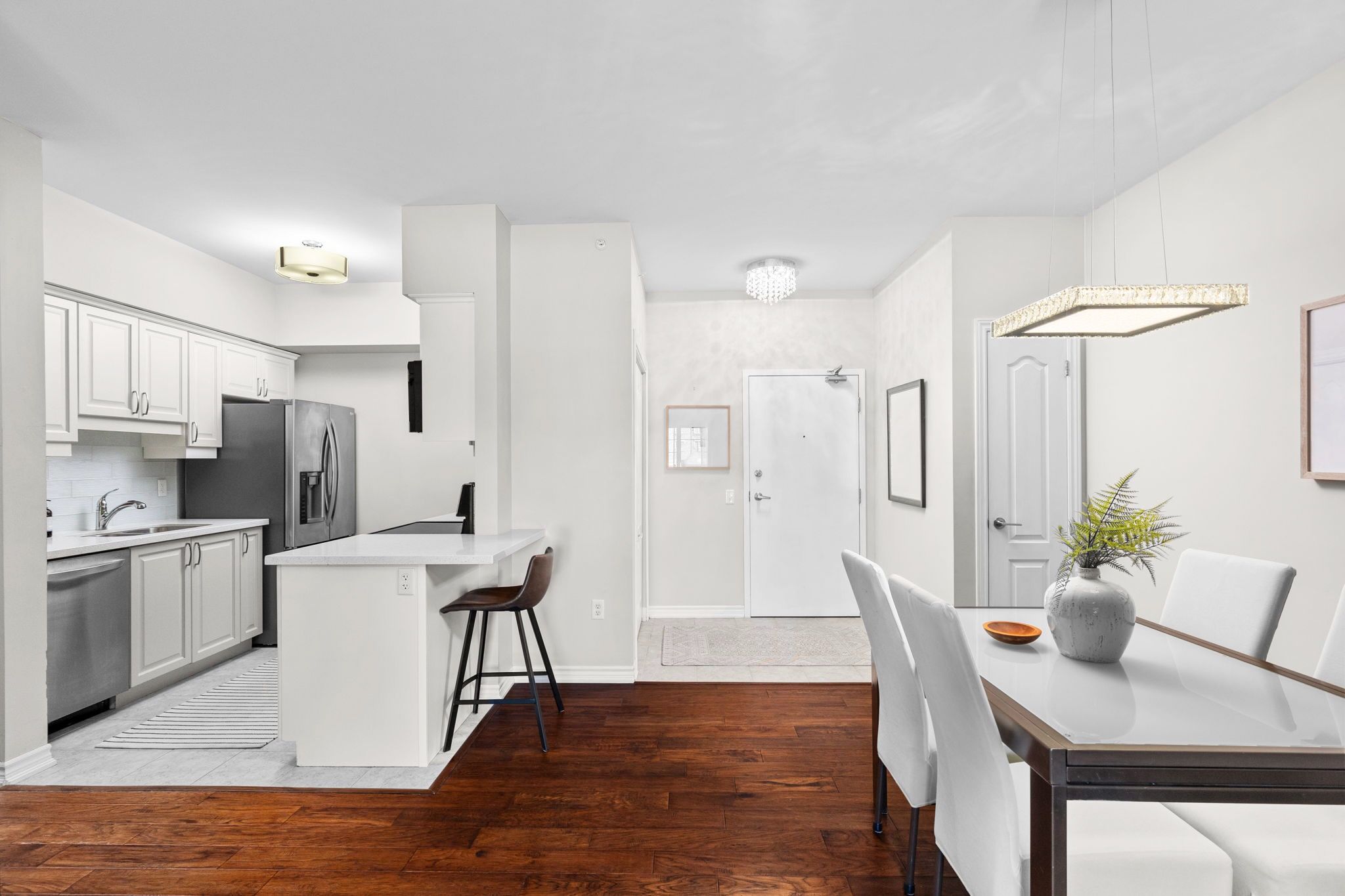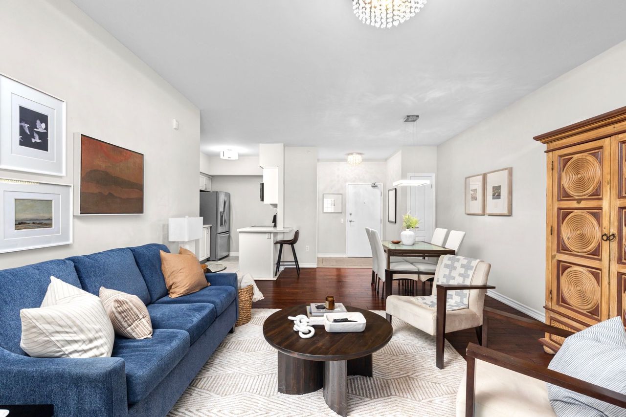 This fantastic and rarely offered 2 bedroom, 2 bathroom, ground floor unit in the beloved Ardagh community is one you won't want to miss! Inside this 1100+ square foot home you will find beautiful engineered hardwood floors, updated white kitchen with quartz counters and a large open concept living / dining room, perfect for entertaining friends / family or simply lounging. Walk out onto your private balcony with your morning coffee to enjoy lush views of the gardens and glimpses of the sunset in the evenings. The spacious primary suite includes its own 3 piece ensuite with walk - in shower and substantial size walk - in closet. No shortage of storage here wiht sizeable closets throughout plus your own locker unit located next to the unit's parking spot in the underground garage. Can't beat the location as you are just minutes from it all - Bear Creek Park, schools, shopping centres, major transportation routes and many more great amenities.**Interboard Listing: The Lakelands Real Estate Association**