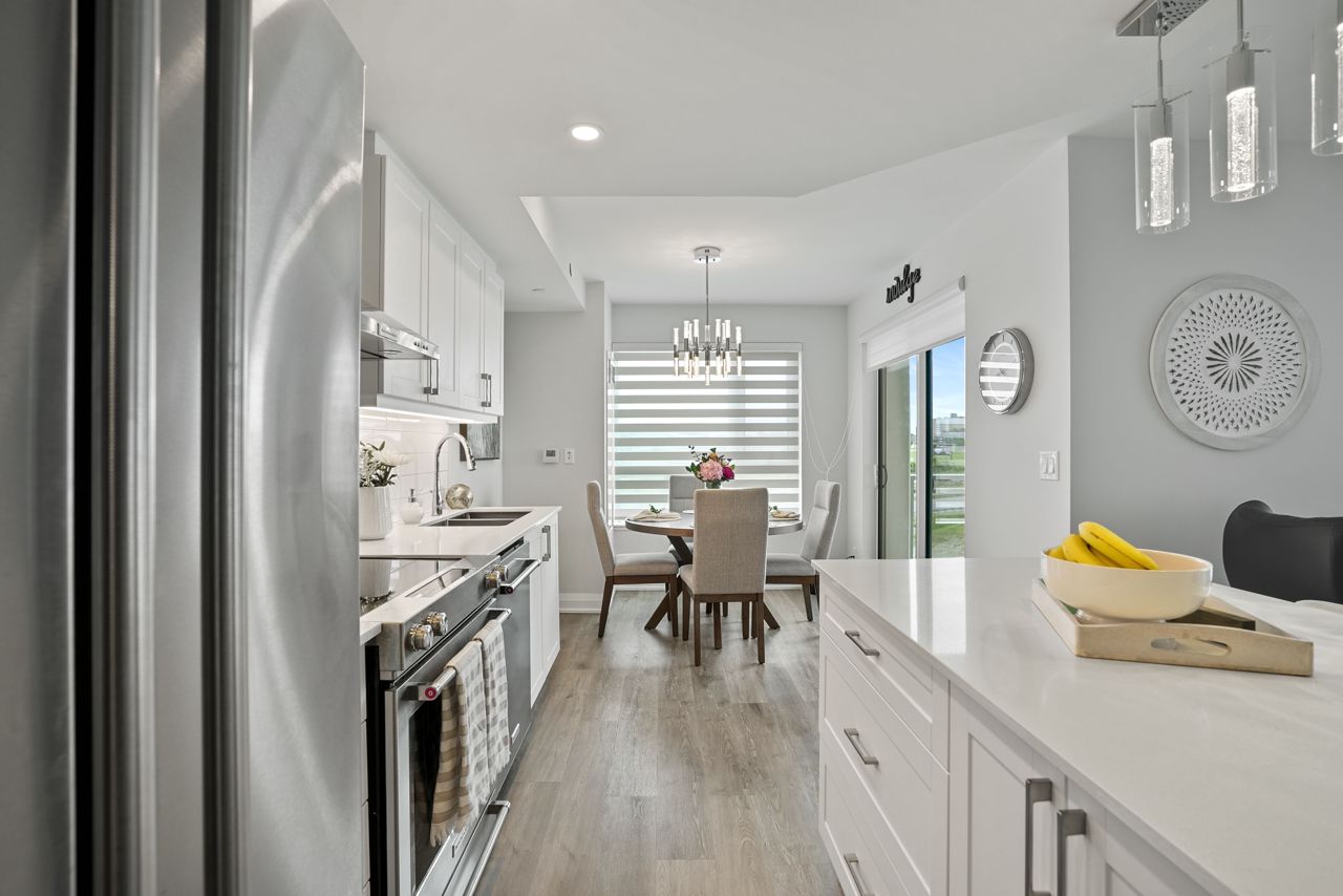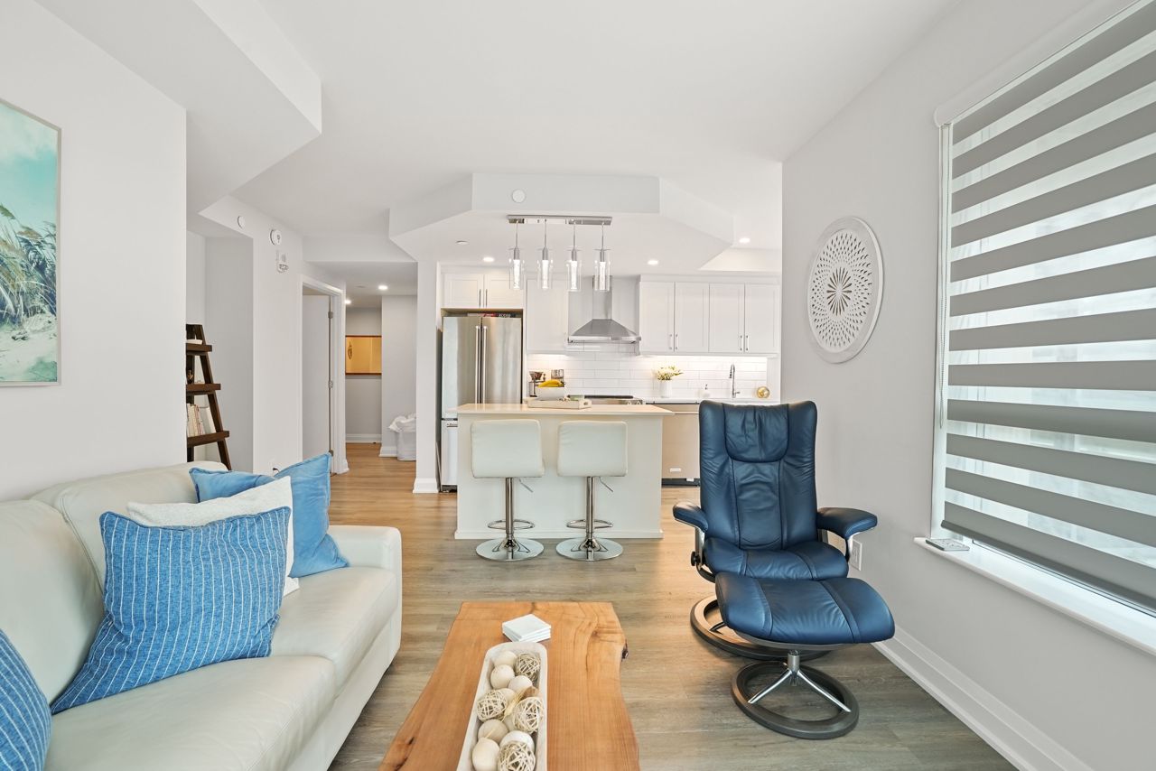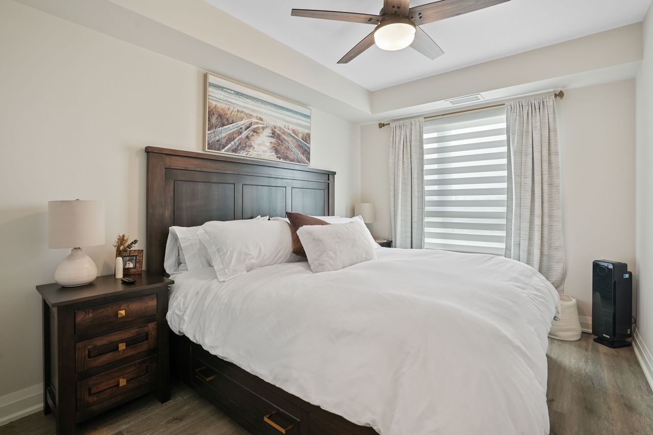 Welcome to this exquisite ninth-floor premium corner "Cranberry" model offering abundant natural light through extra windows and spaciousness throughout. This open-concept condo boasts numerous upgrades including a beautiful kitchen featuring a larger centre island with quartz countertops, soft-close cabinetry, backsplash, top of the line Kitchen Aid stainless steel appliances, and under-mount sink. You'll love the reconfigured primary bedroom completed with a large closet and ceiling fan, complimented nicely by the 3piece ensuite complete with ceramic floors and a lovely ceramic/glass shower. Additional features include a front entrance bench with storage and hooks, upgraded flooring, custom blinds, dimmable lights, pot & pendant lights, and a generous balcony perfect for relaxation. This 2-bedroom, 2-bathroom condo is designed for both entertaining and practical living, making it ideal for in-law or guests. Enjoy the convenience of amenities such as a games room, party room, exercise room, rooftop terrace, guest suite, visitors parking, dog wash, owned underground parking (rare extra wide with EV charging spot!!!), and an owned storage locker. Practicality meets luxury with a full-size washer and dryer included. Located close to Little Lake, Georgian College, Royal Victoria Hospital, shopping centers, parks, schools, and easy highway access, this property offers convenience and comfort within the desirable Little Lake community. Don't miss the opportunity to make this your new home, schedule a showing today!