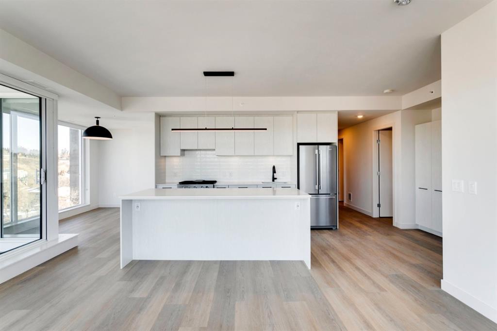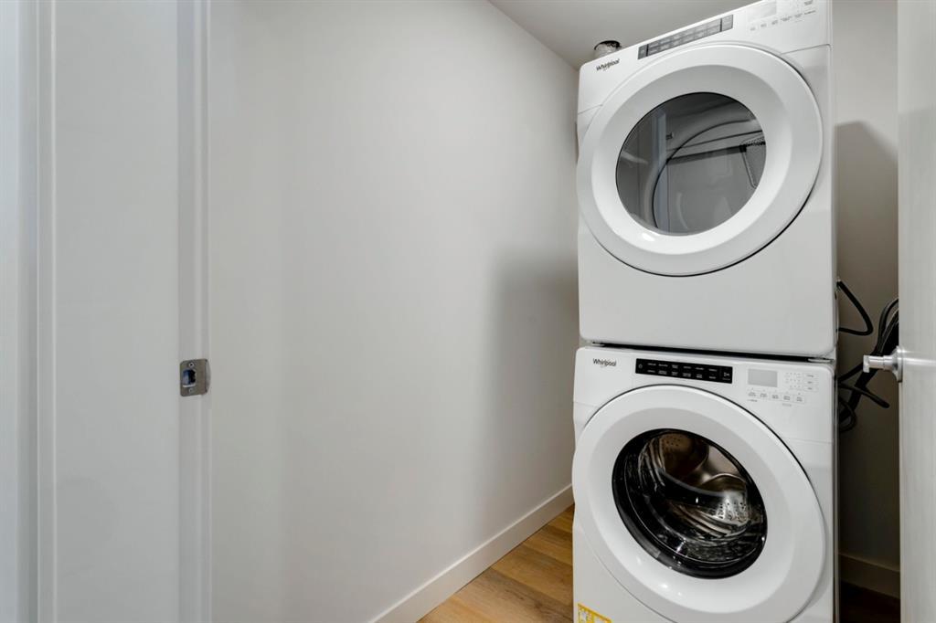 Move in ready luxury suite!! This property boasts sophisticated features and finishes, including 9' ceiling heights in the main living areas for a grand and spacious feel. The luxury vinyl plank flooring with acoustic underlay throughout adds a touch of elegance and comfort to the space. The wall-to-wall, floor-to-ceiling windows offer fantastic views, and included window coverings provide privacy and insulation. Convenience is key with a stacked, front loading washer and dryer included. The modern 4" baseboard and 2.5" door casings add a touch of luxury, while the knockdown ceiling finish adds a sleek and polished look. Enjoy the outdoors with balconies that feature gas line connections. The kitchen boasts premium quartz countertops, undercabinet valence lighting, and designer Whirlpool stainless steel appliances including a, gas slide-in range, integrated dishwasher, and microwave in-island which is custom built and doubles as a dining table, with added storage for your convenience. (id:22211)