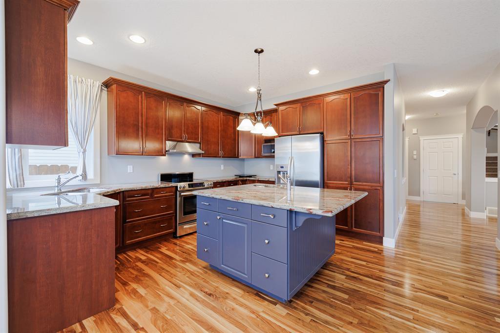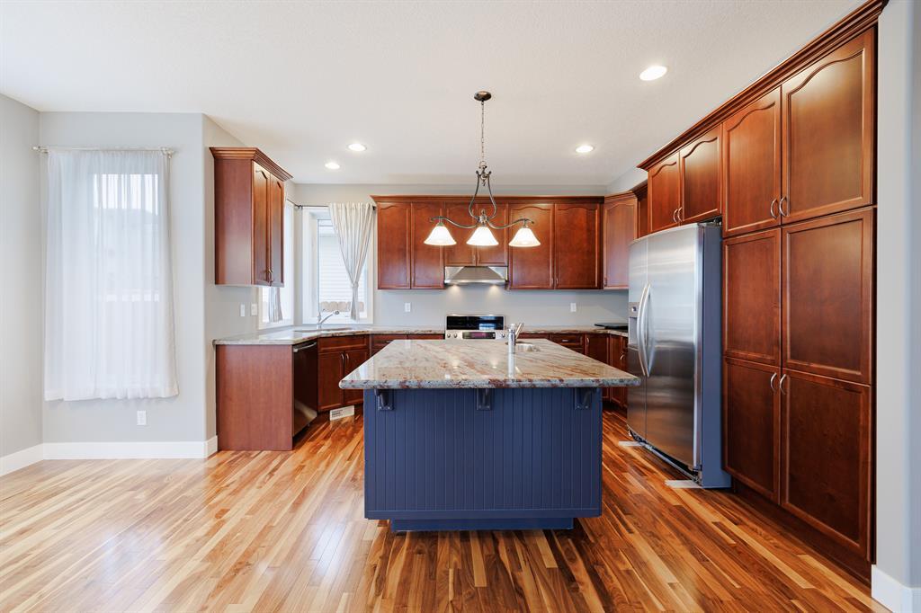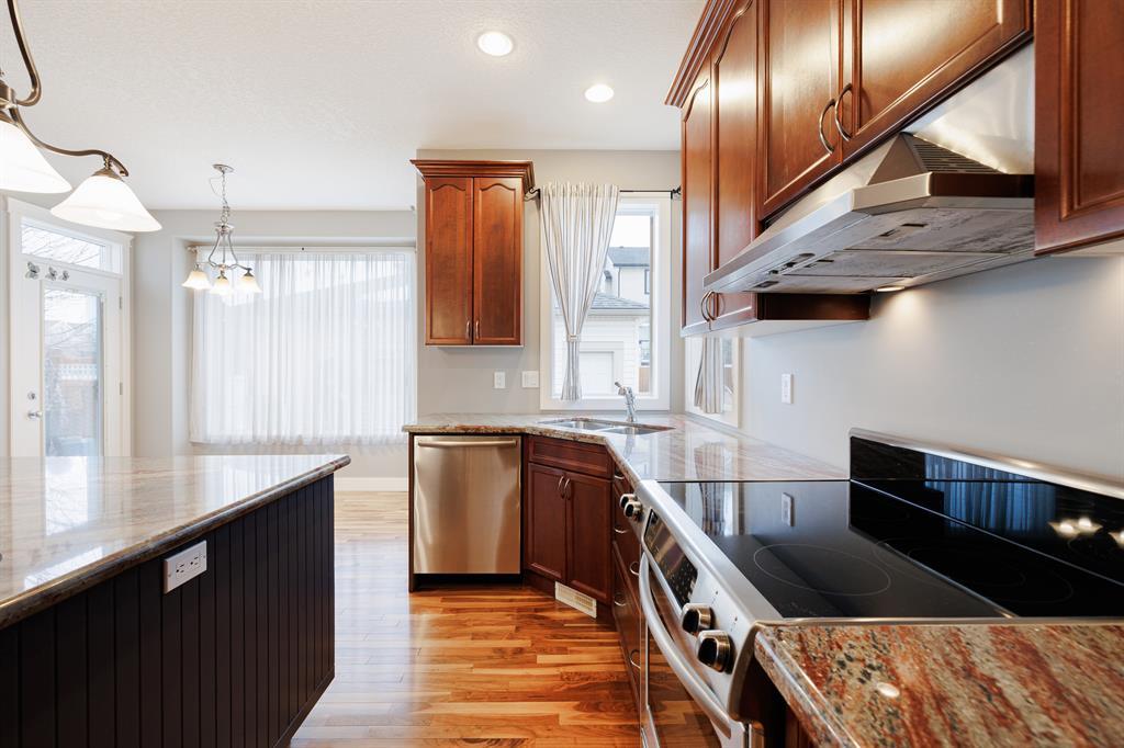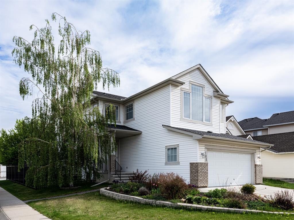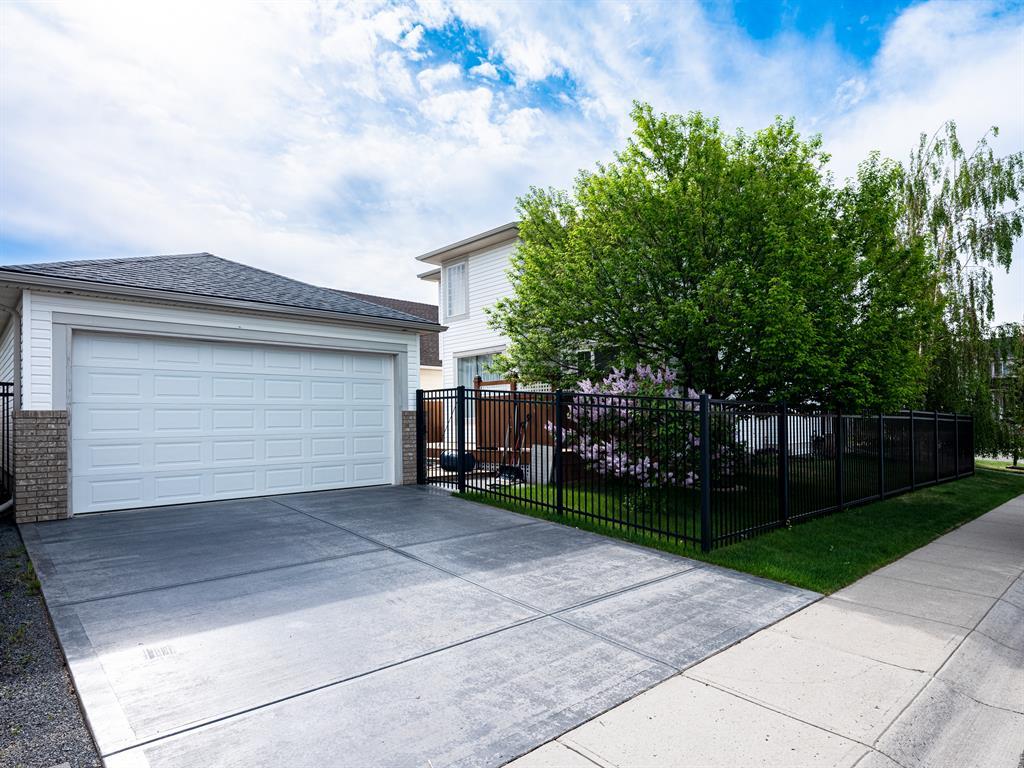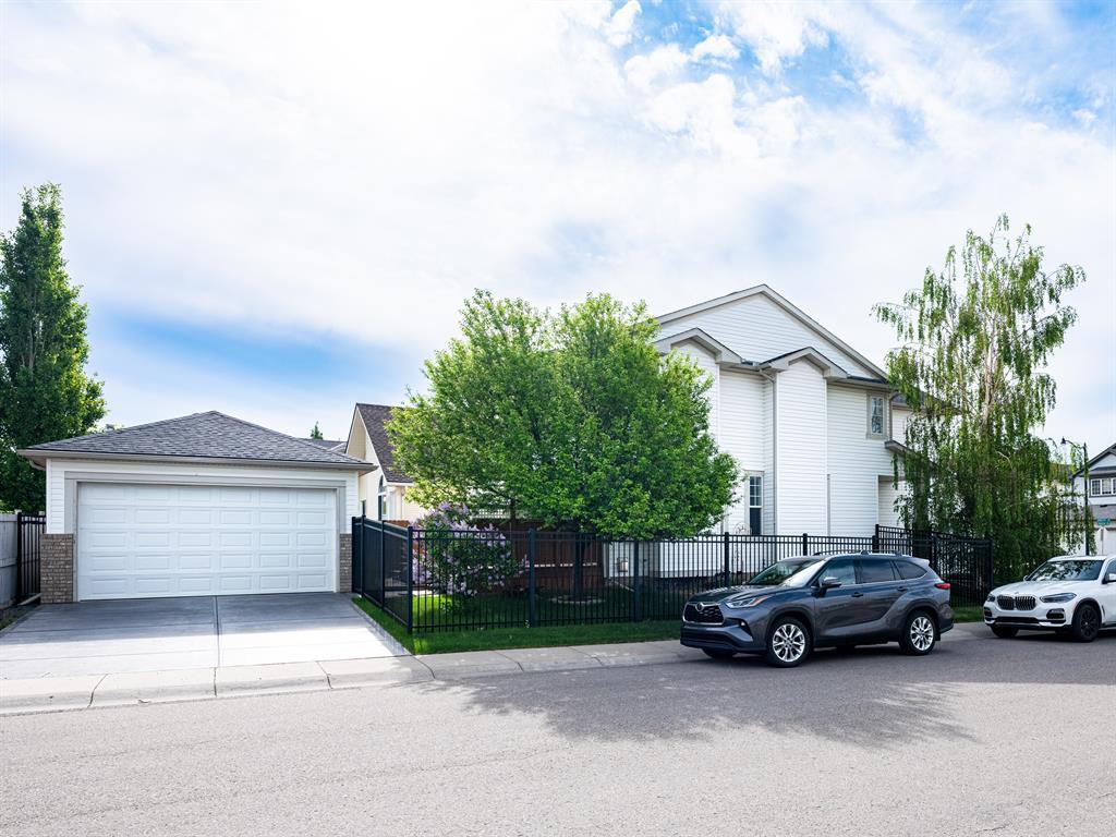 Incredibly upgraded 2 Story home on a corner lot in the desirable community of Evanston! This 2,389 sqft. house features 4 bedrooms, 4 bathrooms, attached double car garage with an additional rear side drive double detached garage and a fully finished basement! Gleaming walnut hardwood floors and high ceilings are featured throughout the main floor. The kitchen features an oversized island, granite countertops, extensive cabinetry, stainless steel appliances including brand-new LG stove and refrigerator and beautiful windows overlooking the backyard space. The living room boasts a feature gas fireplace with a mantle and tile surround and oversized windows to enhance the open concept floor plan. The eating nook provides direct access to the extensive patio area featuring a beautiful mature tree, fully fenced backyard and privacy wall on the patio’s upper level! The main floor is complete with a 2pc powder room, office space and spacious dining room, great for hosting and entertaining guests. The primary suite boasts large windows, and a spa-like 5 pc. ensuite including a double vanity, corner soaker tub, standalone shower and walk-in closet with built-in shelving with a primary retreat space that can be easily converted into a nursery or additional bedroom. The bonus room features oversized windows that flood the space with an abundance of natural light and vaulted ceiling! An additional 2 bedrooms, upstairs laundry room and 4 pc. bathroom complete the upper level. The basement features a gorgeous 4pc bathroom with a spacious walk-in shower, marble tile and heated floors, wet bar, gas fireplace and an incredible wine room with a custom wood door and built-in shelving. The basement is completed with an additional bedroom, hardwood flooring and built-in speakers. Additional features include a water softener, irrigation, central vac with attachments and a heater in the secondary fully finished double car garage. Located across the street from Kenneth D. Taylor School, p arks, and playgrounds! Minutes from all amenities and quick access to Stoney Trail! Pride of ownership is seen throughout! (id:22211)