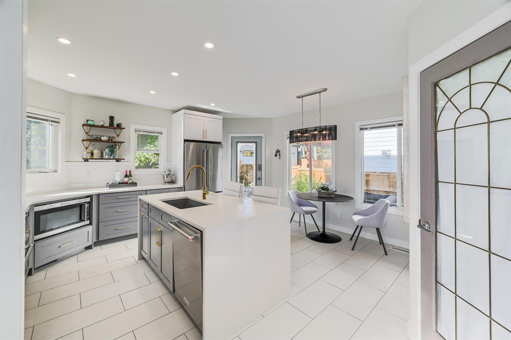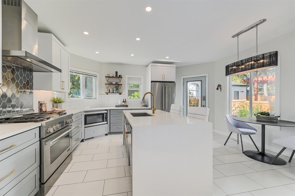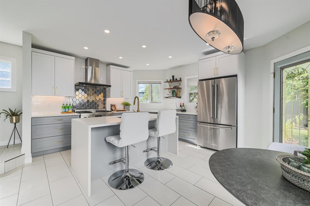 A Magnificent Home, on a Quiet Street, at the Edge of Richmond, just Minutes from Downtown! This Newly renovated Mid-century Modern Home has a lot to offer for any family. With over 2600 sqft of finished living space and 4 bedrooms and 3.5 Bathrooms, 2 living rooms and outdoor areas make it great to entertain friends and family. Walking up to the home you're greeted with a charming front patio that is nestled into the front of the home and protected from the elements. Entering the home you have a front foyer that leads you directs into the front living room and front office just adjacent. Tigerwood Hardwood floors throughout the main floor aside from the kitchen area that is finished in beautiful Large White Ceramic Tile. A TRUE CHEFFS KITCHEN with All Top Of The Line Stainless Steel Appliances Featuring a large - Jennair 4 Burner Gas Stove and Cooktop, White Quartz Countertops throughout the kitchen with Hexagon and White Tile Backsplash. Large Single Undermount Sink Conveniently placed on the Large Center White Waterfall Quartz Island. Just off the kitchen you have a formal dinning area and Half bathroom with French doors leading out to an outdoor back patio space! Upstairs has 3 bedrooms and 2 full bathrooms featuring a Large Master bedroom with walk-in closet and a beautifully finished full 5 Piece Ensuite! The Basement has recently been fully finished! Plush grey carpet throughout and offers another full bathroom, rec room, Laundry room and guest bedroom! Step out into the newly fenced West Facing Private Back Yard, many beautiful trees make this yard perfect for tanning in quiet privacy or hosting your friends and family for a BBQ! OVERSIZED DETACHED TRIPLE GARAGE large enough for a lift! Wired with 220V AMP - HEATED / INSULATED and the Back Alley was Recently Paved, no pot holes or bumps, perfect for storing Luxury Vehicles and Toys. Come view this gem before its gone! (id:22211)
