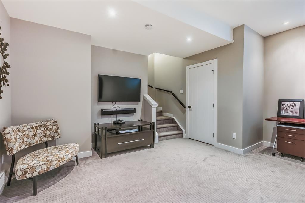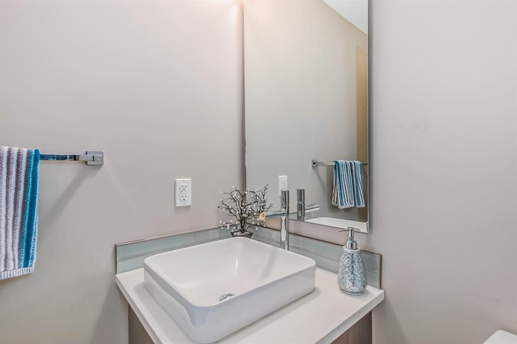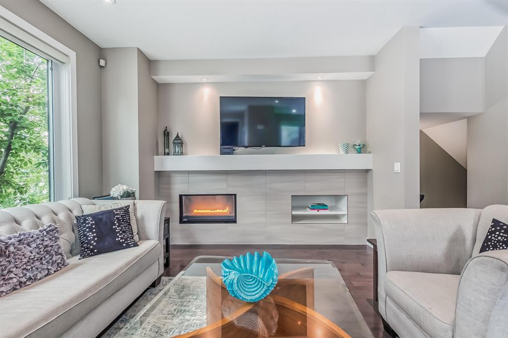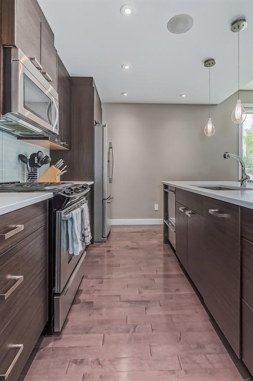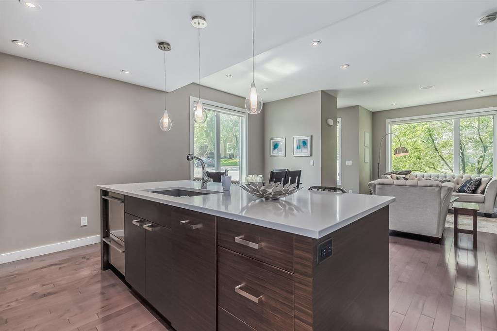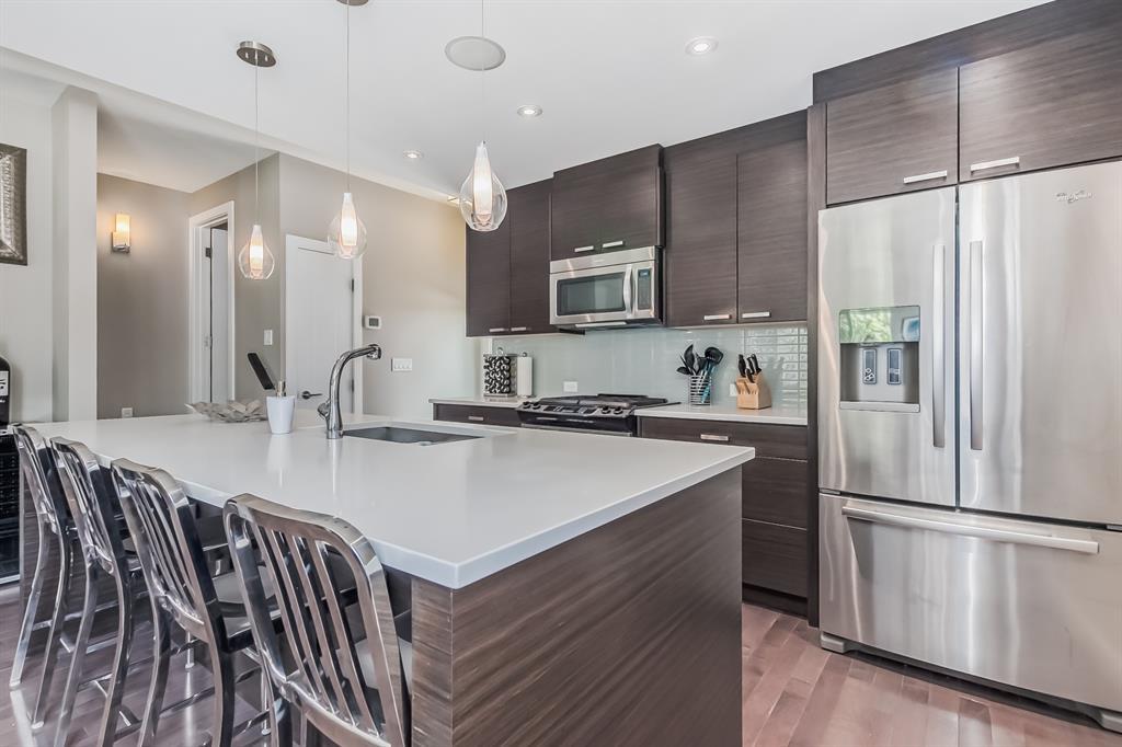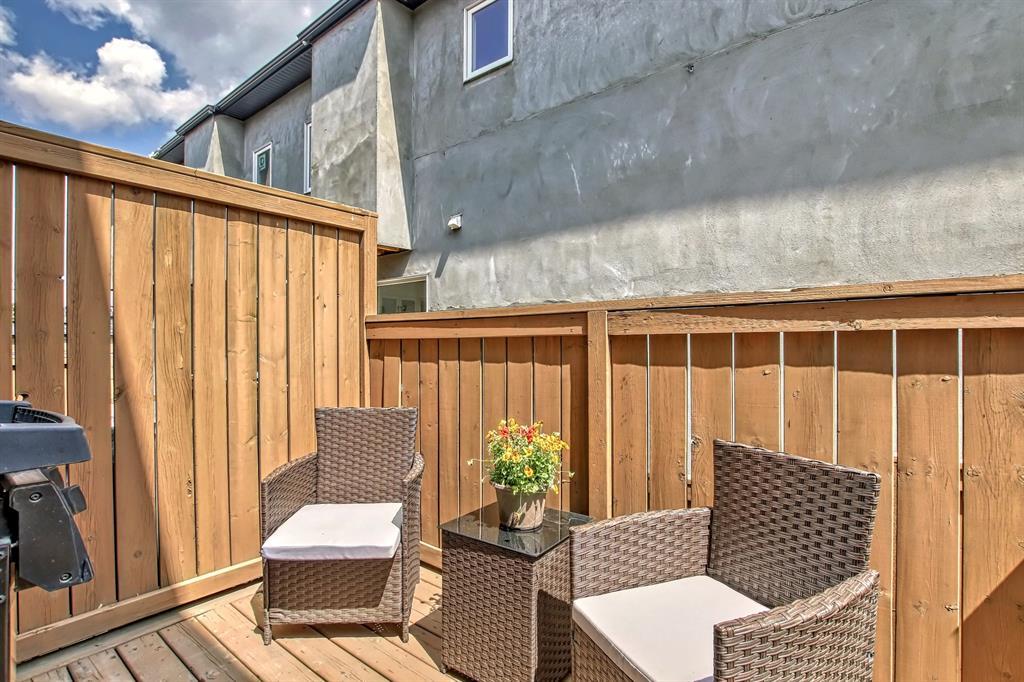 3 Bedroom (2+1), 3.5 bath --SUNNY S.W. CORNER END UNIT.-- One of the few executive townhomes with a PRIVATE FENCED SOUYTH YARD (great for FURRY FRIENDS) and private back deck. Almost 1700 ft2 of higher end finishing and development, including: mocha hardwood floors on the main, quartz countertops throughout, glacier blue tile blacksplash, stainless appliances, vaulted flat ceilings, pot lighting & AIR CONDITIONING. Main floor is totally open with a sleek gas fireplace in the living room, large dining area with BRIGHT south window and an Island kitchen (fits 4 bar stools) with gas range and a 2 drawer Fisher & Paykel Dishwasher. 2nd floor has 2 large bedrooms -- each with ensuites. The primary ensuite has heated floors, rain shower & double sinks. Full size, front loading, stacked laundry closet upstairs as well. Fully developed basement with large Family room, 3rd bedroom down and 3pc bath. Single detached garage. If you haven't been down to South Calgary lately --do a double take! cSpace Marda Loop has completely transformed this location. Walking distance to some great coffee shops, Marda Loop Community Association, Tennis courts, public library & community wading Pools. Minutes by car to the 'off leash' dog park, Glenmore Athletic Park, weekend Farmer's market and Marda Loop shopping. Don't forget to visit our 3D TOUR! ***OPEN HOUSE THIS SATURDAY MAY 27TH, 2-4PM*** (id:22211)