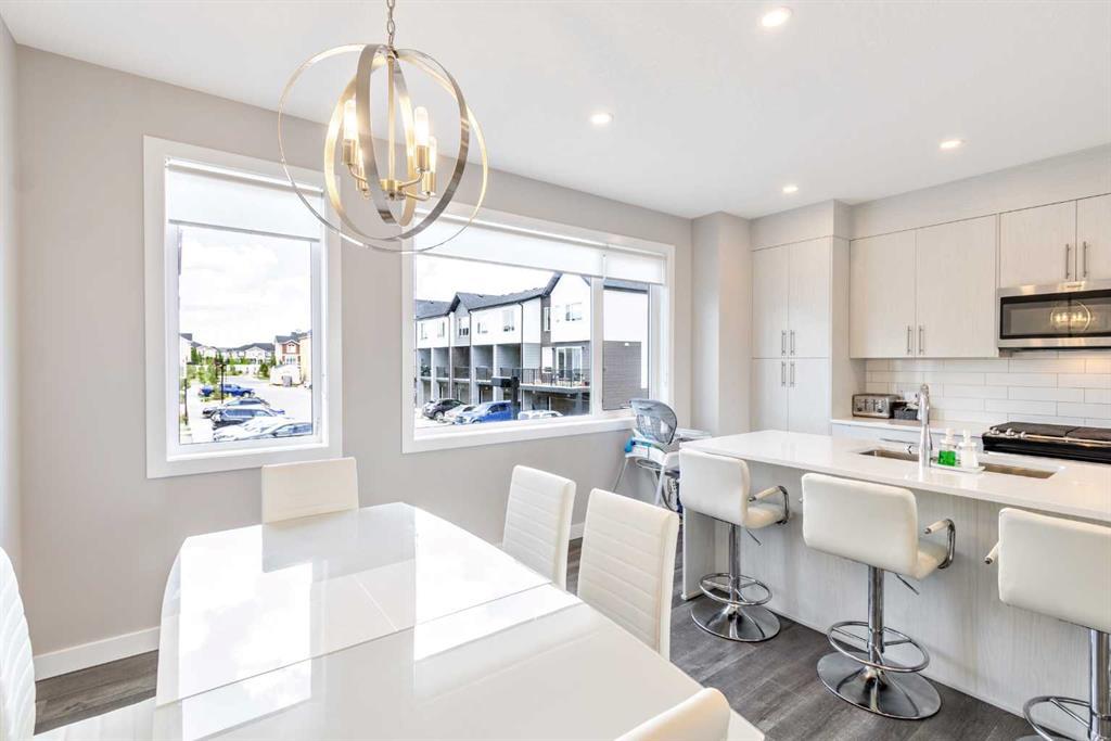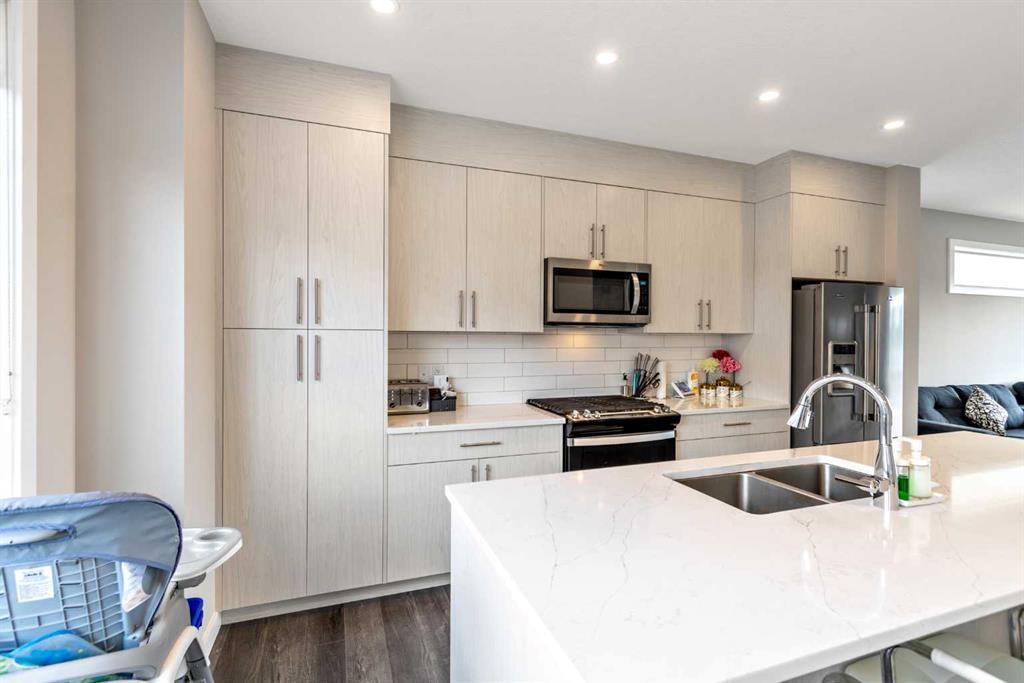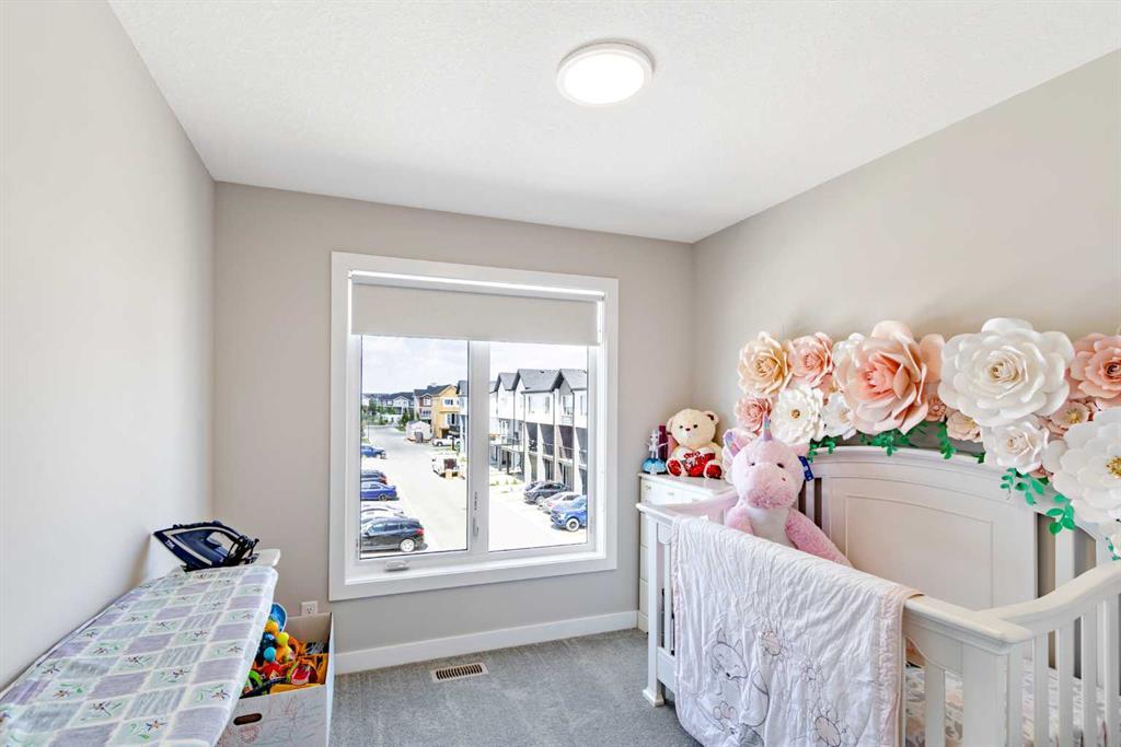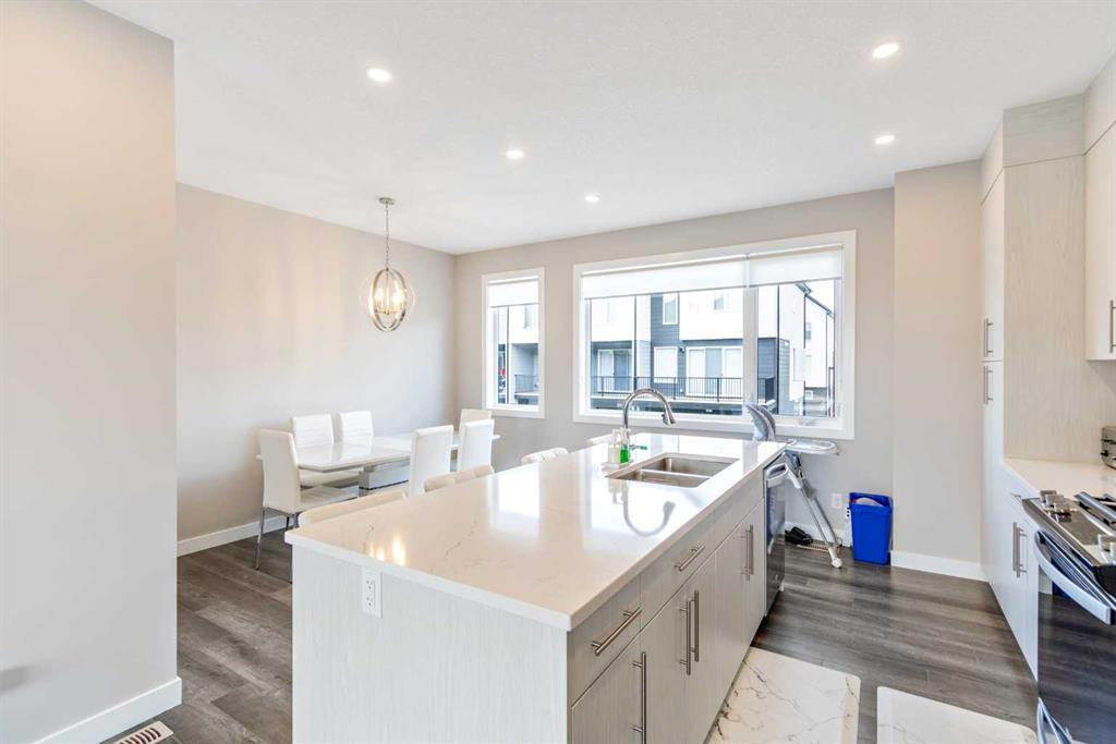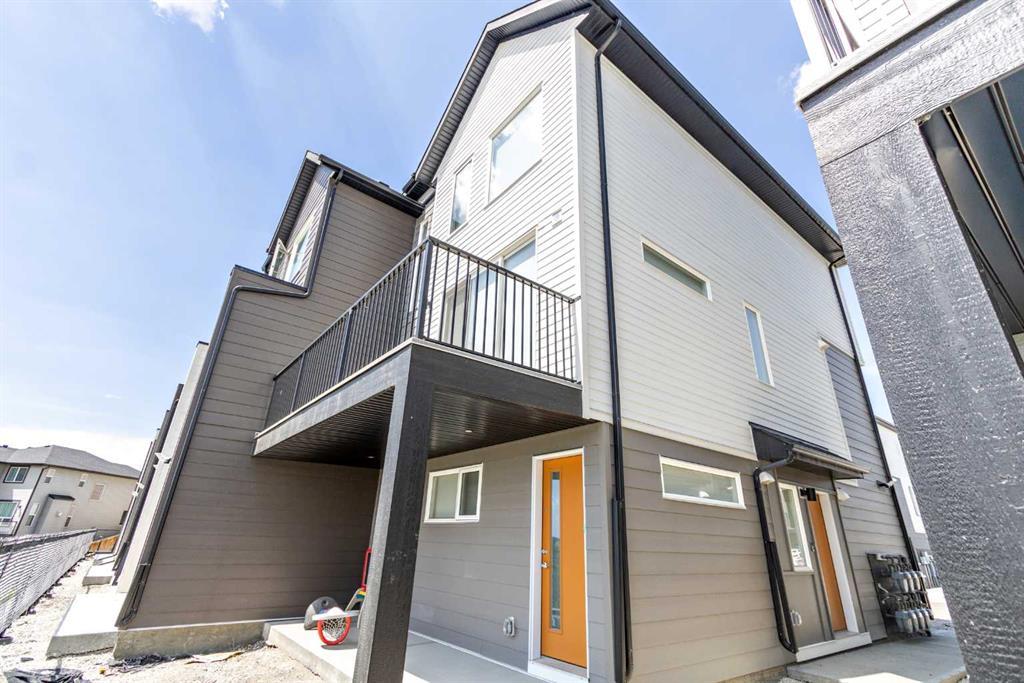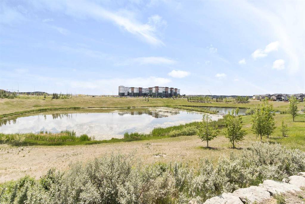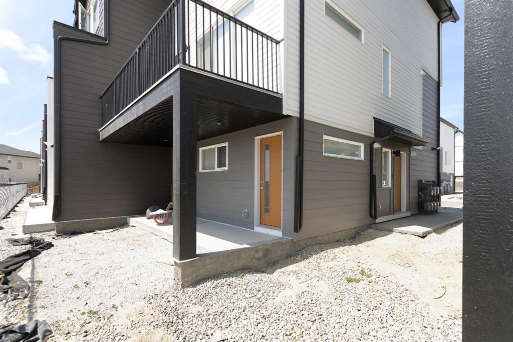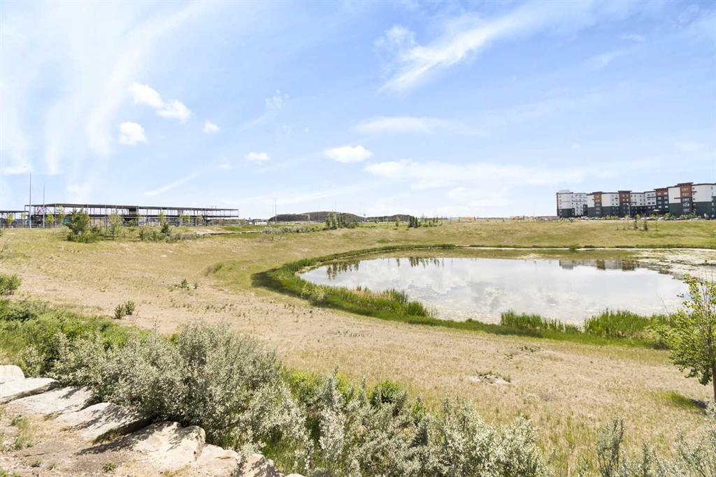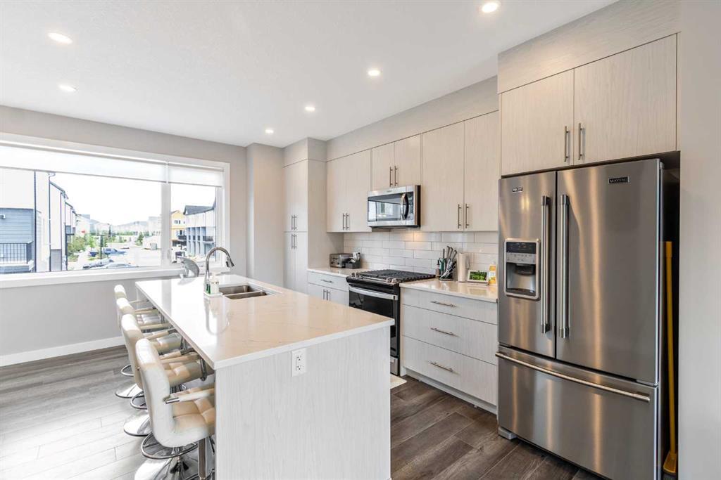 BACK ON MARKET DUE TO FINANCING. Welcome to Skyview Ranch! This stunning CORNER END UNIT TOWNHOUSE built by Partner's Home very famous " Tahoe model", a 3-storey townhome, With 3 bedrooms, 2.5 bathrooms, and low condo fees, this property has everything you need for comfortable living.As you step into the main floor, you'll immediately appreciate the open concept floor plan with 9' ceilings, creating a spacious and airy atmosphere. The large bright windows flood the living area with natural light, illuminating the beautiful laminate flooring throughout. The upgraded kitchen is a chef's delight, featuring stainless steel appliances and quartz countertops.The living room seamlessly flows onto a generous south-facing 18' wide balcony, perfect for relaxing and entertaining. The balcony and patio comes with a convenient BBQ gas rough-in and overlooks a fenced yard that backs onto a serene pond and green space, providing a tranquil retreat.The ground floor of this townhome offers an oversized single garage that leads to a large game/rec room. This versatile space can be tailored to your needs, whether it be a gaming area, home gym, or a cozy recreational space for the whole family to enjoy.On the upper floor, you'll find the primary bedroom complete with double closets and a private 4-piece ensuite. Two additional bedrooms and another full bathroom provide ample space for family members or guests. The convenience of upper floor laundry adds a practical touch to everyday living.This home is adorned with tasteful interior appointments such as kitchen and bathroom quartz countertops, tile flooring in the entry level, bathroom, and laundry areas. The inclusion of a white stacker washer/dryer, pot lights with elegant fixtures, and blind window coverings adds both style and convenience to your living space.The exterior features cement fibre board siding, ensuring durability and a visually appealing facade. The quiet wall system contributes to a peaceful living en vironment. Additional features include an HRV (heat recovery ventilation) system and an on-demand hot water tank paired with an IBC Air Handler, promoting energy efficiency. Furthermore, there is a rough-in for future air conditioning, offering potential for enhanced climate control.Located within walking distance of a future LRT station, this home offers excellent connectivity to transportation networks. Multiple schools and shopping options are nearby, making daily errands a breeze. For outdoor recreation, there's a playground conveniently situated across the street.The RMS measurement of this townhome is 1431.45 sq. ft., Don't miss this opportunity to own a brand new, thoughtfully designed townhome in the desirable community of Skyview Ranch. (id:22211)