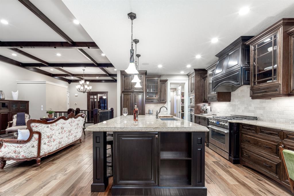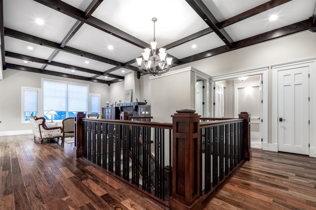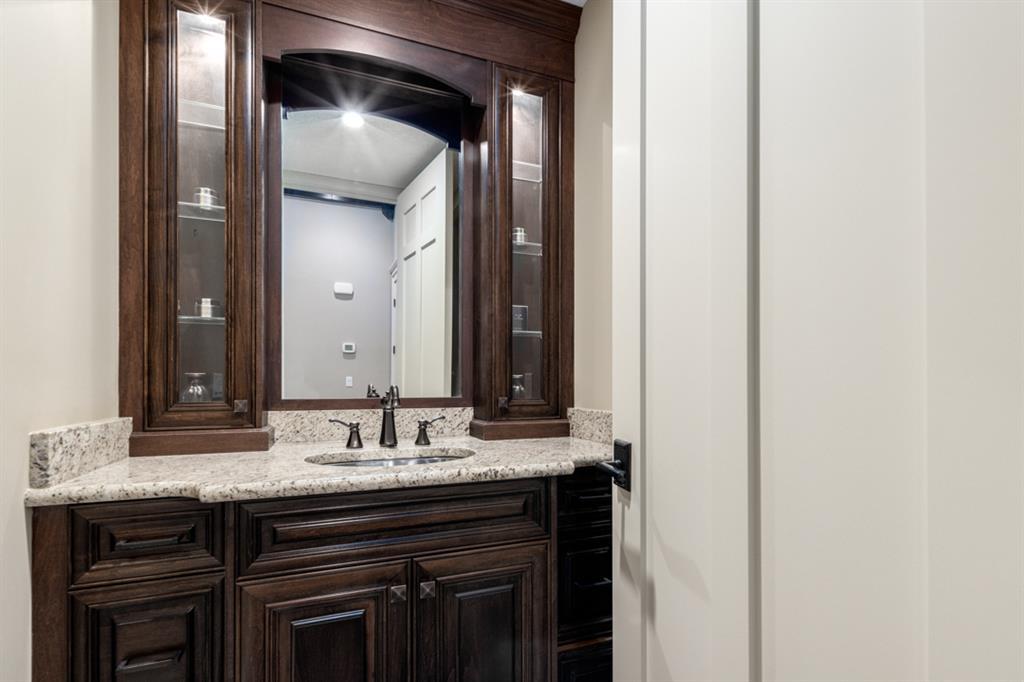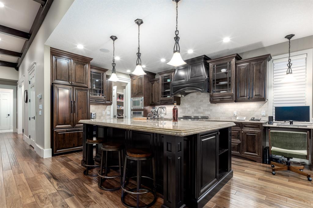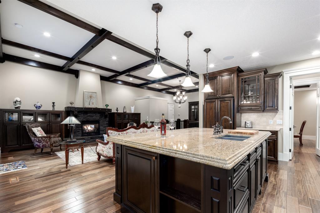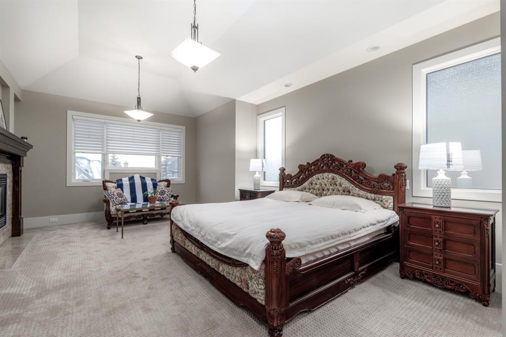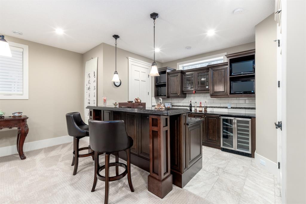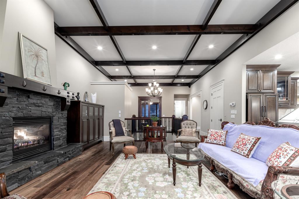 OPEN HOUSE SUNDAY, June 18, 1-2:30pm A sprawling 4300+ sq ft of fully developed living space on 2 levels with an ELEVATOR. Walkout bungalow starts with a side facing, oversized, heated triple attached garage, with barn-style doors, aggregate driveway, and elegant architectural details with stone accents. The impressive walk-out basement level consists of a recreation room with a gas fireplace, rich cherry oak cabinets, and a wet bar complete with a dishwasher, microwave, bar fridge, and pantry. This level also holds three bedrooms, two of which share one Jack & Jill bath, and another has a cheater door to a 4 pc bath, mudroom, storage and entrance to the garage. A grand staircase or a built-in elevator conveniently takes you to the upper level. Light filled second level accentuated by the striking beamed 9 ft ceilings, mahogany wood craftsmanship, and stunning stone fireplace flanked on both sides with built-in cabinets. Gourmet kitchen has rich wood cabinets, granite countertops, huge centre island, integrated refrigerator, dishwasher, and hood fan, 6 burner gas stove, built-in oven and microwave, wine fridge, and a walk-through pantry. A formal dining room, breakfast nook, double french doors to the den/office, and the primary bedroom quarters at the far back of the house. Your private owner’s retreat begins with a spacious bedroom and a tranquil sitting area in front of a gas double sided fireplace, and vaulted ceilings. Set on the other side of a hallway, is your 5 pc ensuite and walk-in closet. Bonus features include central air conditioning, ample storage, a total of 3 fireplaces inside and one outdoor, all on a west facing front home. Enjoy endless summers on the covered balcony with magnificent Rocky mountain views to the west and a cozy outdoor fireplace, gas BBQ hookup is a bonus! The location is home to some of the best and most prestigious schools in Calgary. Your shopping experience amplified with shops at Signal Hill, West Hills Towne Centre, and Aspen Landing. Easy access to Hwy 201 and Sarcee Trail, you are only a short drive to your weekend destination. (id:22211)