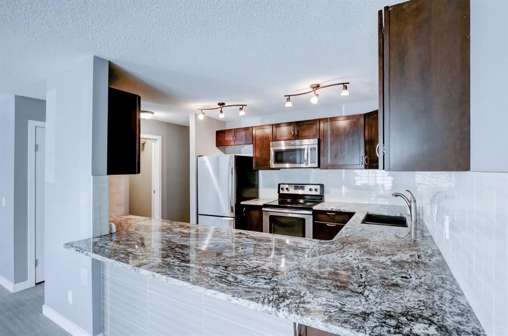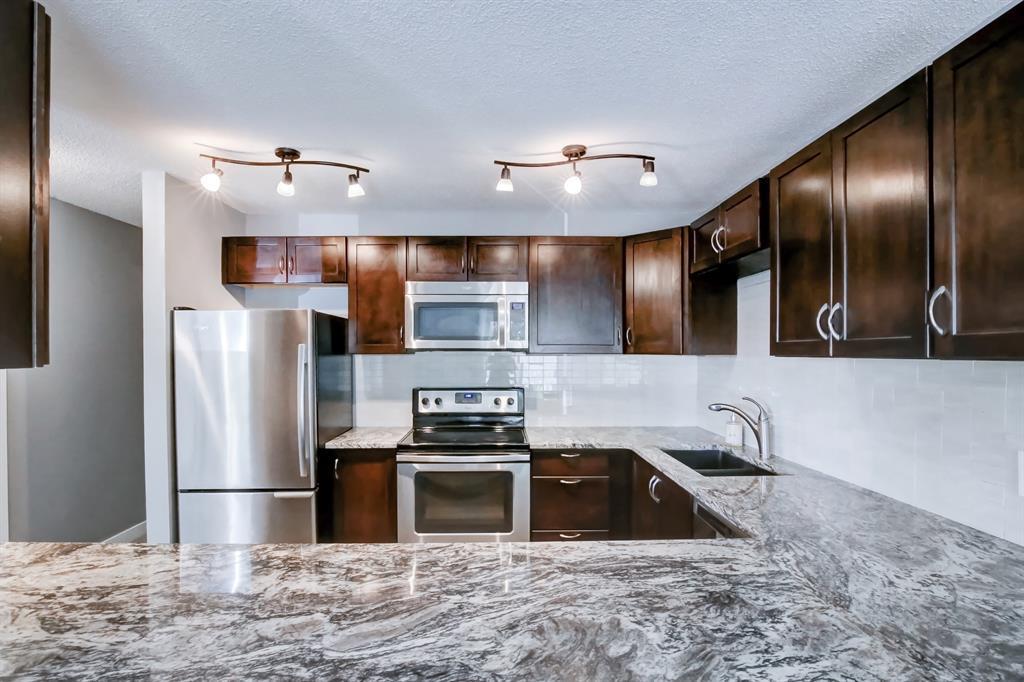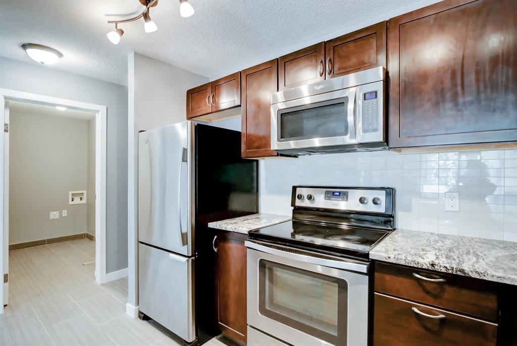 Welcome to Forest Groves! This RENOVATED unit is ONE of a kind in the area. A great cozy upgraded 2-bedroom one floor Townhouse. As you walk into this home you are surprised with the functional space and natural light. The dinning room flows into the Livingroom to your large east facing deck. The kitchen is a show stopper with beautiful dark brown cabinets, a huge granite countertop and stainless steal appliances. Also featuring a large primary bedroom with built ins, secondary bedroom and large updated bathroom. This attractive unit is close to all major shopping, schools and transit access. There’s plenty of additional storage in the unit, in-suite laundry, and one assigned parking stall. This unit faces a beautiful street and is close to plenty of visitor parking. Great access to downtown and easy access to exit east of the city. Don't miss this one!!! (id:22211)