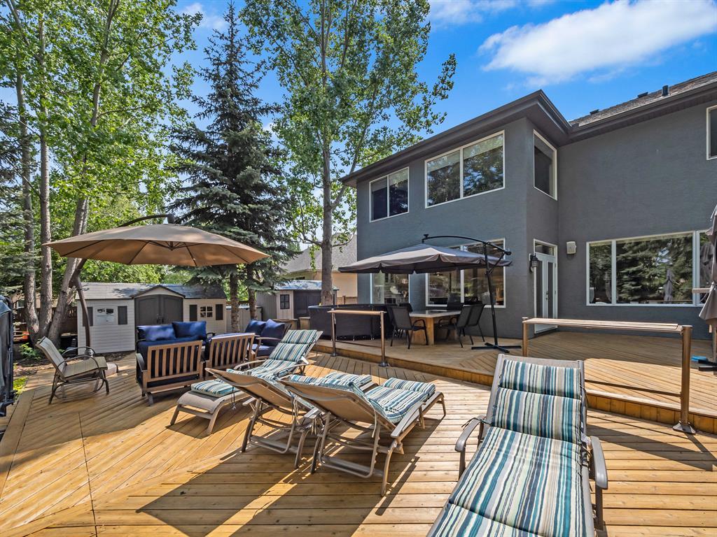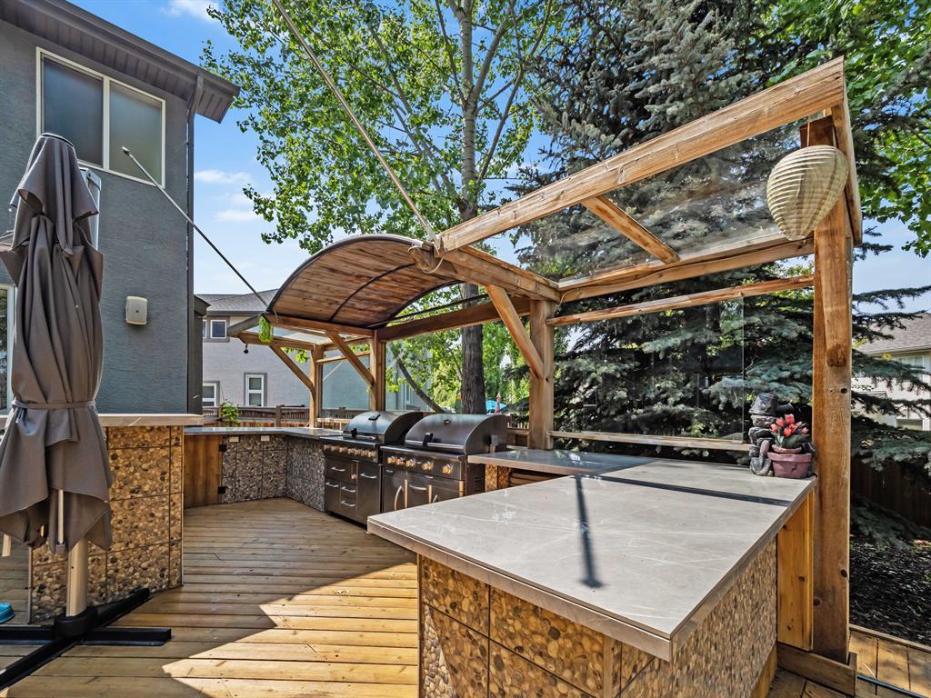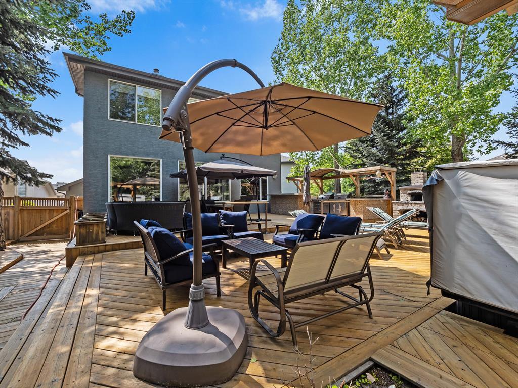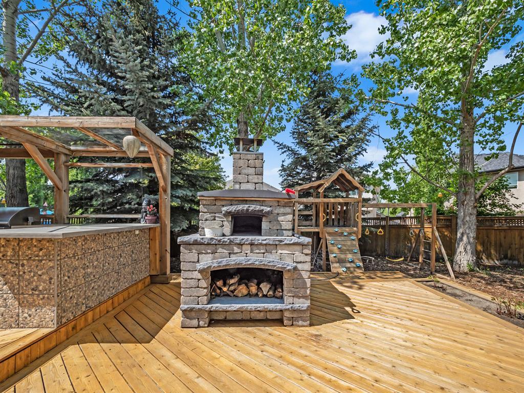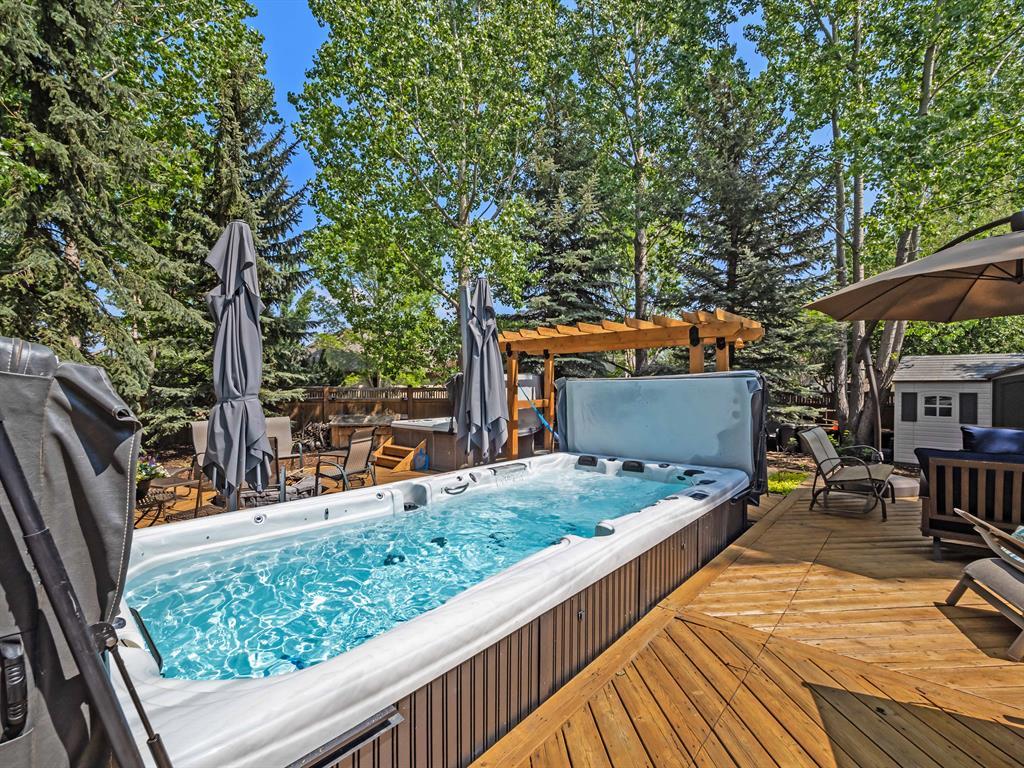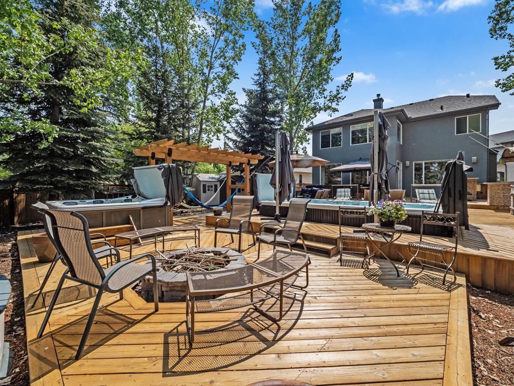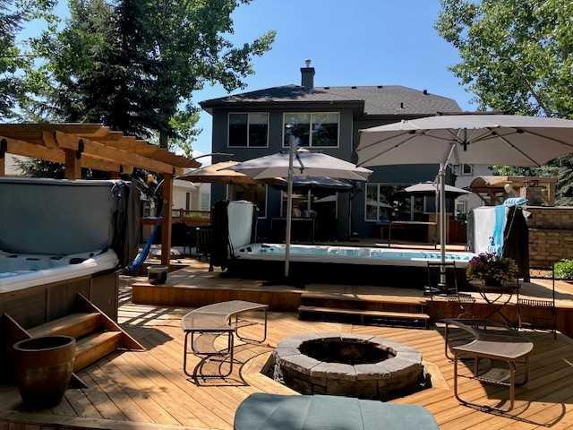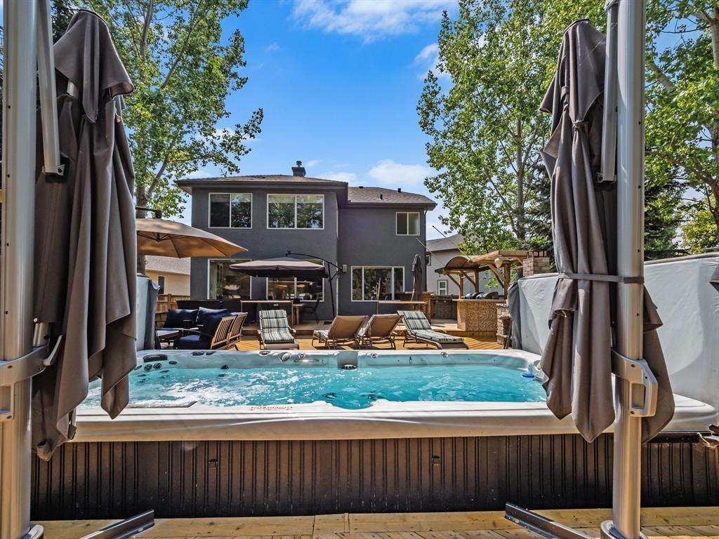 OPEN HOUSE SATURDAY SEPTEMBER 16 1:30 - 4:00. HUGE PRICE REDUCTION!!!. A 500K renovation in 2018 has taken this already beautiful home to the next level of luxury! Seemingly unlimited upgrades, a 3 storey addition and an incredible backyard oasis elevate this home to a timeless classic that will stand the test of time. Ideally situated on a pie-shaped lot within a quiet cul-de-sac, the impressive curb appeal mirrors the attention to detail found throughout. Inside this casually elegant sanctuary is 4,000 sq. ft of thoughtfully developed space. Gleaming hardwood floors are on all 3 levels, no carpet! All 4 bathrooms were lavishly upgraded with travertine tile and quartz countertops. The 100% open concept design is bathed in natural light and kept cool by central air conditioning. The new addition allowed for a huge gourmet kitchen featuring a 10’ centre island, full-height cabinets, quartz countertops and Thermador Professional Series stainless steel appliances that include a gas stove, wall oven, steam oven, warming oven and a built-in espresso machine. Clear sightlines into the living room promote unobstructed conversations while relaxing in front of the gas fireplace. Additional unwinding space is found in the upper level bonus room with a built-in media centre and an expansive 90 degree built-in work/study/gaming area. The primary suite is an indulgent escape, encased in windows that frame the mature landscape and equipped with an opulent ensuite boasting dual sinks, a deep soaker tub, an oversized rain shower and a custom walk-in closet. 3 additional bedrooms on this level ensure plenty of space. Gather in the finished basement with Radiant In-Floor Heating and come together over friendly game nights at the pool table or shuffleboard then grab a snack or refill your drink at the wet bar. A 5th bedroom and another full bathroom, just as stylish as the rest of the home are also on this level. The backyard is simply amazing and will make every day feel like you’re on vacation! French doors off the main floor open to reveal 6,000 sq. ft. of cedar decking leading to an outstanding outdoor kitchen and wood burning pizza oven. Take a dip in the 18’ spa or a relaxing soak in the 8’ x 8’ hot tub. Several umbrellas provide shaded areas followed by a pergola with hammocks. Convene around the built-in firepit on summer evenings. 3 sheds hide away the seasonal clutter – this incredible backyard truly has it all! The oversized garage is insulated and heated with a sink and a huge amount of space for a workshop and storage. Many upgrades were added during the comprehensive renovation including new baseboards, window casings, new roof shingles, new furnaces, air purification, water purification with smart leak detection, direct vent water heaters, neutral paint colour in every interior room, new exterior paint and much, much more! Perfectly located within this family-friendly community close to the resident’s only club, Fish Creek Park, schools, parks, shops and transit! (id:22211)