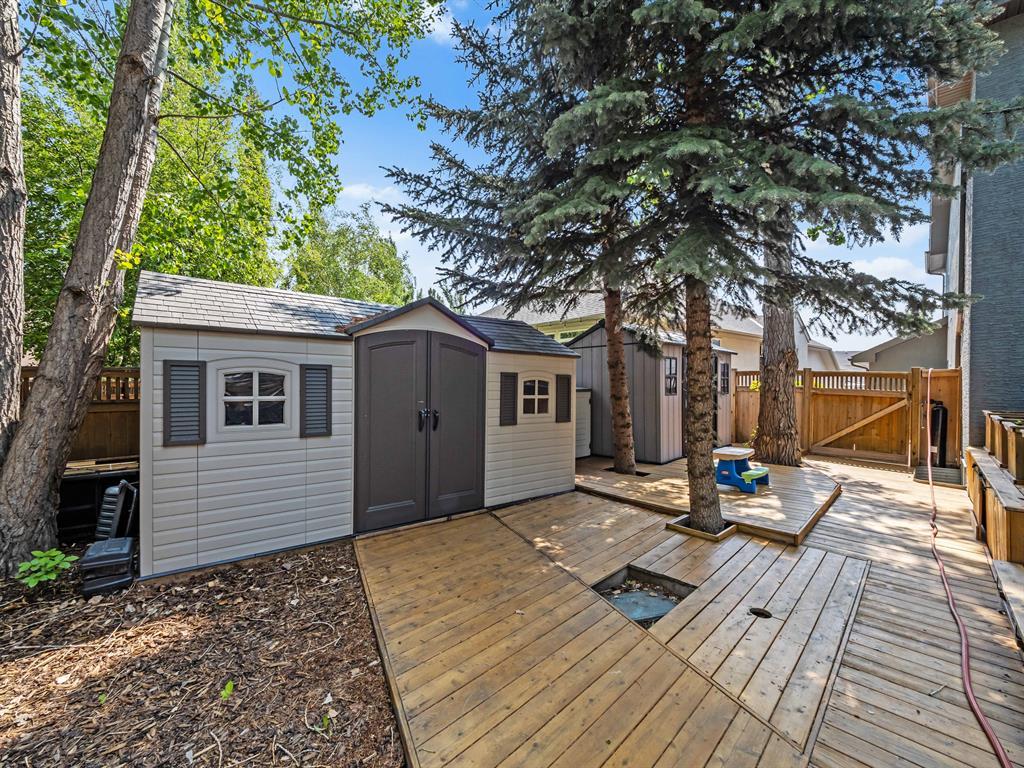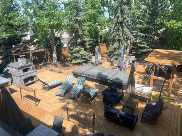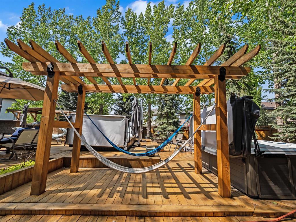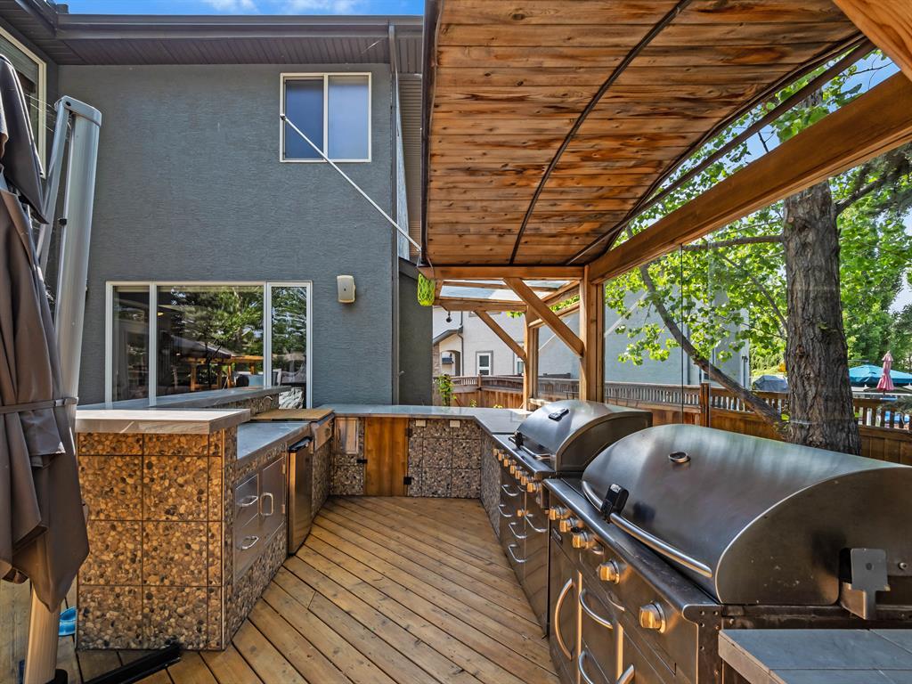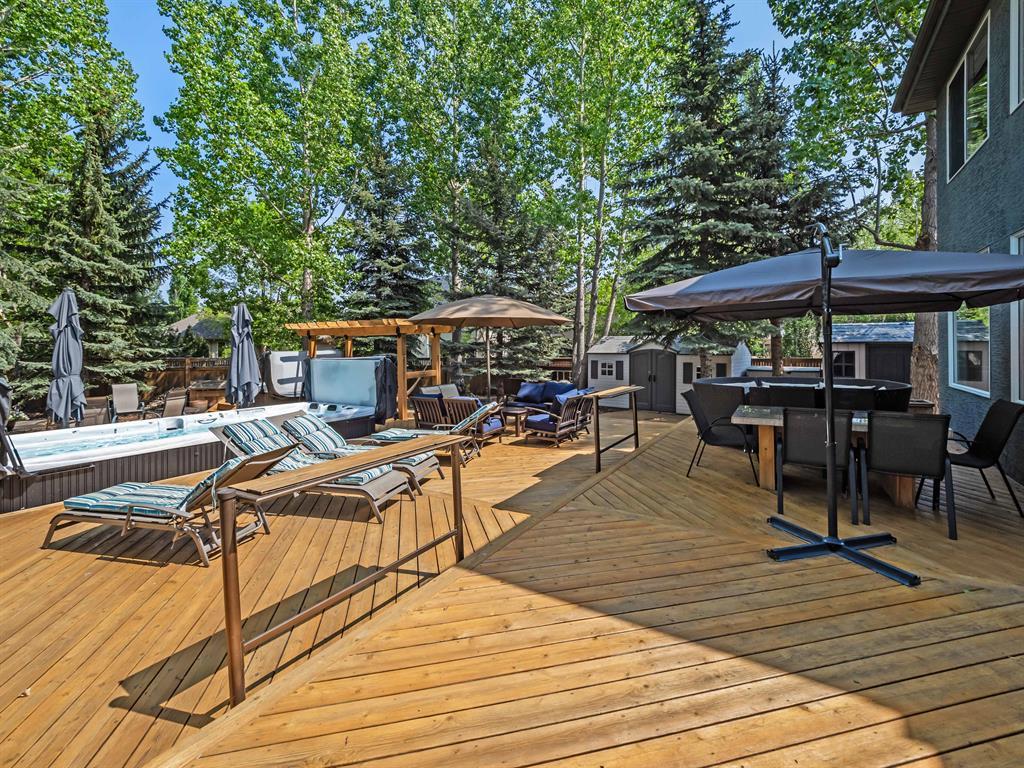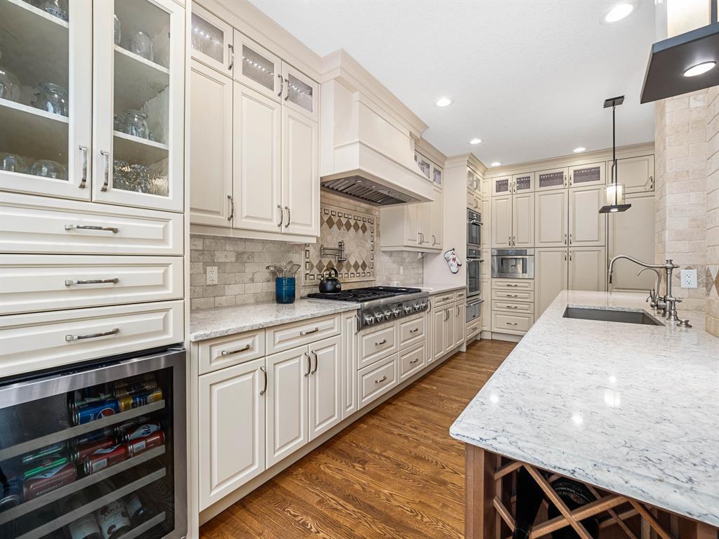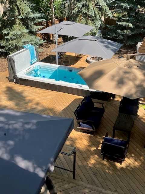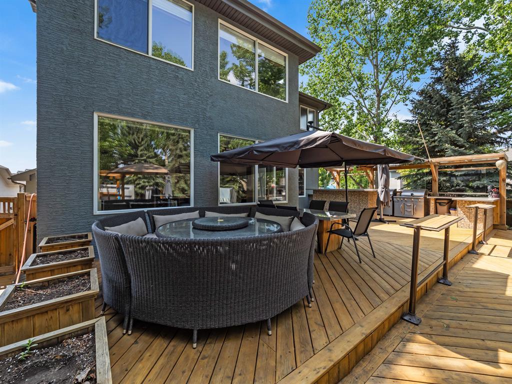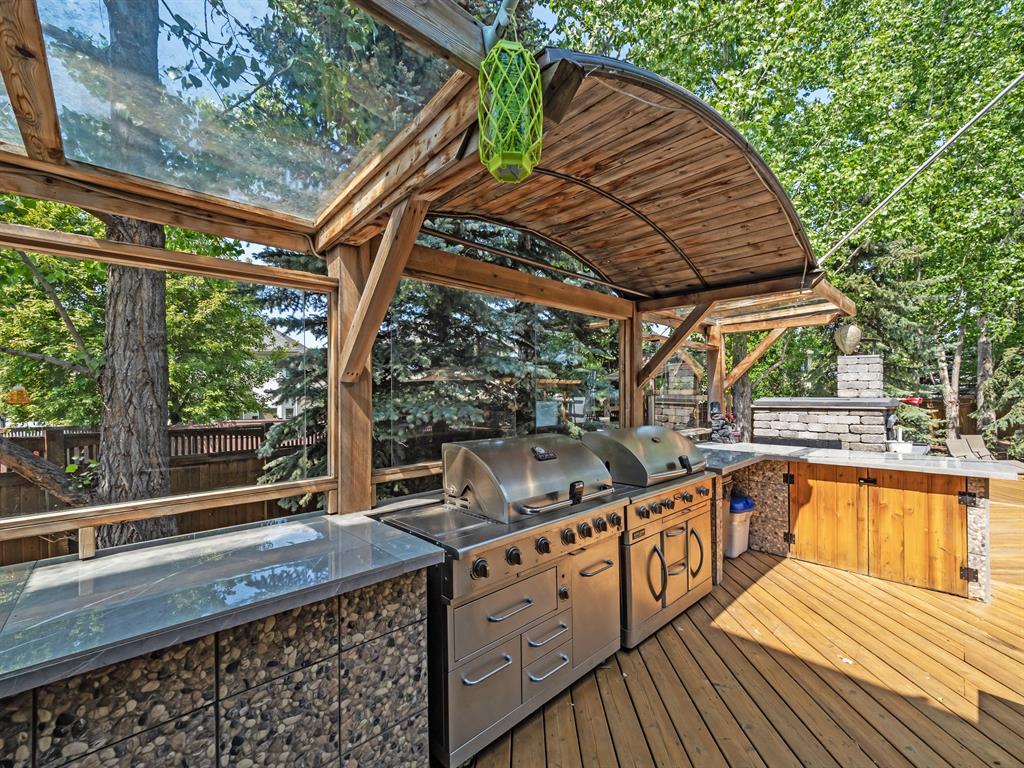 OPEN HOUSE SATURDAY SEPTEMBER 16 1:30 - 4:00. HUGE PRICE REDUCTION!!!. A 500K renovation in 2018 has taken this already beautiful home to the next level of luxury! Seemingly unlimited upgrades, a 3 storey addition and an incredible backyard oasis elevate this home to a timeless classic that will stand the test of time. Ideally situated on a pie-shaped lot within a quiet cul-de-sac, the impressive curb appeal mirrors the attention to detail found throughout. Inside this casually elegant sanctuary is 4,000 sq. ft of thoughtfully developed space. Gleaming hardwood floors are on all 3 levels, no carpet! All 4 bathrooms were lavishly upgraded with travertine tile and quartz countertops. The 100% open concept design is bathed in natural light and kept cool by central air conditioning. The new addition allowed for a huge gourmet kitchen featuring a 10’ centre island, full-height cabinets, quartz countertops and Thermador Professional Series stainless steel appliances that include a gas stove, wall oven, steam oven, warming oven and a built-in espresso machine. Clear sightlines into the living room promote unobstructed conversations while relaxing in front of the gas fireplace. Additional unwinding space is found in the upper level bonus room with a built-in media centre and an expansive 90 degree built-in work/study/gaming area. The primary suite is an indulgent escape, encased in windows that frame the mature landscape and equipped with an opulent ensuite boasting dual sinks, a deep soaker tub, an oversized rain shower and a custom walk-in closet. 3 additional bedrooms on this level ensure plenty of space. Gather in the finished basement with Radiant In-Floor Heating and come together over friendly game nights at the pool table or shuffleboard then grab a snack or refill your drink at the wet bar. A 5th bedroom and another full bathroom, just as stylish as the rest of the home are also on this level. The backyard is simply amazing and will make every day feel like you’re on vacation! French doors off the main floor open to reveal 6,000 sq. ft. of cedar decking leading to an outstanding outdoor kitchen and wood burning pizza oven. Take a dip in the 18’ spa or a relaxing soak in the 8’ x 8’ hot tub. Several umbrellas provide shaded areas followed by a pergola with hammocks. Convene around the built-in firepit on summer evenings. 3 sheds hide away the seasonal clutter – this incredible backyard truly has it all! The oversized garage is insulated and heated with a sink and a huge amount of space for a workshop and storage. Many upgrades were added during the comprehensive renovation including new baseboards, window casings, new roof shingles, new furnaces, air purification, water purification with smart leak detection, direct vent water heaters, neutral paint colour in every interior room, new exterior paint and much, much more! Perfectly located within this family-friendly community close to the resident’s only club, Fish Creek Park, schools, parks, shops and transit! (id:22211)