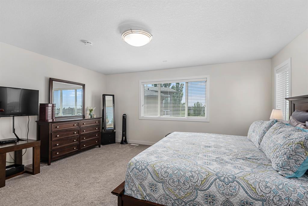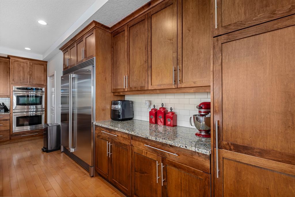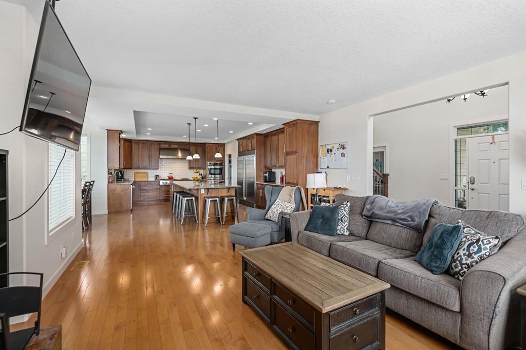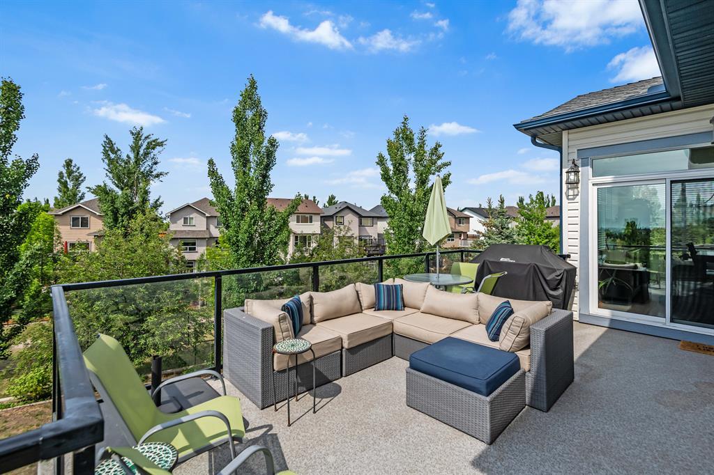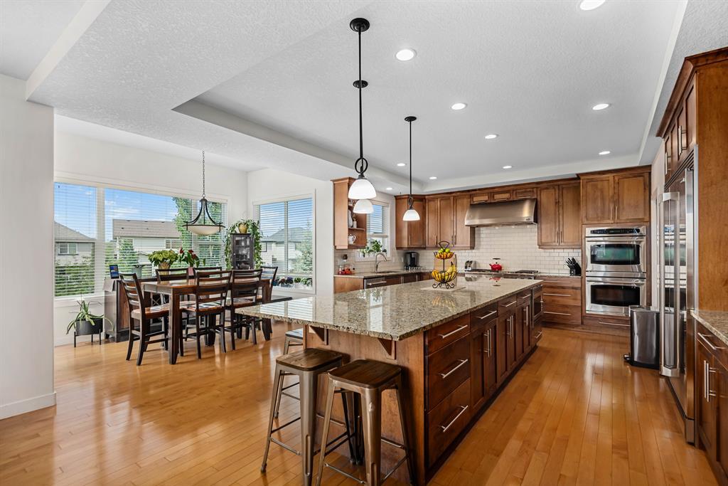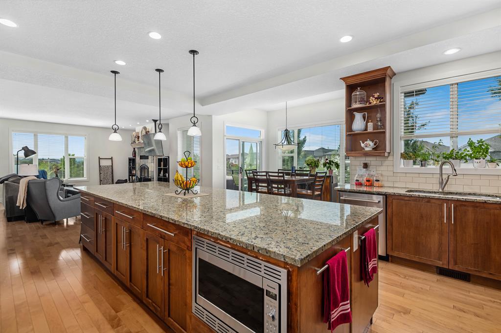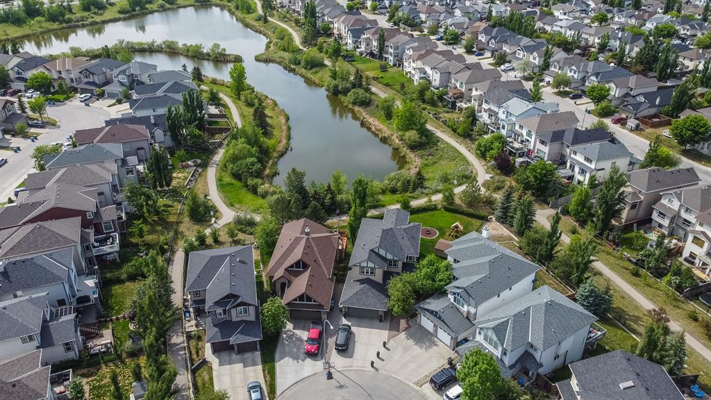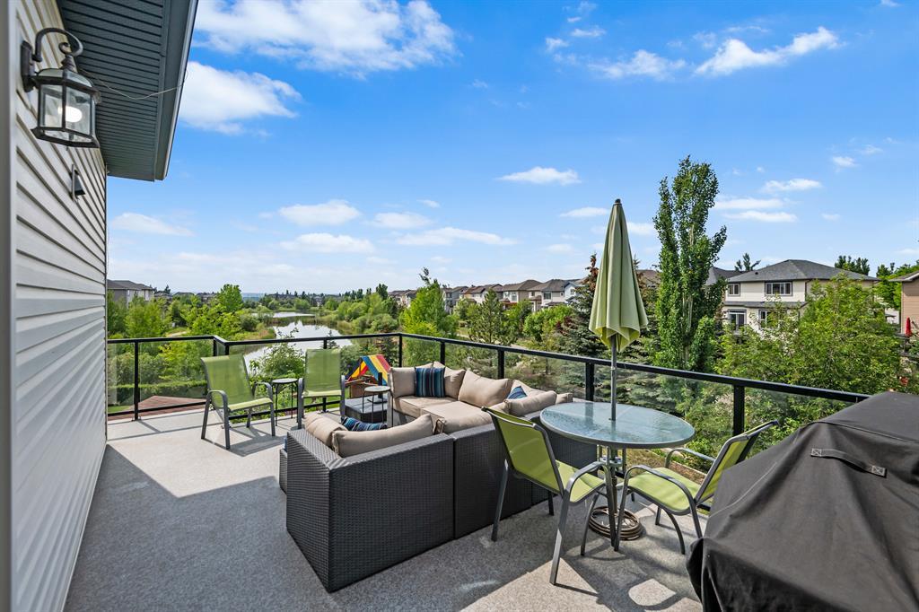 Fully finished WALKOUT home in the desirable community of Cranston! A great family home with over 3800 sqft of developed space, perfectly situated in a CUL-DE-SAC on an enormous PIE LOT with stunning mountain and pond views. This lovingly cared for home includes a dream kitchen with a 13 ft granite island, stainless steel appliances, huge refrigerator, smart layout, large walk through pantry and an open concept main floor – an entertainer’s dream! You’ll have AIR-CONDITIONED hot summers and energy efficient radiant floor heating for our cozy winters. Upstairs new carpet greets you, 4 spacious bedrooms, including a primary bedroom complete with a walk-in closet and ensuite. You'll love the convenience of having a laundry room on the same level as the bedrooms! Lower level with a WALKOUT offers new carpet, a large rec room, 5th bedroom and 4 piece bathroom. Tons of storage space that could be developed into a 6th bedroom if needed. The west facing backyard backs into the pond, giving you direct access to a serene walking/biking path to enjoy! Your spacious yard is perfect for family BBQs, entertaining and enjoying the great outdoors. An OVERSIZED attached double car garage and a paved driveway provide ample space for parking. Steps from Cranston School (K-5), Dr. George Stanley School (6-9), Christ the King Catholic School (K-9), easy access to highway, shopping, transit and parks - all the amenities your growing family needs! schedule a viewing today and make this house your forever home! (id:22211)