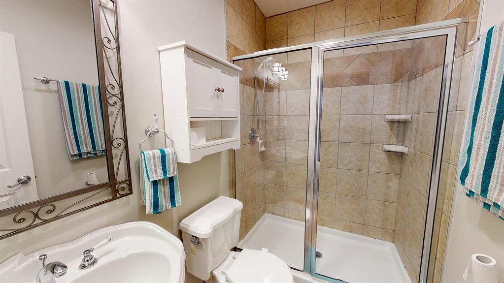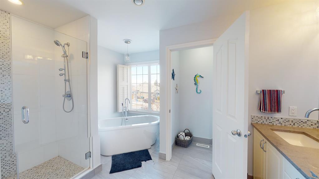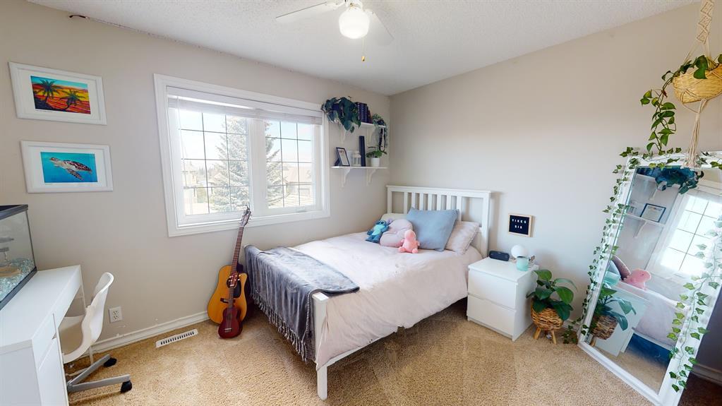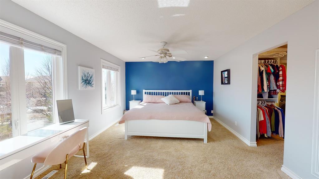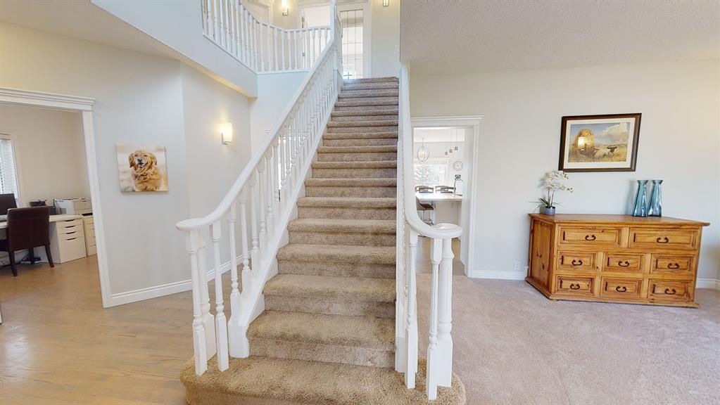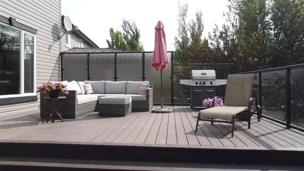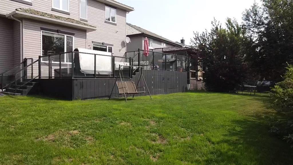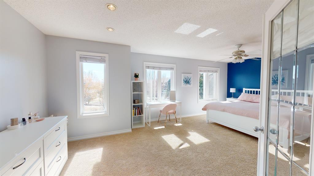**Make your First Visit through the 3D tour** Rare opportunity to own this large and beautiful Lake Access home that is just 3 homes away from the shared dock in the heart of Lake Chaparral. This home has gone through quality renovations and has many upgrades throughout. Decorated in neutral colours, this home is sure to appeal to various decorating styles. Upon entry you will discover sanded and re-stained hardwood floors that carry you throughout the main floor along with 9 ft ceilings. In the front room there are opportunities that await the needs of your family, be it a front office, a dining room, a private sitting room, or a music room, the choice is yours! Continue to the back of the home where you will find the large kitchen with white cabinets, white quartz countertops, tiled backsplash, stately hood fan, stainless steel appliances and an enormous island with breakfast bar seating. The dining area is opened onto the kitchen allowing for countertop to table meals. Take the door outside to find a sunny south pie shaped backyard with huge deck, built in hot tub and private lake access to Lake Chaparral. Not only do you have your own exclusive lake access but you also get a nice park area between you and the other homes for that extra privacy unlike other lake access homes in Chaparral. Back inside, you can enjoy your time in the family room, which has a centered fireplace, loads of light from its large window and additional windows on either side of the fireplace. There is a main floor den that is spacious and allows for both a desk and multiple storage units. The main floor mud room is ready to handle a large family as there is a bench for seating, multiple storage spaces, and hooks for jackets or backpacks. Take the carpeted stairs up to find three bedrooms, including a primary bedroom with double French door entry. In the primary bedroom, you will be delighted to find large windows, a walk-through closet with a hidden laundry room that allows for the co nvenience of that chore to be on the upper level, as well as a renovated ensuite that has heated floors, a large glass shower, a soaker tub and a private toilet. The two kids room are a good size and share another renovated 4 pce bathroom. Downstairs there is an additional bedroom as well as two large lifestyle rooms, currently being used for a workout room and an awesome Movie room with a cozy fireplace . This home provides comfortable living for all, has been well taken care of and is located in a distinguished part of Lake Chaparral. The front driveway is oversized and can fit 4 cars, your boat or RV. It has ON demand hot water, fresh painting and AC. Close to the schools, stores, Fish Creek Park, major roadways and the hospital. Lake access homes don't come up very often in this price range. Do this for the family, you won't regret it! (id:22211)