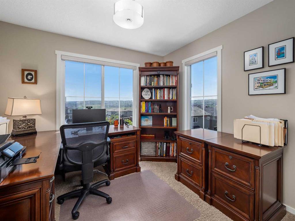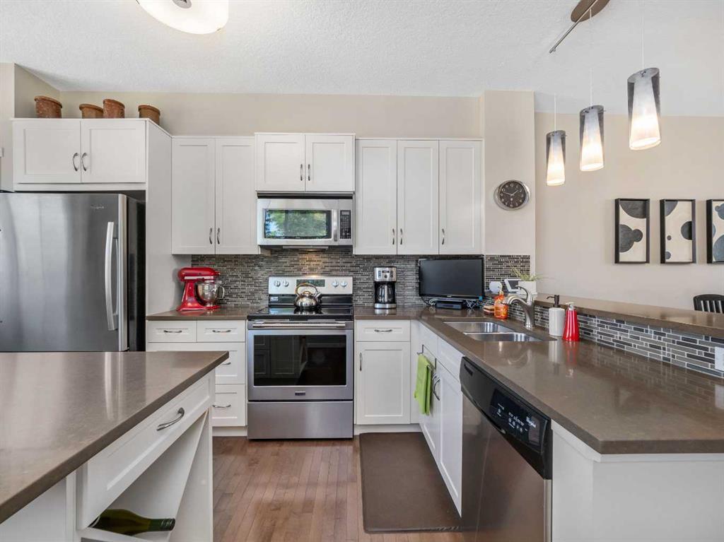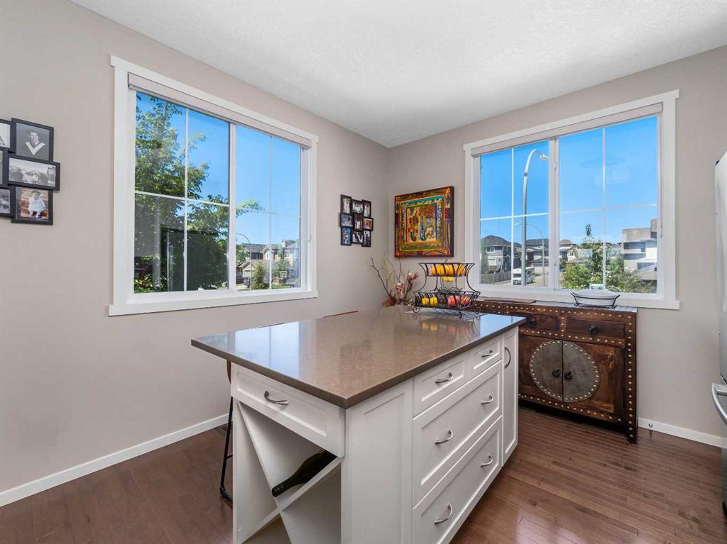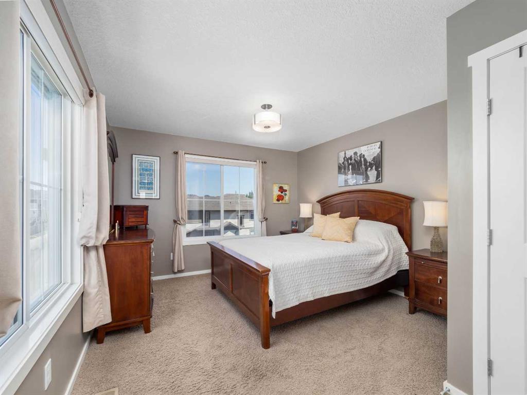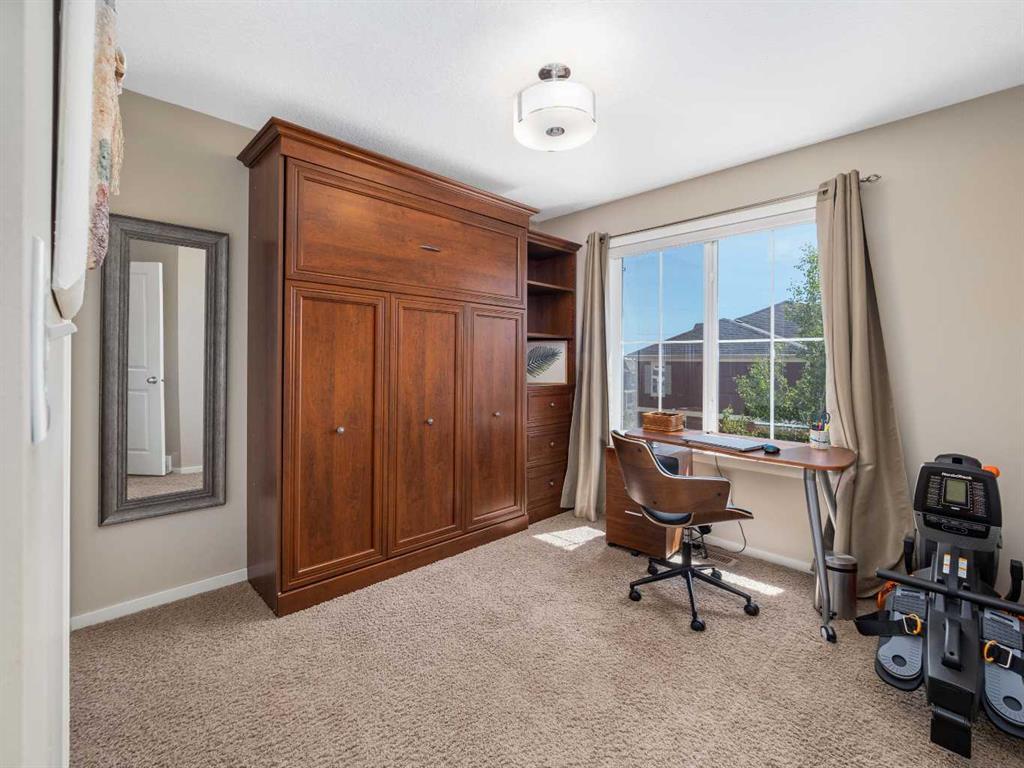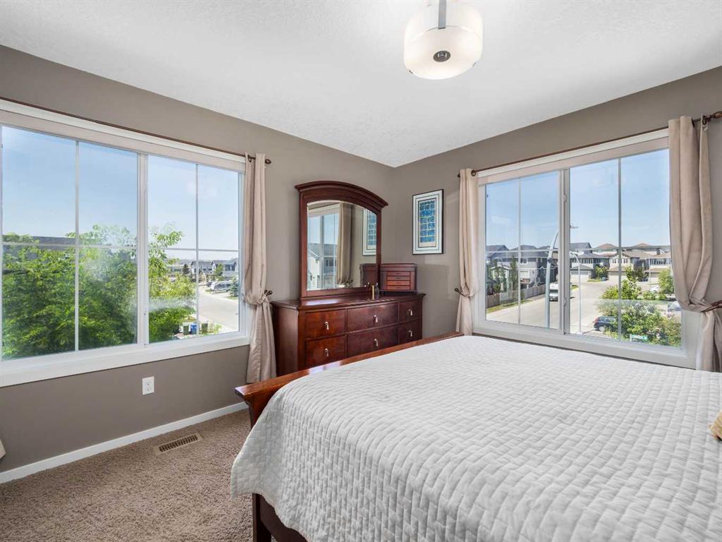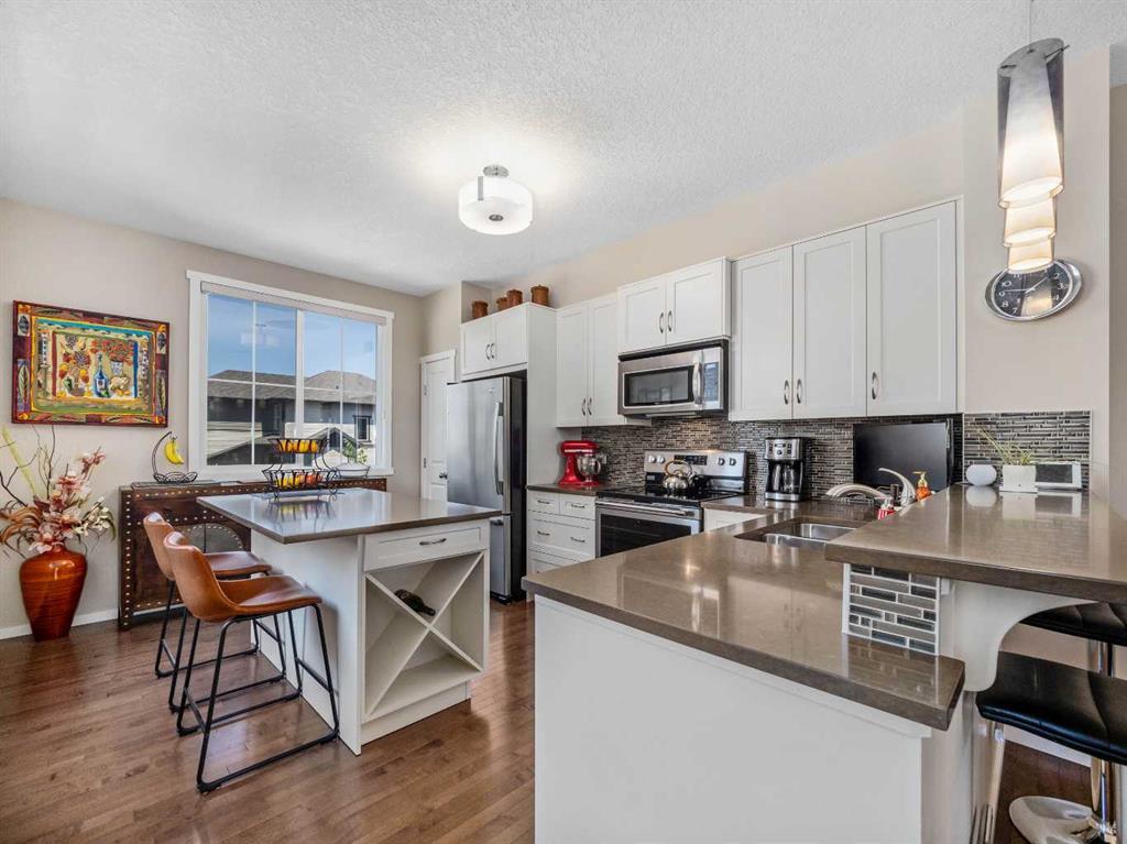 Welcome to 56 Evansview Rd NW. This corner unit townhome has only had one owner and the pride of ownership is evident. This townhome epitomizes elegance, sophistication, and contemporary living. This property offers a host of exceptional features, including 3 bedrooms and 2.5 bathrooms, a double tandem garage, stainless steel appliances, and breathtaking views. Additional features include custom surround sound speakers in the living room, Upgraded lighting throughout the house and Central A/C and VAC. The open kitchen boasts a custom built-in island as well as a breakfast bar, good cabinet storage, a pantry and beautiful Caesar stone countertops. Enjoy the adjacent dining area and large, bright living room on the main floor with built-in custom surround sound speakers, as well as well-kept hardwood floors. This leads to a south facing balcony that has always been well maintained with exceptional views and a convenient gas line for a BBQ. 9 ft ceilings and a half bath complete this level. Upstairs you will find three good sized bedrooms with large windows to take in the amazing views, one of which has an upgraded Murphy bed. Also included are two full bathrooms. One being the ensuite of the master bedroom which is accompanied with a walk in closet. The hallway has convenient laundry with high end LG steam washer and dryer and linen/storage closets. The heated double tandem garage is fully drywalled and has plenty of built in storage as well as an extra wide nook. You will also find a full size driveway and additional off-street parking, perfect for guests! Enjoy the green space close by, with easy access to pathways, and a short walk to shopping, schools, and transit. All amenities, shopping/grocery stores, parks/greenspace are within walking distance. Quick access to major roads, including Stoney Trail, Deerfoot Trail, Country Hills Blvd, and Beddington Trail, complete this desirable property. This one is a must see! Don't miss out on the chance to make this amazing property your own, book your showing today! (id:22211)