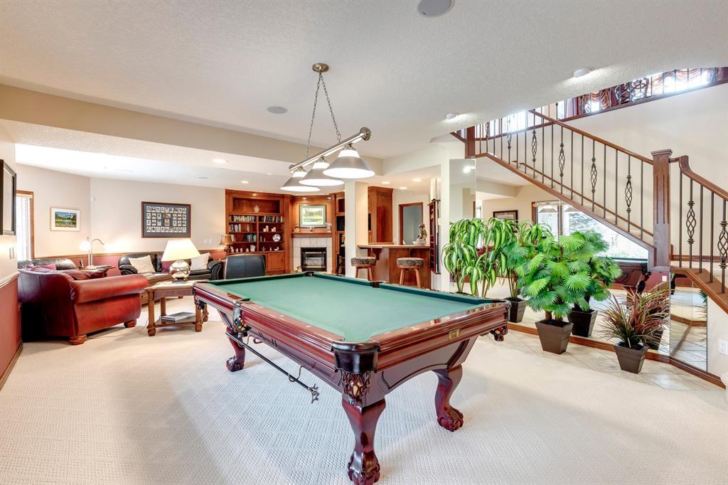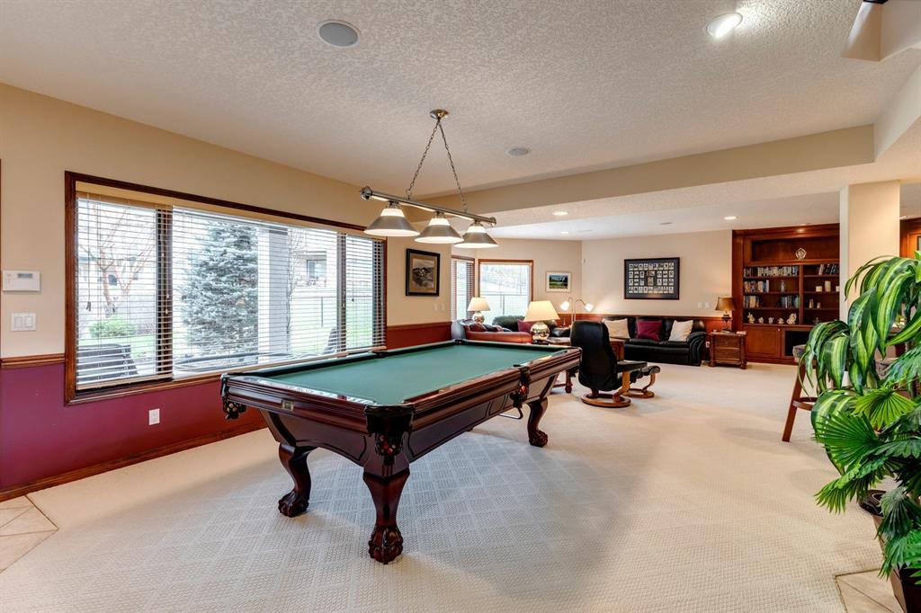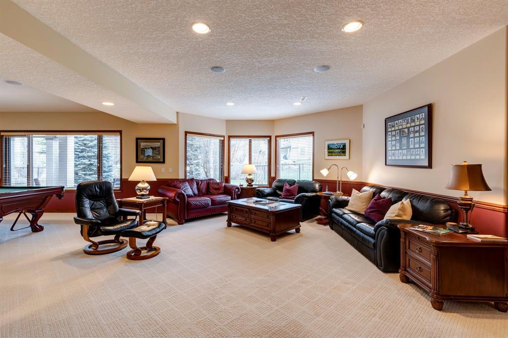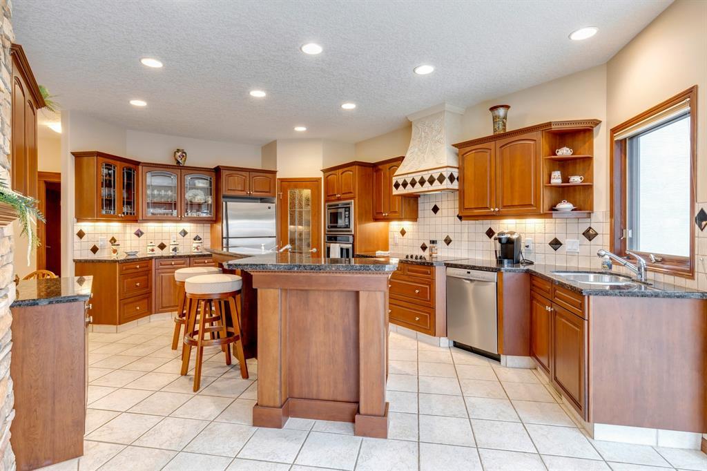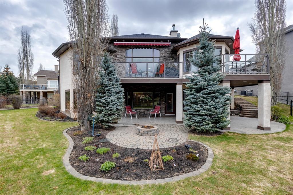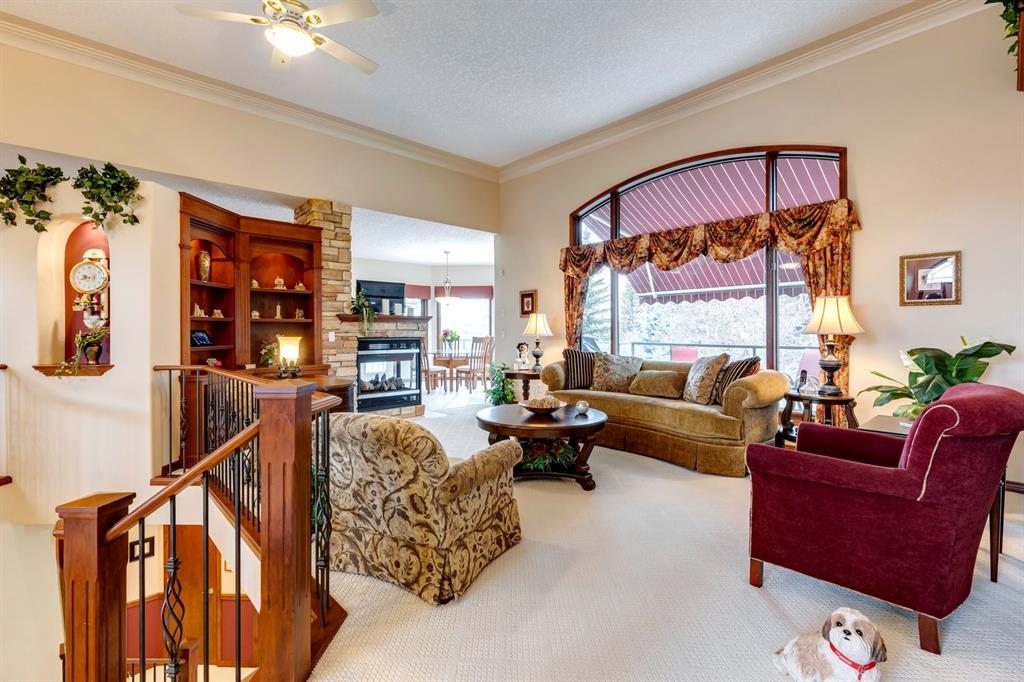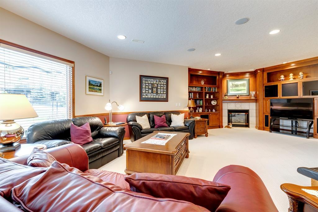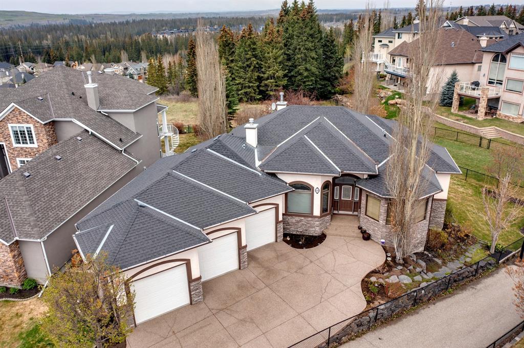 Welcome to Discovery Ridge, a neighbourhood known for its natural parks, pathways and wildlife. This stunning west facing bungalow with a walk-out basement backs onto a green space, a walking path, and features an oversized triple garage. The property is beautifully landscaped with mature trees and flower beds. Enjoy the outdoors from the upper patio shaded by a retractable awning, or warm yourself by the fire-pit located beside the covered patio. As you enter the home, the foyer is flanked by a private home office/den. The formal dining room is ideal for intimate dinner parties. Step into the inviting open concept living room which features soaring 12’ ceilings, built-in bookcases, and a double-sided fireplace. The large kitchen has wood cabinets, stainless appliances, granite counters, tile flooring, dual sinks, and a walk-thru pantry that connects to the mudroom/laundry space. Serve casual meals in the sunny dining nook or at the breakfast bar. The main floor primary bedroom is surrounded by windows, offering plenty of natural light and stunning views. It also features a spacious 5-piece ensuite and walk-in closet. One of the best features of the property is the sizeable walk-out basement with in-floor heat, offering lots of hang-out space, complete with a family room, fireplace, bar, and a recreation room for your pool table. There are also two additional bedrooms, a hobby room (currently being used as an extra guest room), and ample storage space in the lower level. Car enthusiasts will appreciate the oversized triple garage, providing plenty of space for vehicles and storage. Other features of the home include air conditioning and an irrigation system. This home offers the ease of main floor living and a peaceful retreat from the bustle of everyday life. (id:22211)