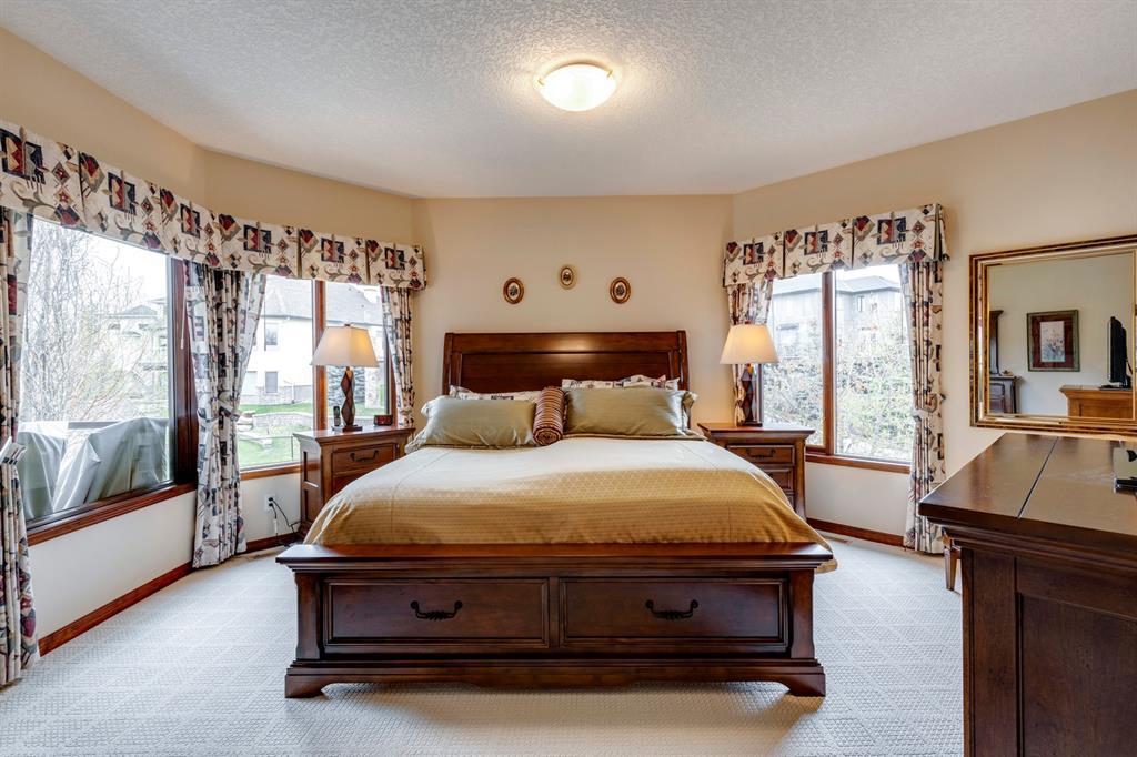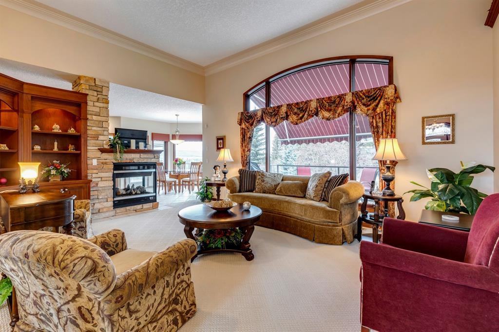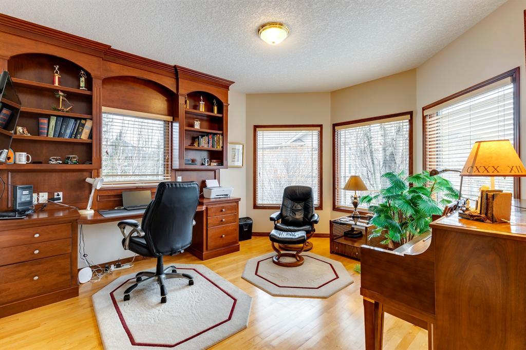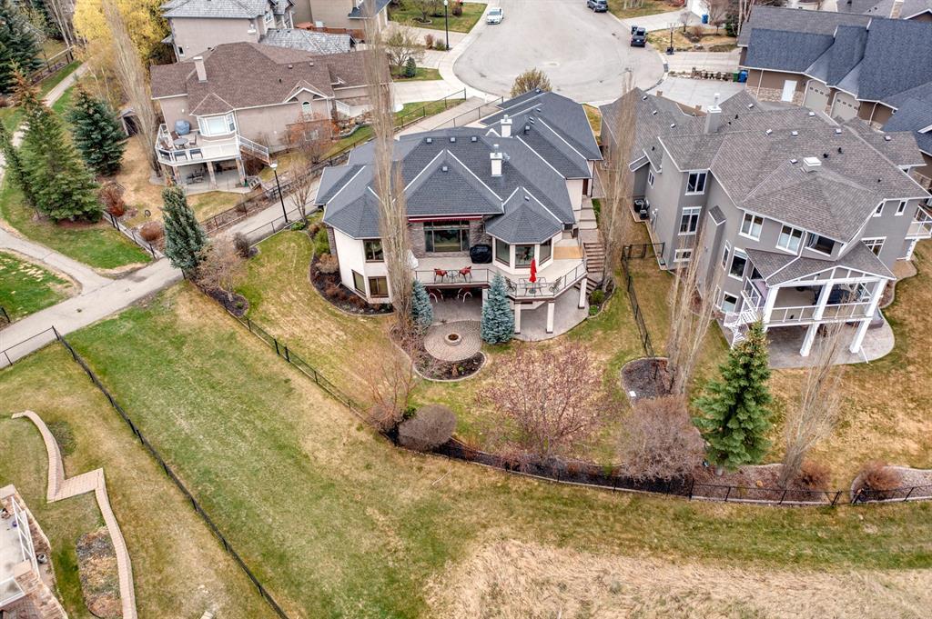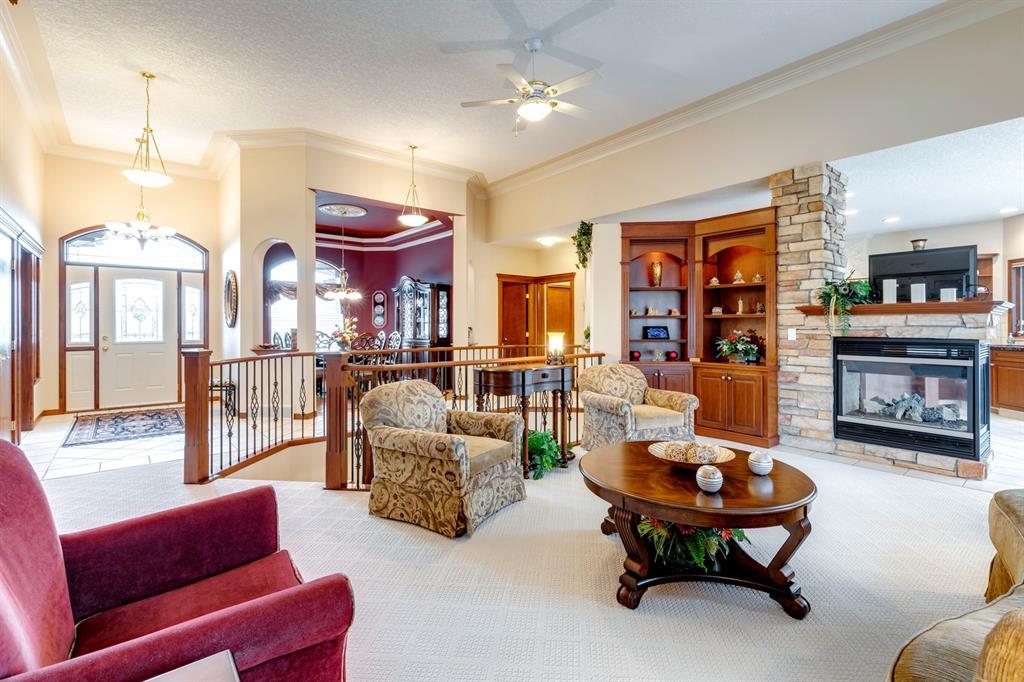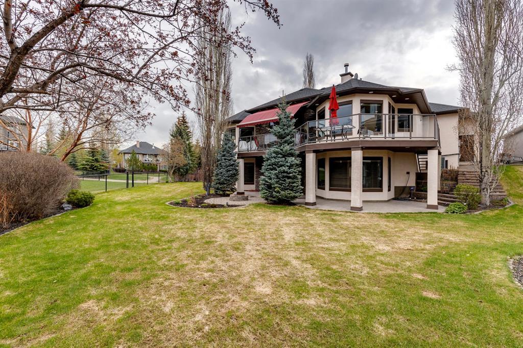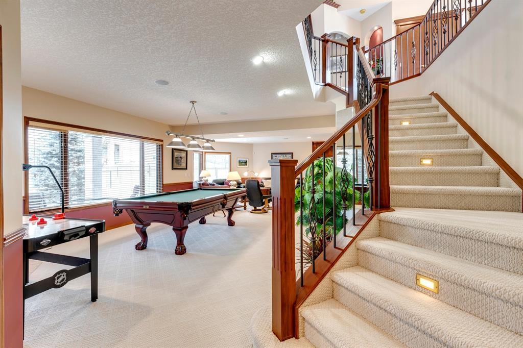 Welcome to Discovery Ridge, a neighbourhood known for its natural parks, pathways and wildlife. This stunning west facing bungalow with a walk-out basement backs onto a green space, a walking path, and features an oversized triple garage. The property is beautifully landscaped with mature trees and flower beds. Enjoy the outdoors from the upper patio shaded by a retractable awning, or warm yourself by the fire-pit located beside the covered patio. As you enter the home, the foyer is flanked by a private home office/den. The formal dining room is ideal for intimate dinner parties. Step into the inviting open concept living room which features soaring 12’ ceilings, built-in bookcases, and a double-sided fireplace. The large kitchen has wood cabinets, stainless appliances, granite counters, tile flooring, dual sinks, and a walk-thru pantry that connects to the mudroom/laundry space. Serve casual meals in the sunny dining nook or at the breakfast bar. The main floor primary bedroom is surrounded by windows, offering plenty of natural light and stunning views. It also features a spacious 5-piece ensuite and walk-in closet. One of the best features of the property is the sizeable walk-out basement with in-floor heat, offering lots of hang-out space, complete with a family room, fireplace, bar, and a recreation room for your pool table. There are also two additional bedrooms, a hobby room (currently being used as an extra guest room), and ample storage space in the lower level. Car enthusiasts will appreciate the oversized triple garage, providing plenty of space for vehicles and storage. Other features of the home include air conditioning and an irrigation system. This home offers the ease of main floor living and a peaceful retreat from the bustle of everyday life. (id:22211)