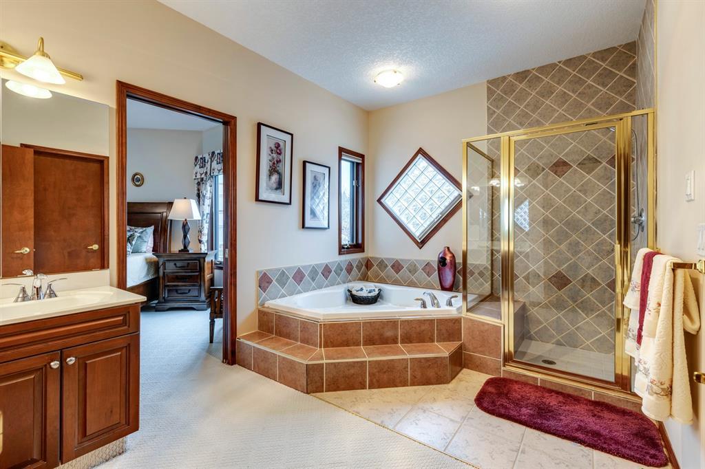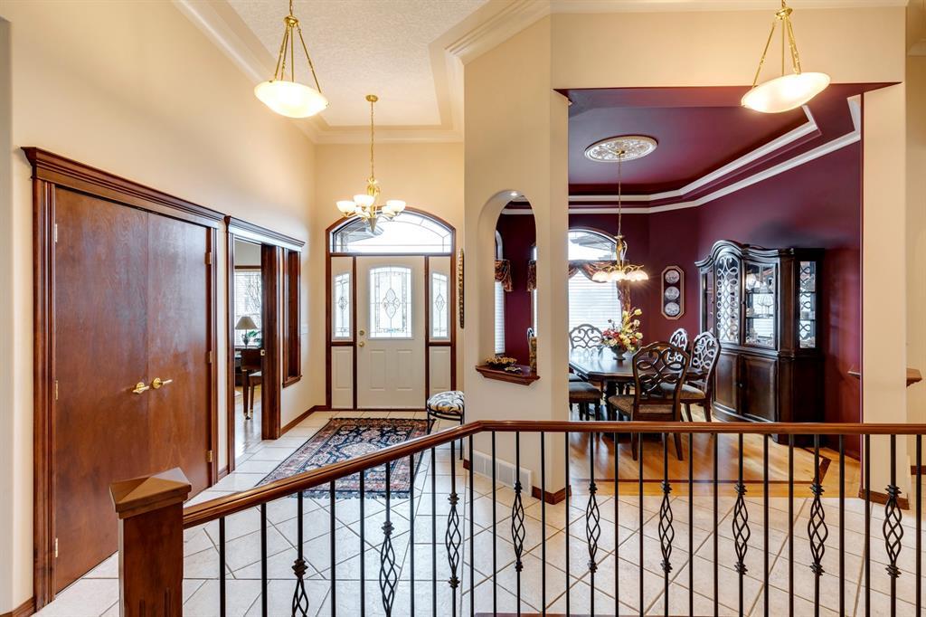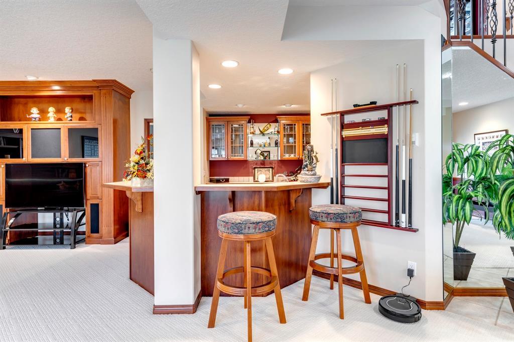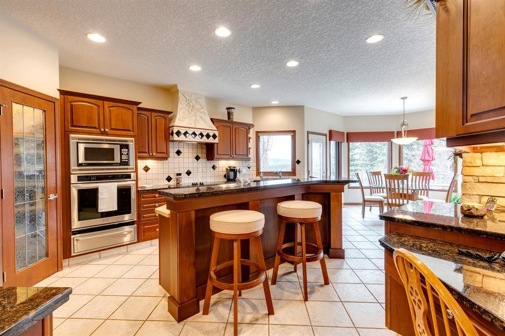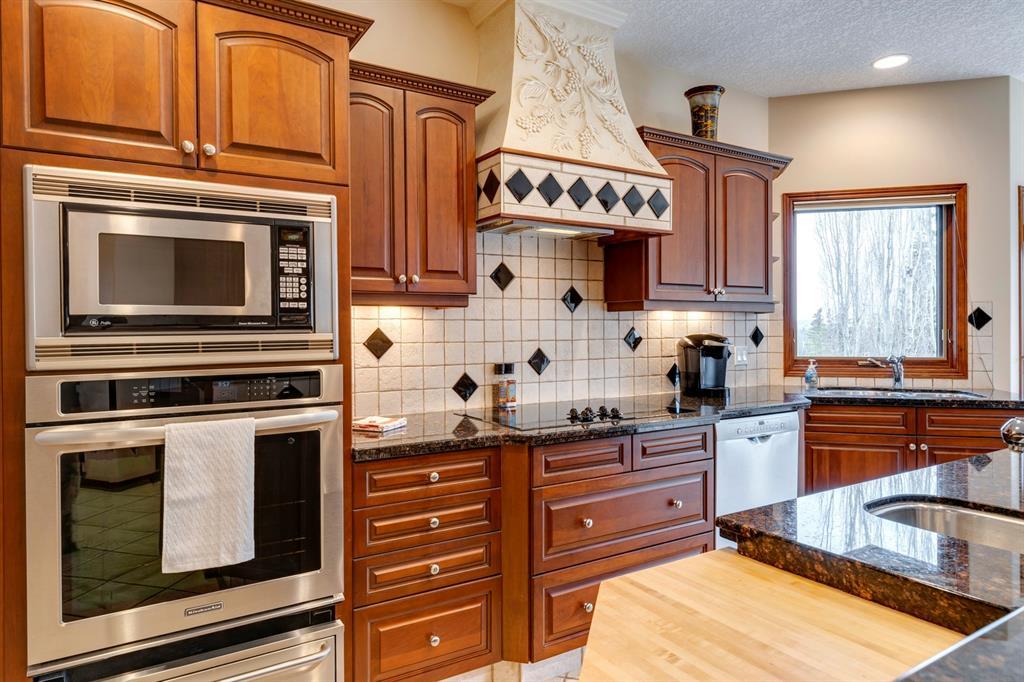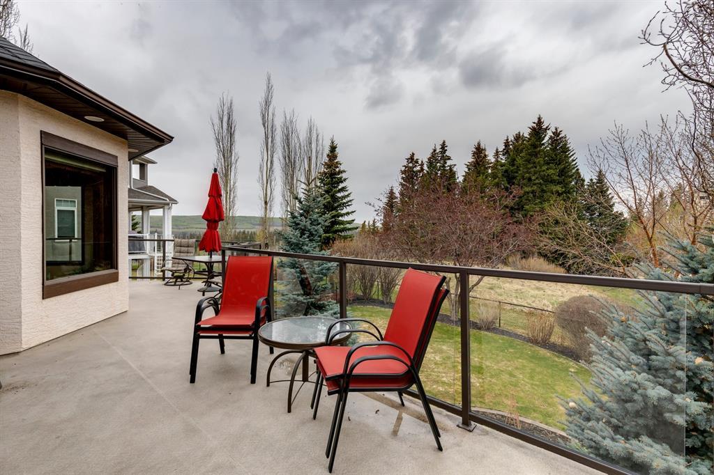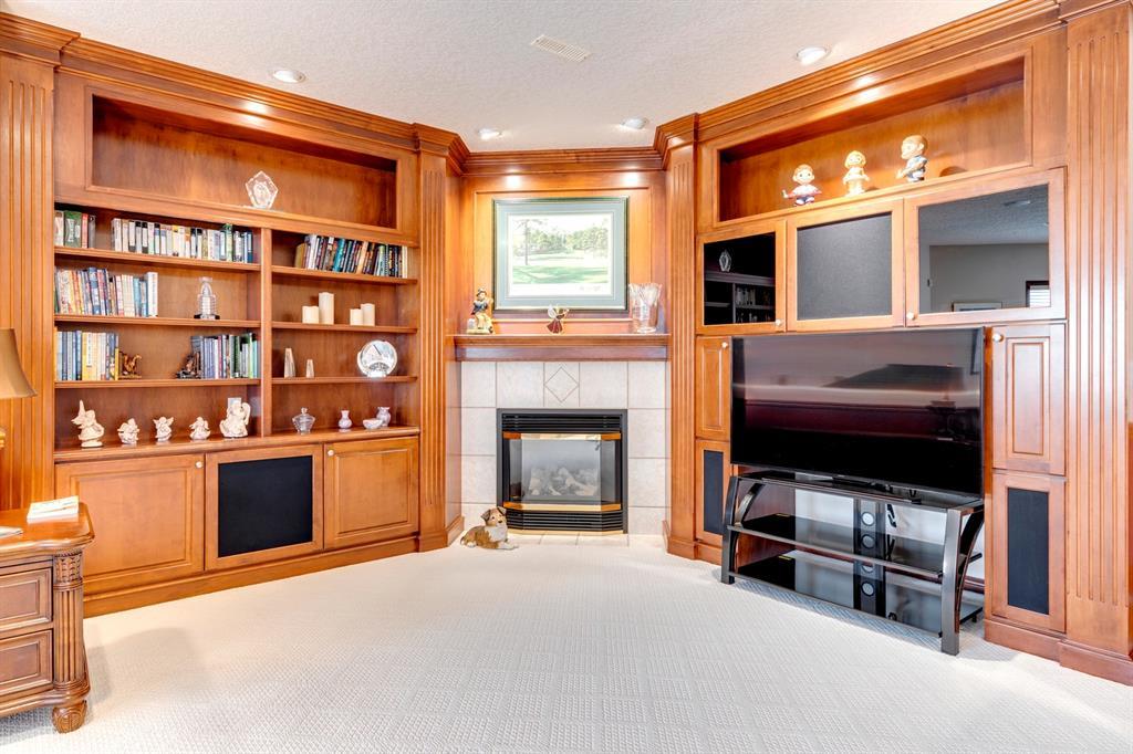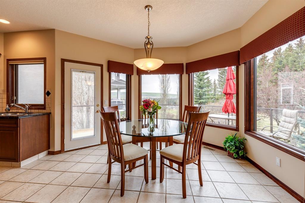 Welcome to Discovery Ridge, a neighbourhood known for its natural parks, pathways and wildlife. This stunning west facing bungalow with a walk-out basement backs onto a green space, a walking path, and features an oversized triple garage. The property is beautifully landscaped with mature trees and flower beds. Enjoy the outdoors from the upper patio shaded by a retractable awning, or warm yourself by the fire-pit located beside the covered patio. As you enter the home, the foyer is flanked by a private home office/den. The formal dining room is ideal for intimate dinner parties. Step into the inviting open concept living room which features soaring 12’ ceilings, built-in bookcases, and a double-sided fireplace. The large kitchen has wood cabinets, stainless appliances, granite counters, tile flooring, dual sinks, and a walk-thru pantry that connects to the mudroom/laundry space. Serve casual meals in the sunny dining nook or at the breakfast bar. The main floor primary bedroom is surrounded by windows, offering plenty of natural light and stunning views. It also features a spacious 5-piece ensuite and walk-in closet. One of the best features of the property is the sizeable walk-out basement with in-floor heat, offering lots of hang-out space, complete with a family room, fireplace, bar, and a recreation room for your pool table. There are also two additional bedrooms, a hobby room (currently being used as an extra guest room), and ample storage space in the lower level. Car enthusiasts will appreciate the oversized triple garage, providing plenty of space for vehicles and storage. Other features of the home include air conditioning and an irrigation system. This home offers the ease of main floor living and a peaceful retreat from the bustle of everyday life. (id:22211)