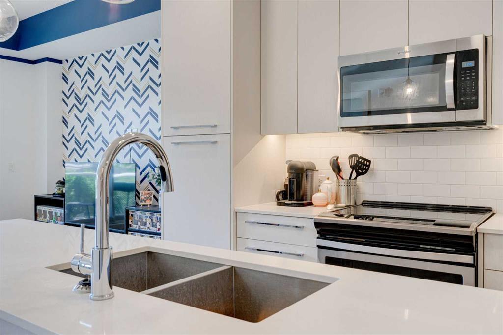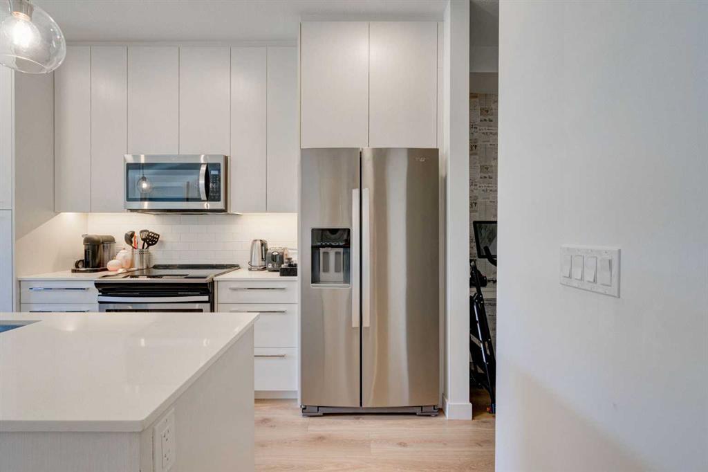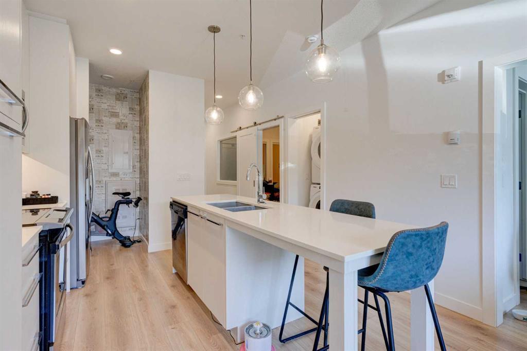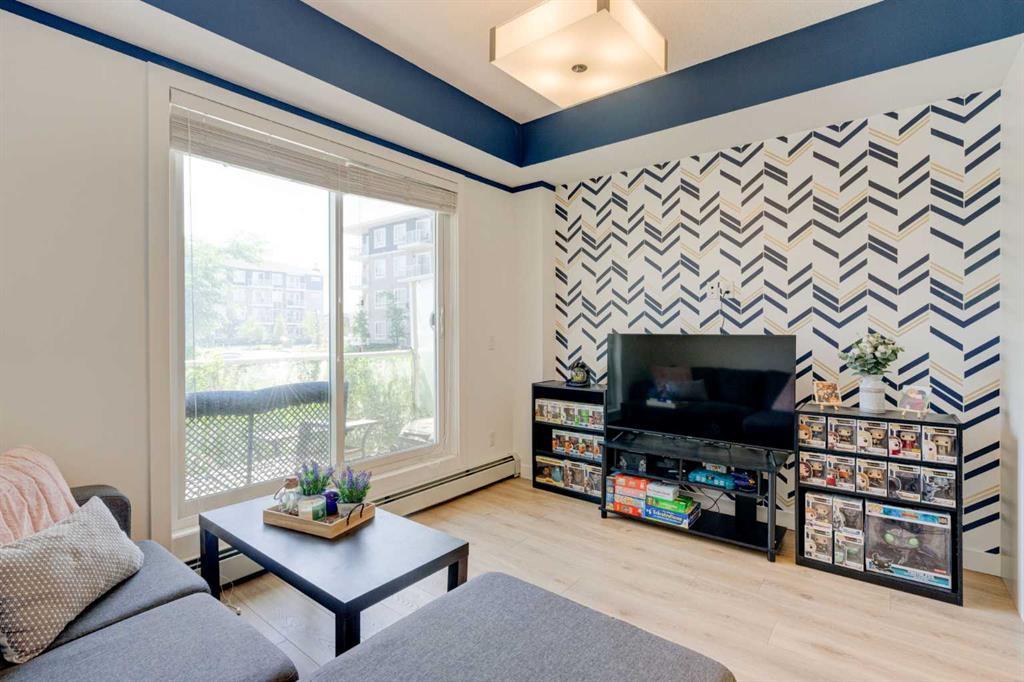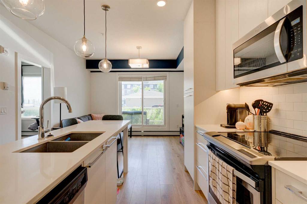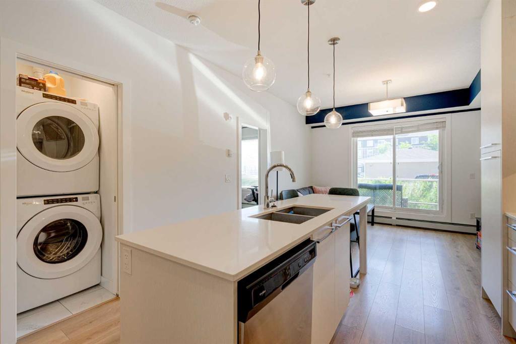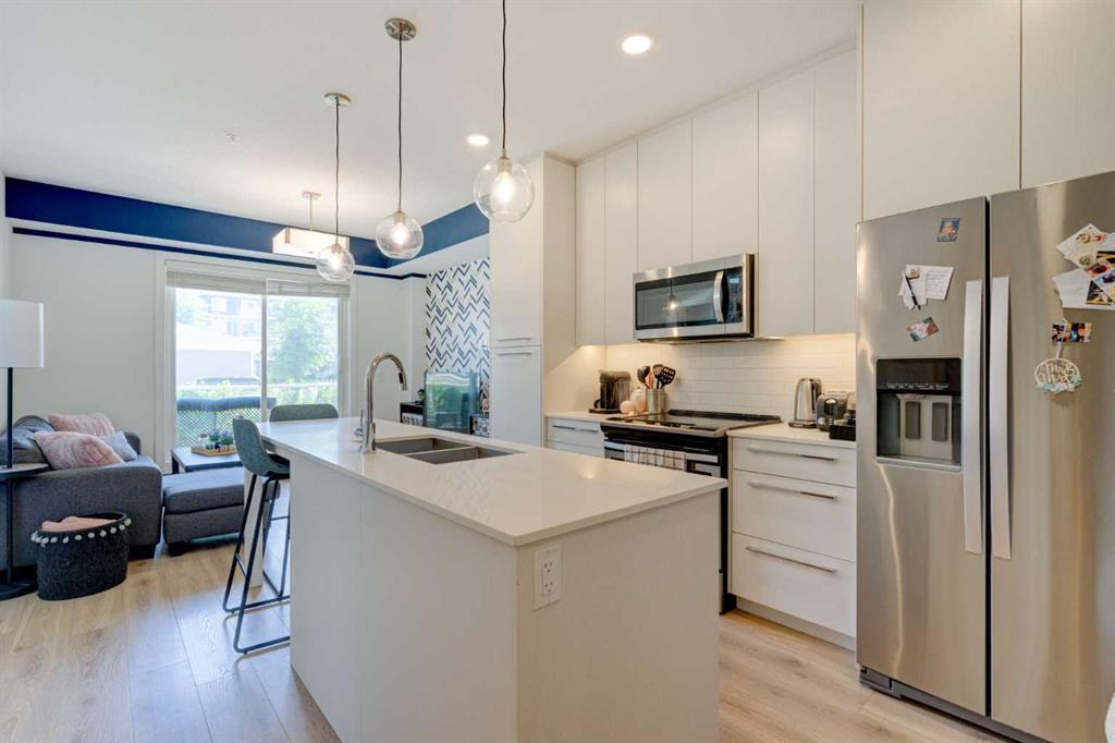 Welcome to Cornerstone! This like-new 2 bed, 2 bathroom main floor unit is perfect for first-time homebuyers or investors. Built in 2021 by Truman Homes, the unit offers quality finishings throughout. Step into 9 ft high ceilings, energy-efficient windows, oversized doors/patio sliders, and high-quality laminate hardwood with acoustic underlay throughout all living areas. The trendy kitchen opens to the living room with a large center island and a built-in eating bar. The kitchen offers many features, including polished hard surface quartz countertops, an integrated pull-out garbage bin under the sink, a contemporary imported ceramic tile custom kitchen backsplash, and an under mount stainless steel sink with an industrial high arc single lever pull-out faucet. Award-winning kitchen cabinetry design with L.A. colour palettes showcases floor-to-ceiling ergonomic TRUspace™ contemporary kitchen cabinetry featuring premium finishes, accented by soft close door and drawer hardware and integrated storage. Appliances include an energy-saving integrated Whirlpool® stainless steel package in the kitchen and an ultra-quiet in-suite Energy Star® front-load stacking washer and dryer. The living room with a beautiful feature wall leads to your private main floor patio. The primary bedroom has a 4 pc ensuite bathroom and a large closet for convenience. A second bedroom and additional bathroom complete the unit. An underground titled parking stall and storage unit are also included. This pet-friendly building has a pet spa (pets require board approval). Other building amenities include a garden, owner’s lounge with entertainment kitchen, movie theatre/library reading area, children’s playroom, teen zone, bike room & workshop, fitness centre, movement studio, and spin studio. (id:22211)