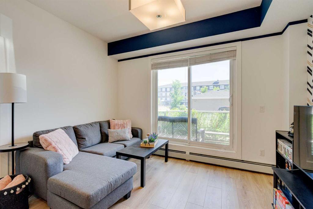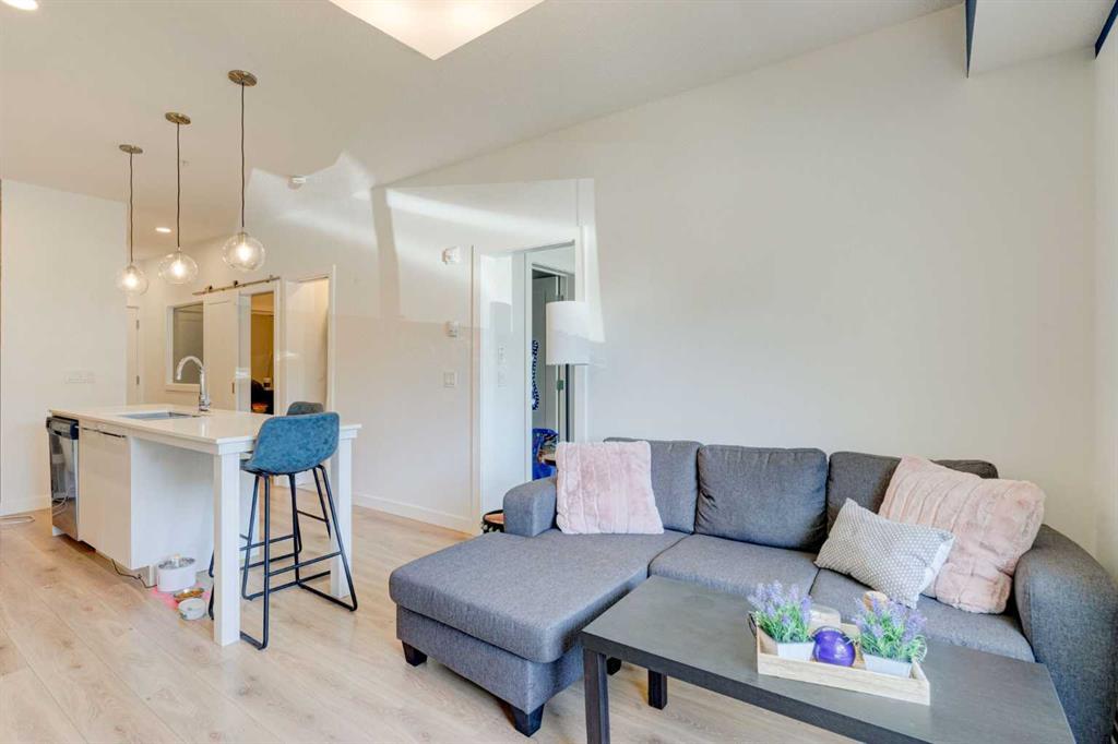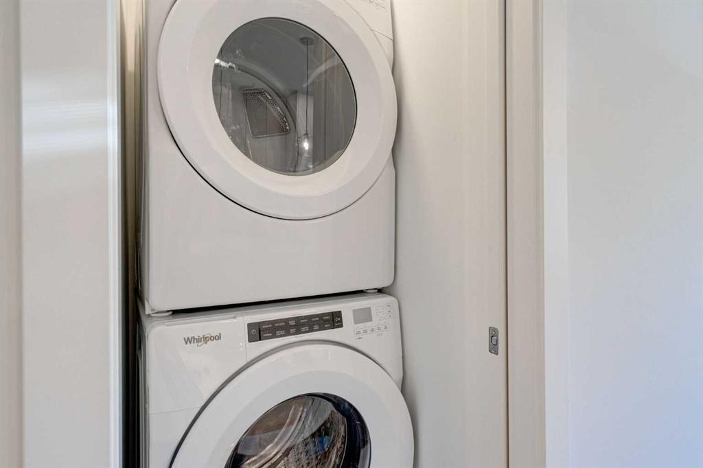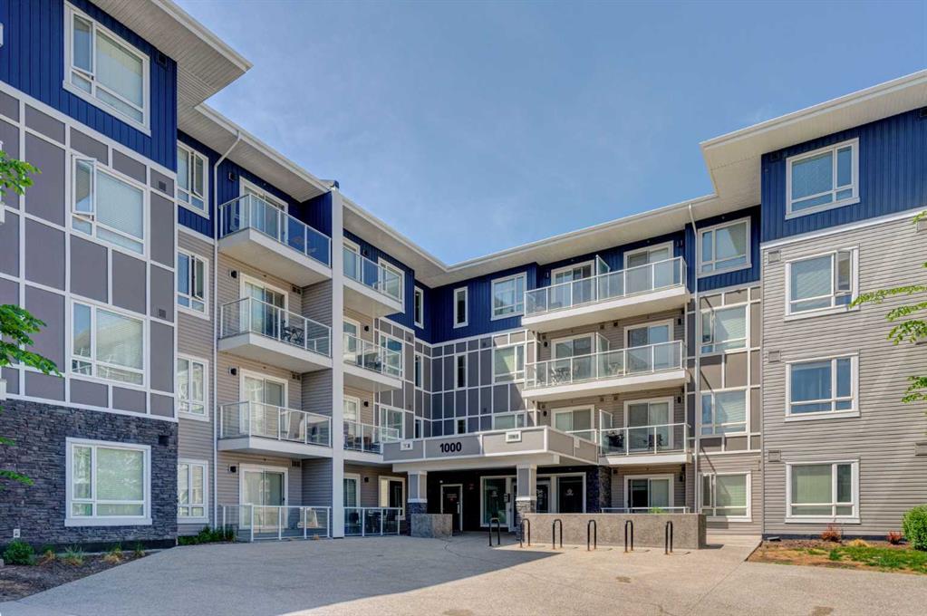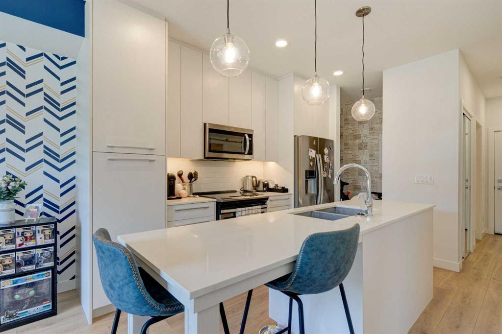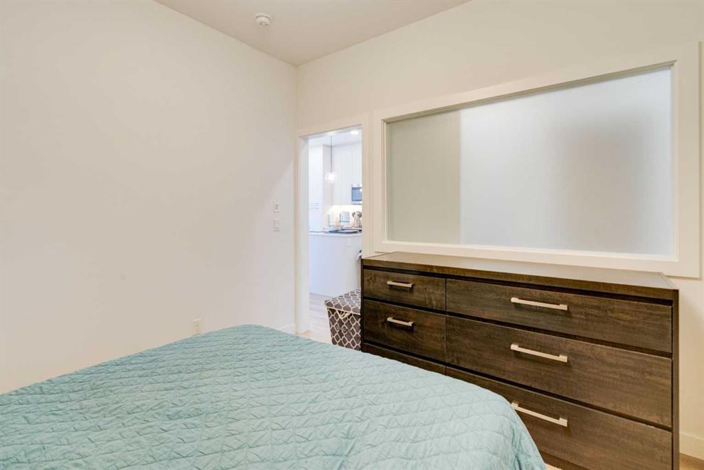Welcome to Cornerstone! This like-new 2 bed, 2 bathroom main floor unit is perfect for first-time homebuyers or investors. Built in 2021 by Truman Homes, the unit offers quality finishings throughout. Step into 9 ft high ceilings, energy-efficient windows, oversized doors/patio sliders, and high-quality laminate hardwood with acoustic underlay throughout all living areas. The trendy kitchen opens to the living room with a large center island and a built-in eating bar. The kitchen offers many features, including polished hard surface quartz countertops, an integrated pull-out garbage bin under the sink, a contemporary imported ceramic tile custom kitchen backsplash, and an under mount stainless steel sink with an industrial high arc single lever pull-out faucet. Award-winning kitchen cabinetry design with L.A. colour palettes showcases floor-to-ceiling ergonomic TRUspace™ contemporary kitchen cabinetry featuring premium finishes, accented by soft close door and drawer hardware and integrated storage. Appliances include an energy-saving integrated Whirlpool® stainless steel package in the kitchen and an ultra-quiet in-suite Energy Star® front-load stacking washer and dryer. The living room with a beautiful feature wall leads to your private main floor patio. The primary bedroom has a 4 pc ensuite bathroom and a large closet for convenience. A second bedroom and additional bathroom complete the unit. An underground titled parking stall and storage unit are also included. This pet-friendly building has a pet spa (pets require board approval). Other building amenities include a garden, owner’s lounge with entertainment kitchen, movie theatre/library reading area, children’s playroom, teen zone, bike room & workshop, fitness centre, movement studio, and spin studio. (id:22211)