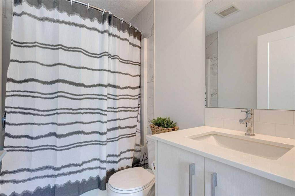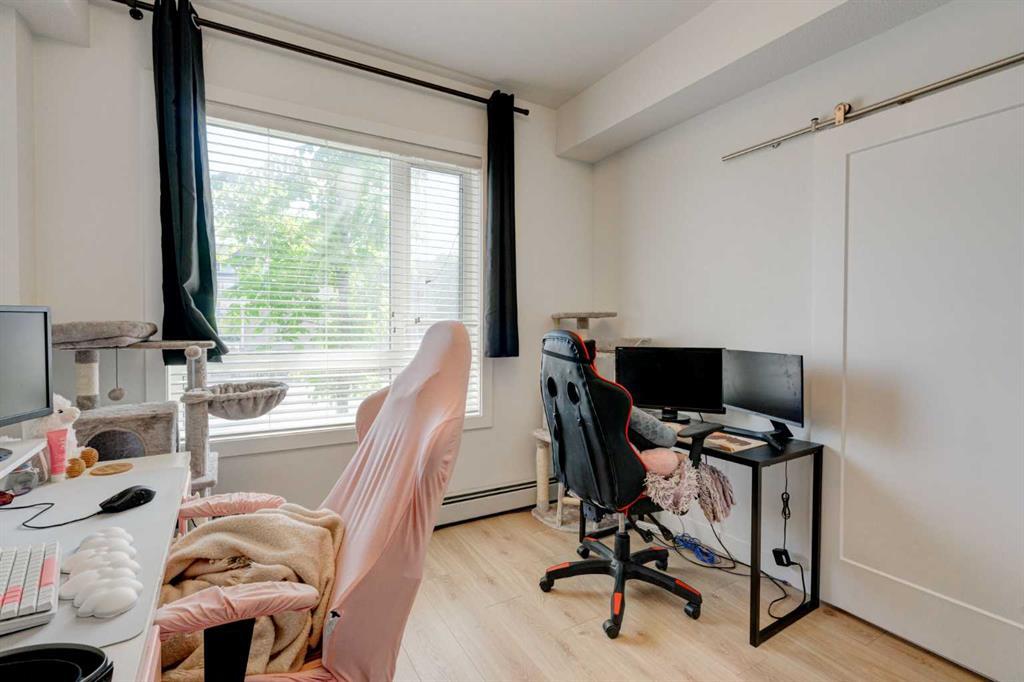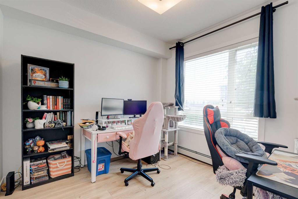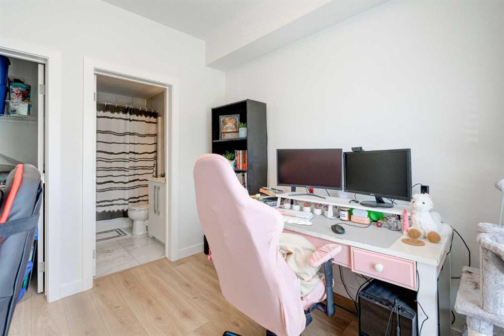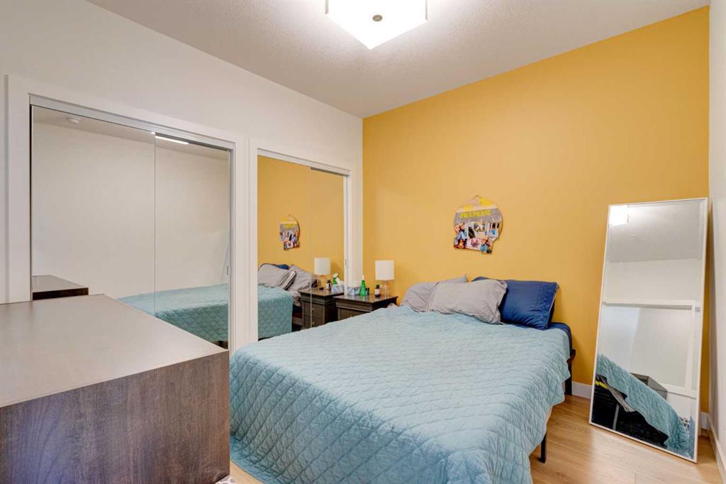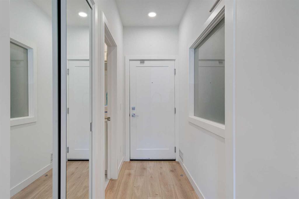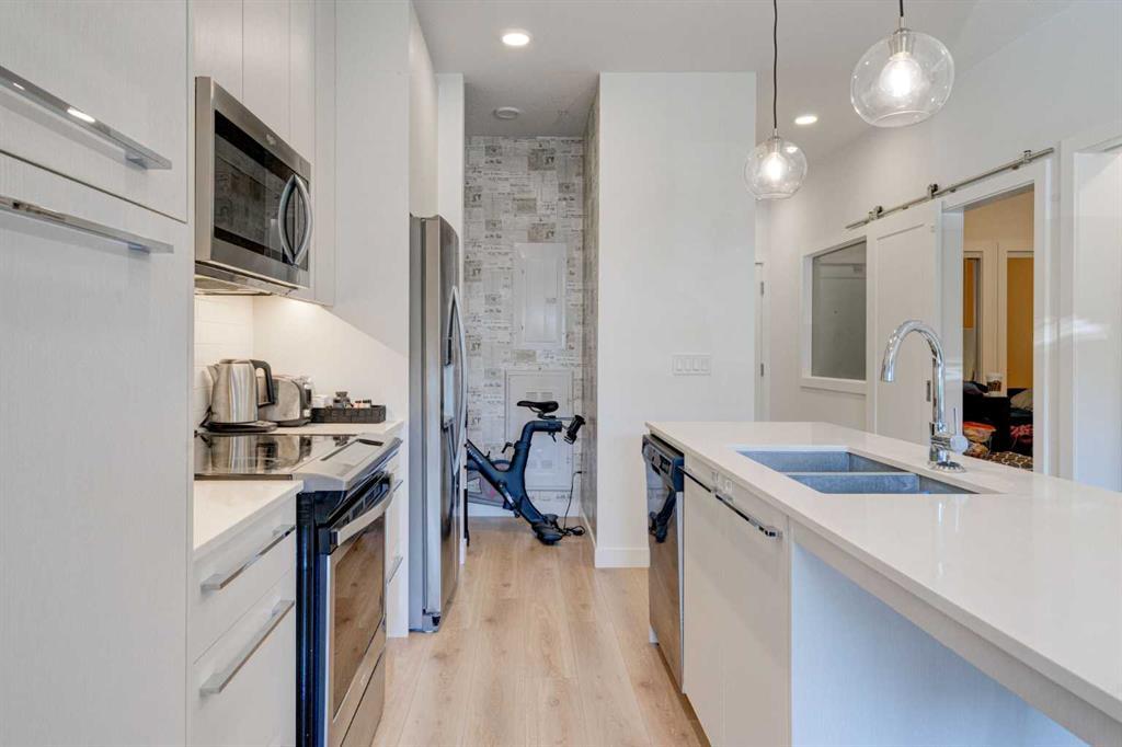 Welcome to Cornerstone! This like-new 2 bed, 2 bathroom main floor unit is perfect for first-time homebuyers or investors. Built in 2021 by Truman Homes, the unit offers quality finishings throughout. Step into 9 ft high ceilings, energy-efficient windows, oversized doors/patio sliders, and high-quality laminate hardwood with acoustic underlay throughout all living areas. The trendy kitchen opens to the living room with a large center island and a built-in eating bar. The kitchen offers many features, including polished hard surface quartz countertops, an integrated pull-out garbage bin under the sink, a contemporary imported ceramic tile custom kitchen backsplash, and an under mount stainless steel sink with an industrial high arc single lever pull-out faucet. Award-winning kitchen cabinetry design with L.A. colour palettes showcases floor-to-ceiling ergonomic TRUspace™ contemporary kitchen cabinetry featuring premium finishes, accented by soft close door and drawer hardware and integrated storage. Appliances include an energy-saving integrated Whirlpool® stainless steel package in the kitchen and an ultra-quiet in-suite Energy Star® front-load stacking washer and dryer. The living room with a beautiful feature wall leads to your private main floor patio. The primary bedroom has a 4 pc ensuite bathroom and a large closet for convenience. A second bedroom and additional bathroom complete the unit. An underground titled parking stall and storage unit are also included. This pet-friendly building has a pet spa (pets require board approval). Other building amenities include a garden, owner’s lounge with entertainment kitchen, movie theatre/library reading area, children’s playroom, teen zone, bike room & workshop, fitness centre, movement studio, and spin studio. (id:22211)