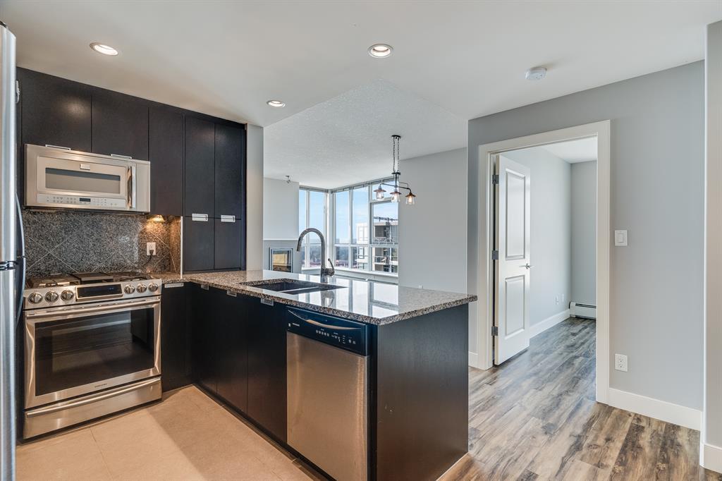 Live in the clouds in the trendy Westgate Park complex of Spruce Cliff. A big entryway opens to a stunning main living space. A modern kitchen (equip with brand new appliances!) is absolutely gorgeous in sleek espresso cabinetry and luxe mottled granite. Impress your guests when you whip up a meal on the gas stove, and conversation flows over the breakfast bar and into huge, bright dining and living areas. Statement lighting and a gas fireplace enhance the chic vibe of this flat, and floor to ceiling windows along the south and west sides flood the entire unit with beautiful natural light. The primary bedroom is large, and features the same luxurious (newly installed) hardwood flooring you’ll see throughout this home, as well as a walk- in closet and great views. The second bedroom is on the other side of the hall, and is equally well- appointed. The bathroom will transport you to a high-end hotel, with more granite, sconce lighting, and tons of lovely tile work as well as a soaker tub. This suite also includes a laundry room with upgraded machines, and sizable closets throughout provide plenty of storage space. On the balcony, the light is amazing all day, with a panorama from the south and around to the west, where you can get a glimpse of the mountains. This condo building has heated underground parking, convenient storage lockers, and an onsite swimming pool, hot tub, and fully outfitted gym facility; making this one of the hottest condos in the area. You will also find access to every amenity you can think of within walking distance of this well-located home. Just steps will take you to Westbrook Mall, the C-train, the Shaganappi Gold Course, and the Bow River Pathways. Nearby, 17th Avenue offers a range of restaurants, shops, and nightlife that stretches from west to east across the inner city. If you’re driving, downtown is less than 10 minutes away, and you are also in close proximity to major routes that lead out of the city whenever the mountains call. Boo k your showing today! (id:22211)