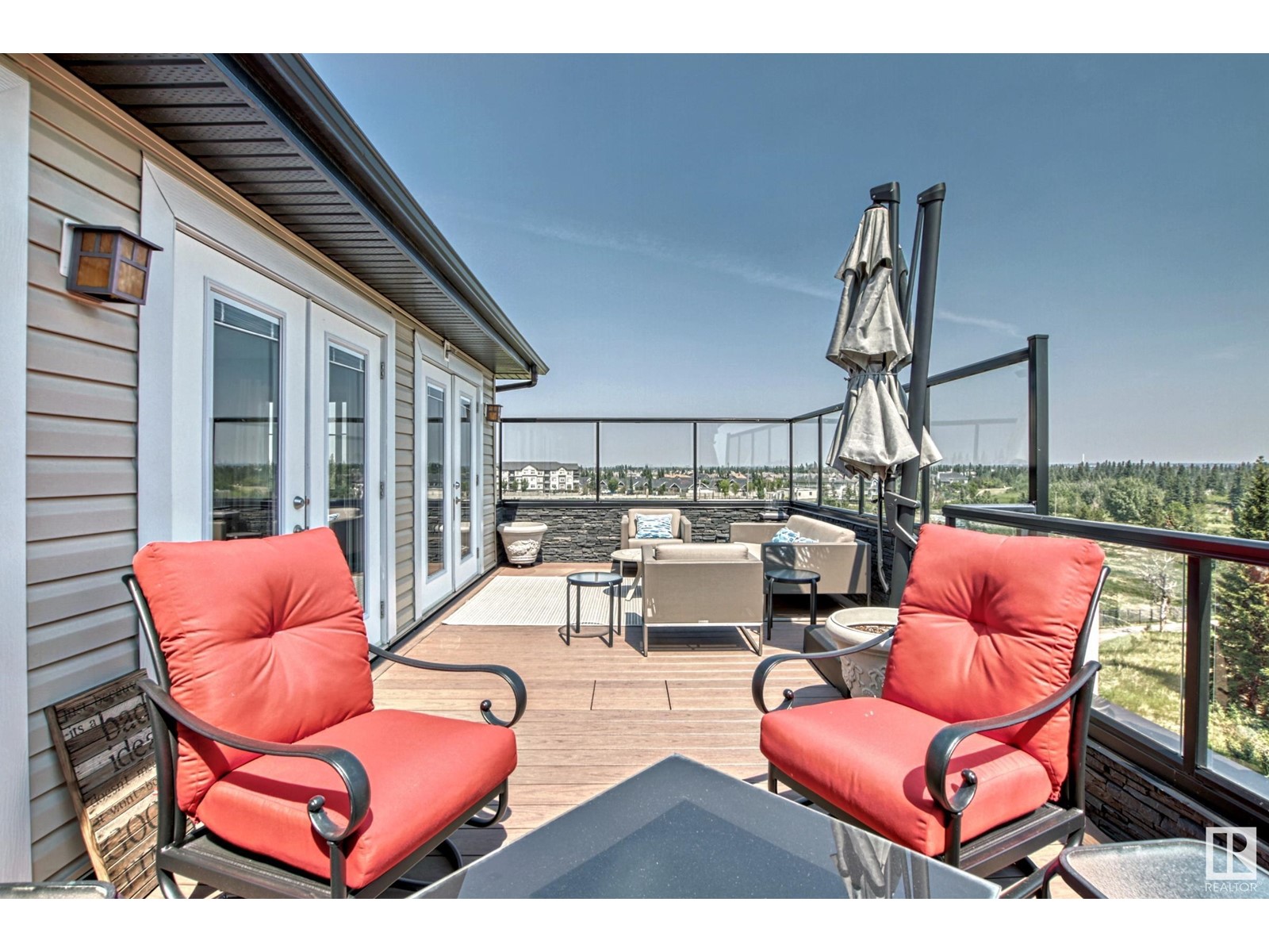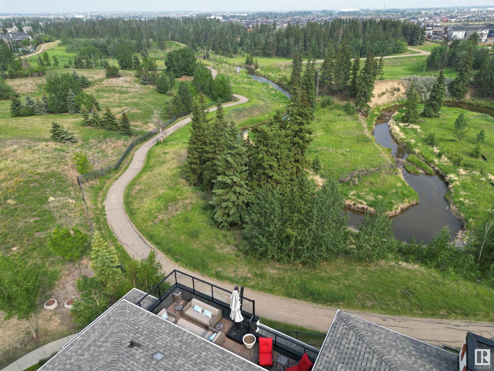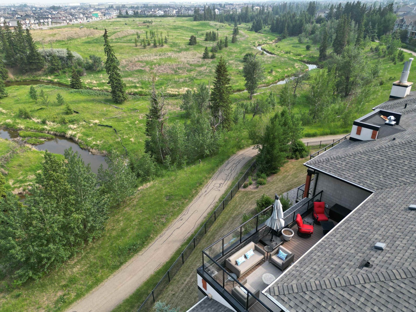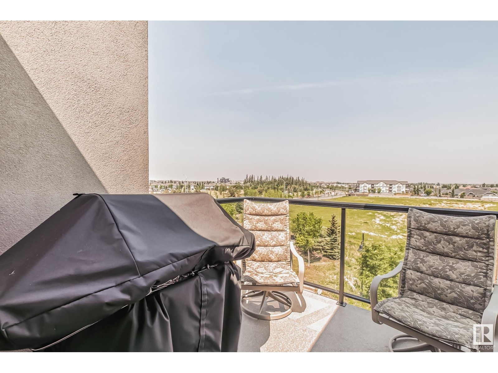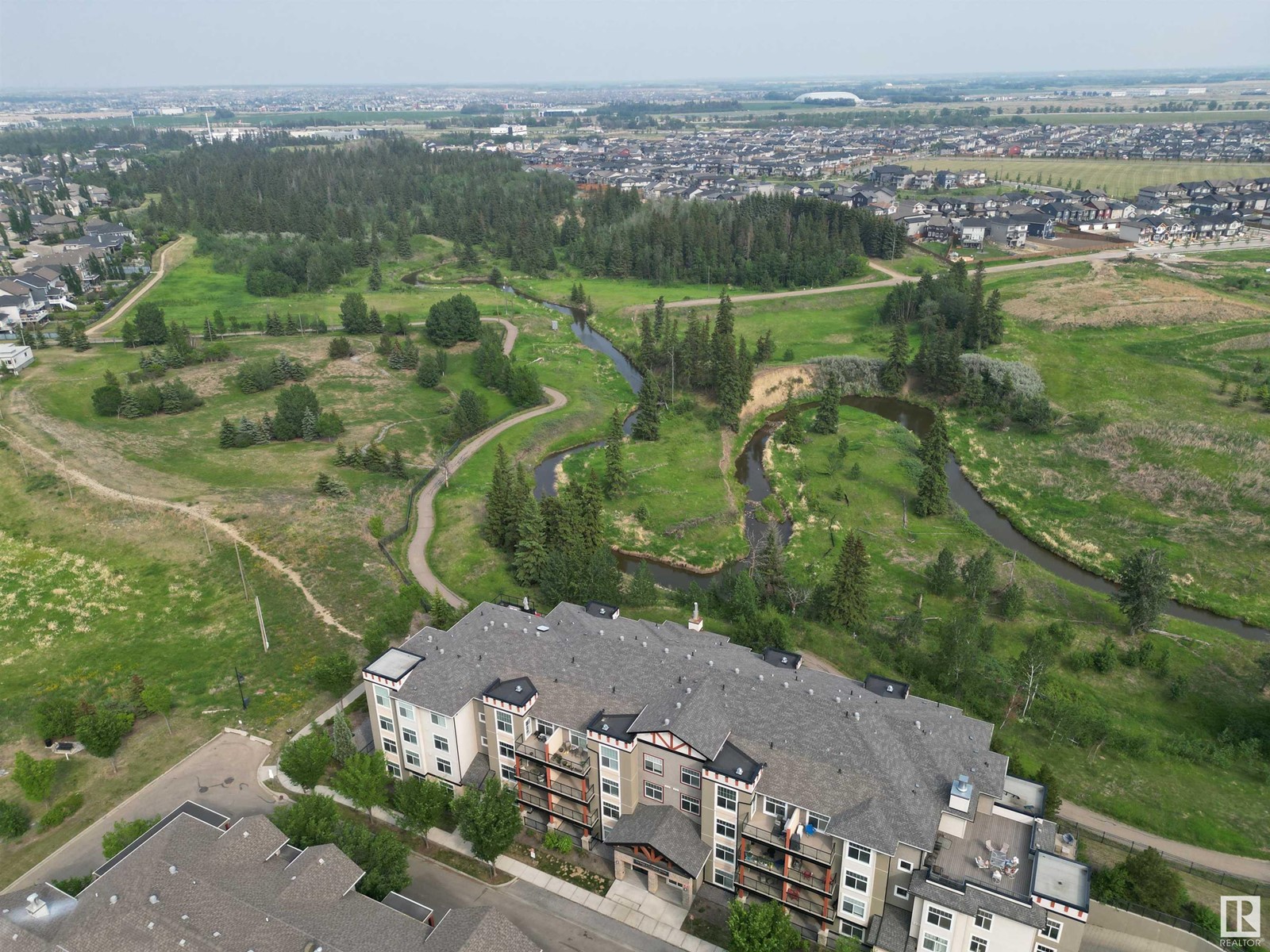 PREMIUM EXECUTIVE CONDO! Backing onto Blckmd Creek with stunning Ravine views this TOP FLOOR CORNER UNIT is absolutely spectacular! tandem titled parking stalls (1 EV stall) All the high-end upgrades you would expect in a home of this caliber including, 10ft ceilings, floor to ceiling windows, large private rooftop balcony, A/C & luxury hand scraped hardwood. The kitchen is a chef's dream, granite countertops, pendant, pot & under cabinet lighting, corner pantry, s/s appliances & massive island with sink & breakfast bar. The open design floor plan offers a wonderful living & dining area, unique custom fireplace & balcony doors opening to the breathtaking outdoor oasis with plenty of space to bring the dining outdoors! The primary bedroom has a w/i closet, gorgeous ensuite, his/her sinks & huge windows. The 2nd bedroom also has its own ensuite & den has a PRIVATE balcony. With scenic walking trails & restaurants within walking distance, plus the Henday & Hwy 2 minutes away, the location is UNBEATABLE!! (id:22211)