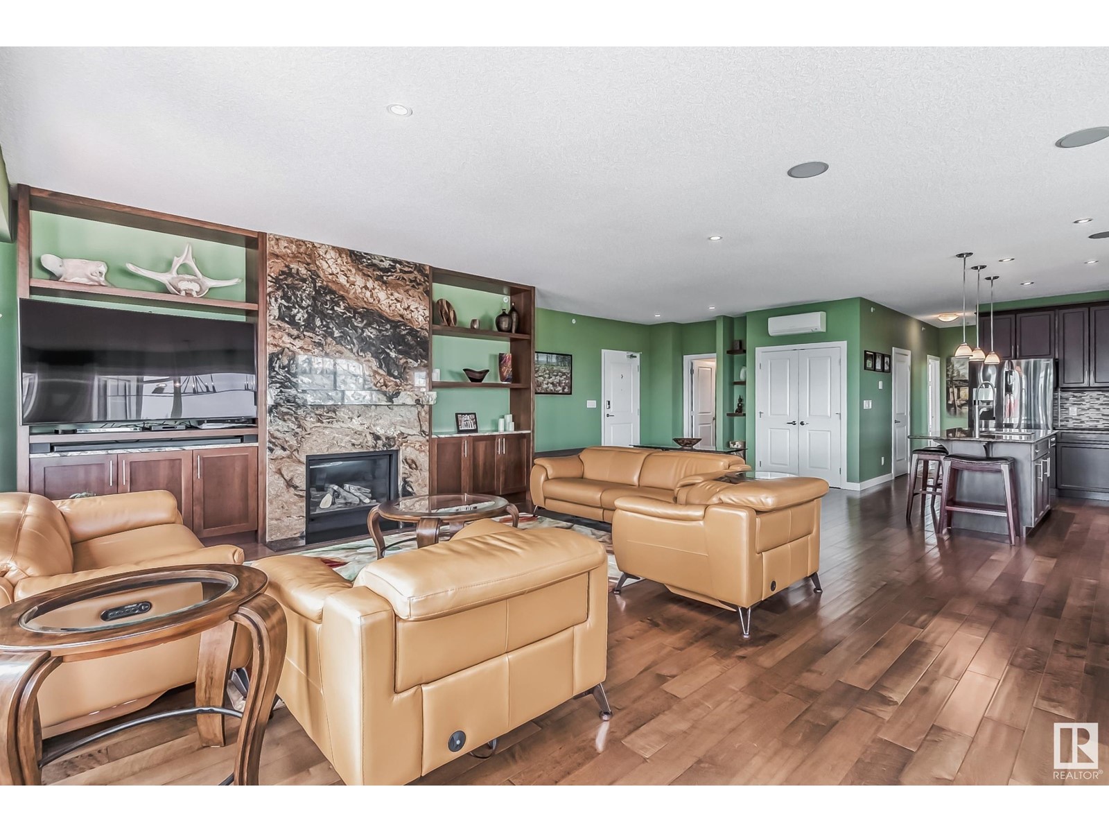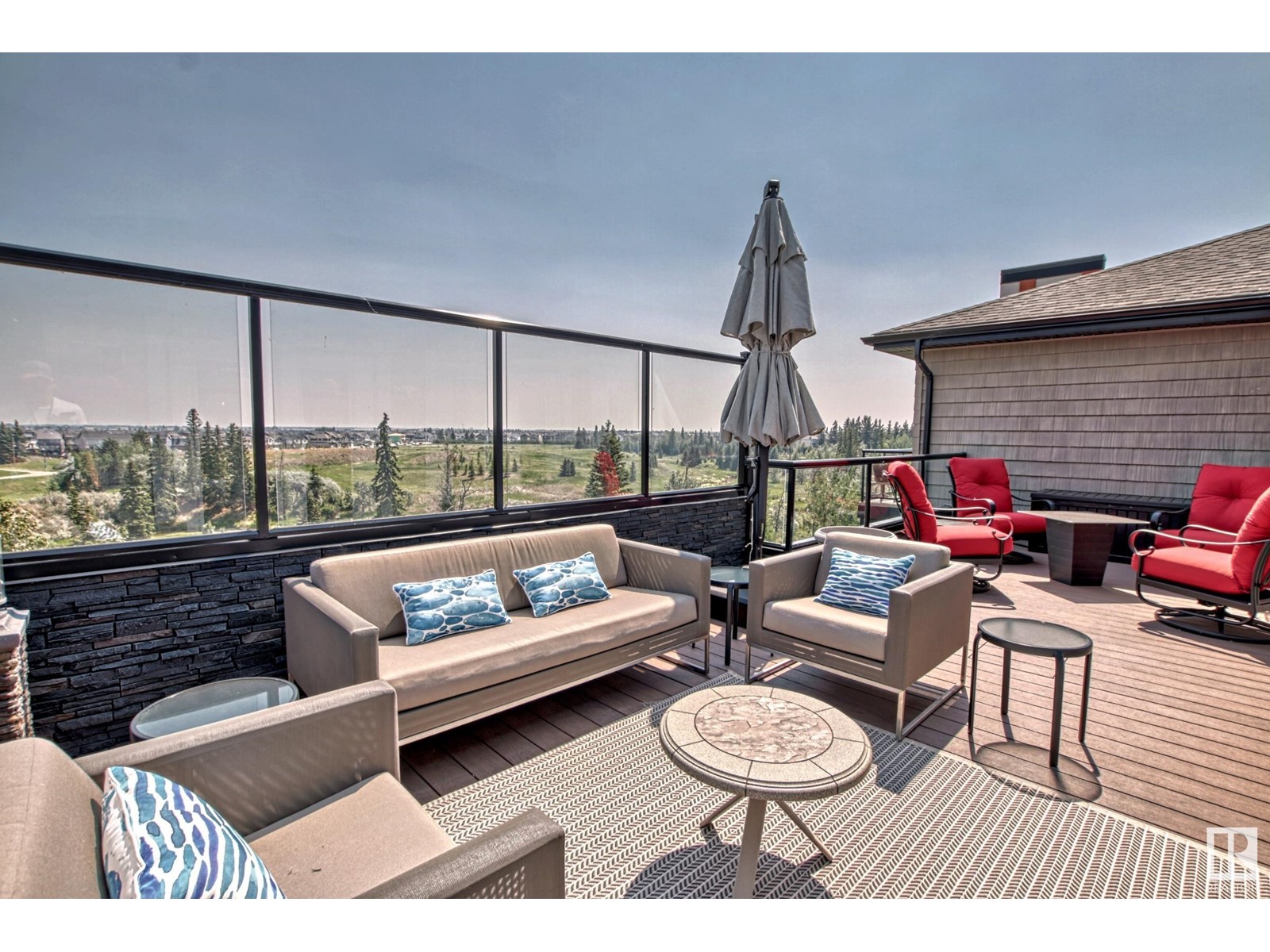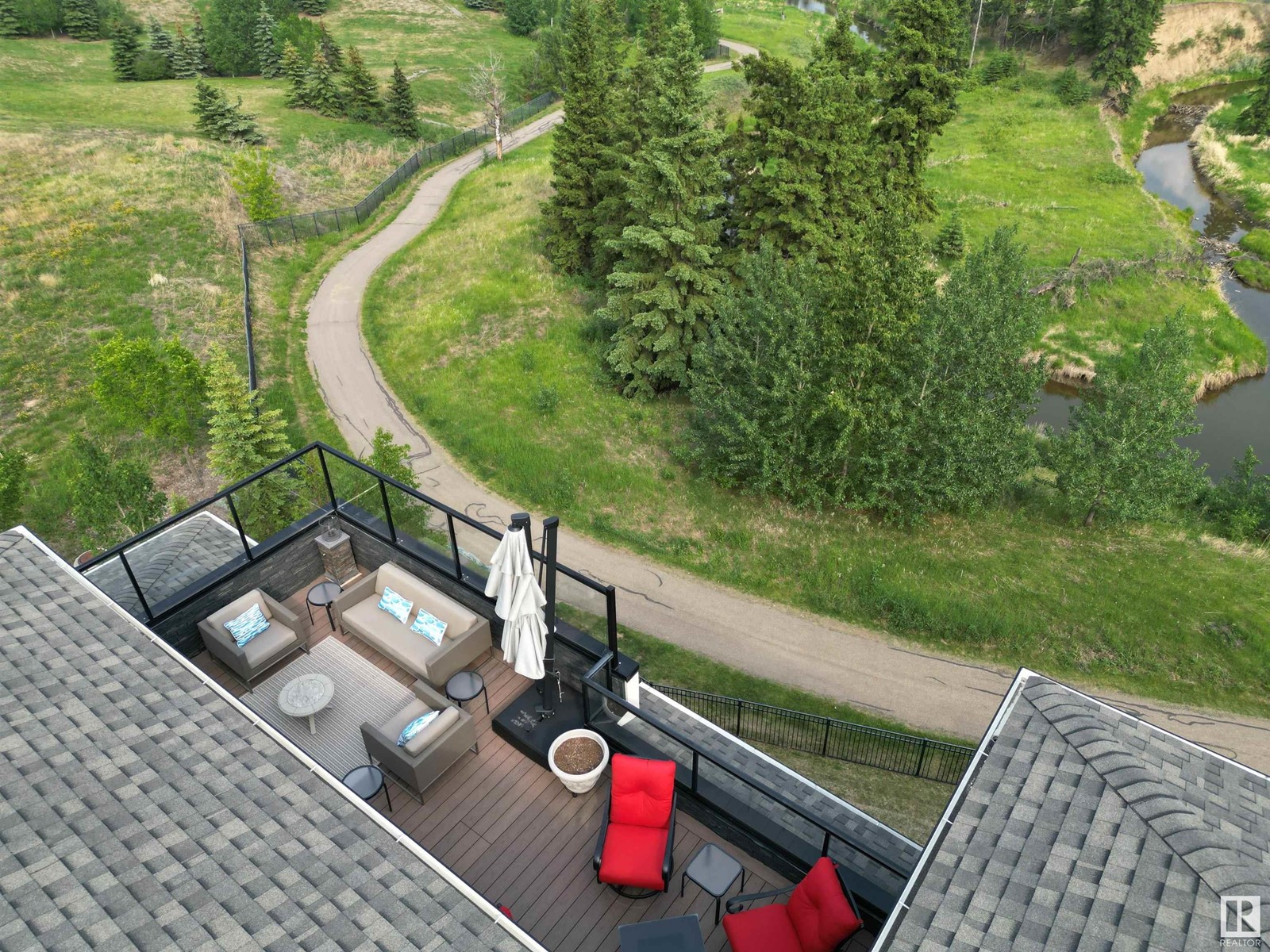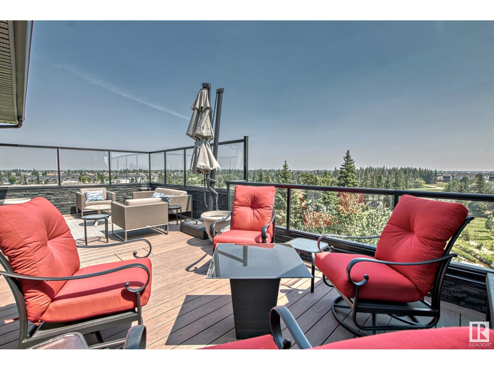 PREMIUM EXECUTIVE CONDO! Backing onto Blckmd Creek with stunning Ravine views this TOP FLOOR CORNER UNIT is absolutely spectacular! tandem titled parking stalls (1 EV stall) All the high-end upgrades you would expect in a home of this caliber including, 10ft ceilings, floor to ceiling windows, large private rooftop balcony, A/C & luxury hand scraped hardwood. The kitchen is a chef's dream, granite countertops, pendant, pot & under cabinet lighting, corner pantry, s/s appliances & massive island with sink & breakfast bar. The open design floor plan offers a wonderful living & dining area, unique custom fireplace & balcony doors opening to the breathtaking outdoor oasis with plenty of space to bring the dining outdoors! The primary bedroom has a w/i closet, gorgeous ensuite, his/her sinks & huge windows. The 2nd bedroom also has its own ensuite & den has a PRIVATE balcony. With scenic walking trails & restaurants within walking distance, plus the Henday & Hwy 2 minutes away, the location is UNBEATABLE!! (id:22211)