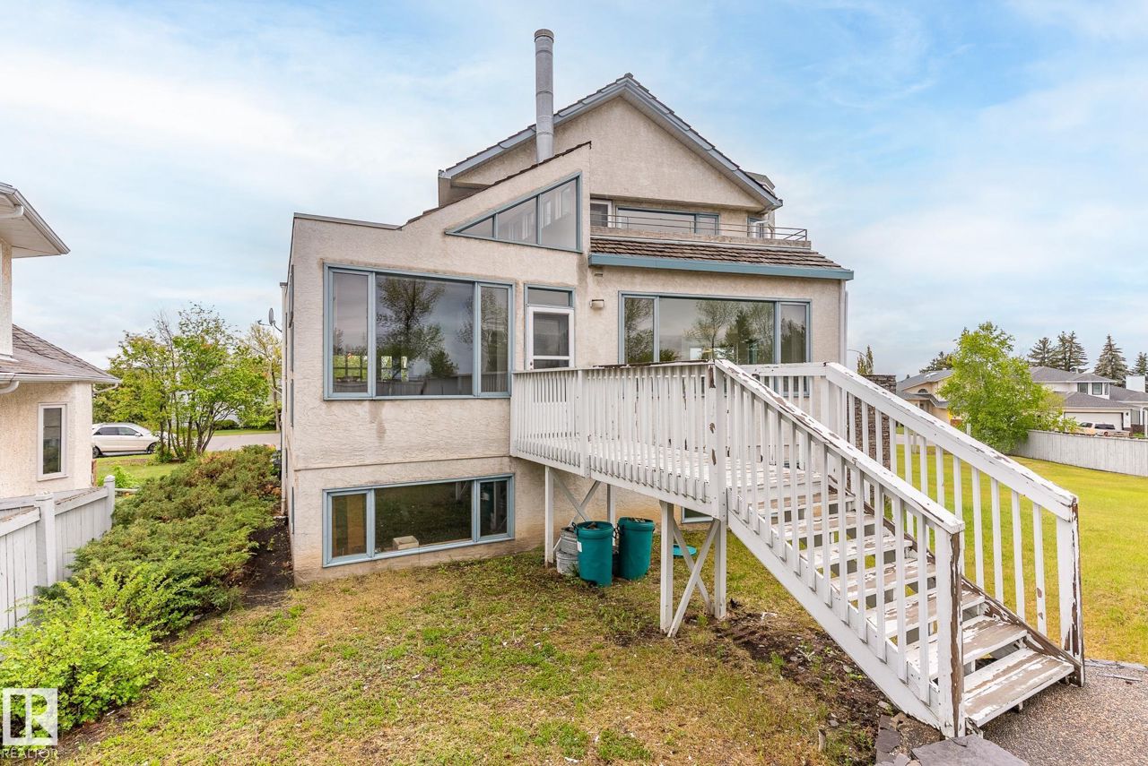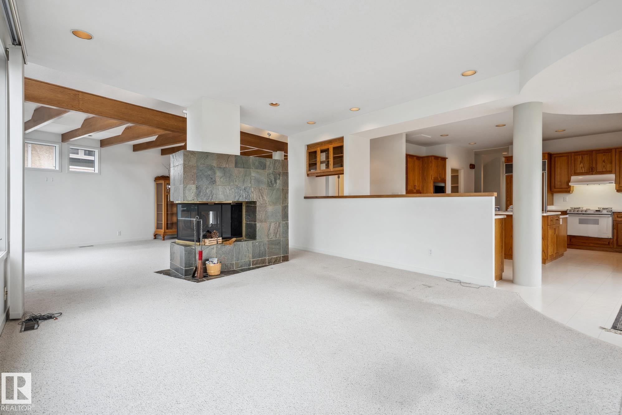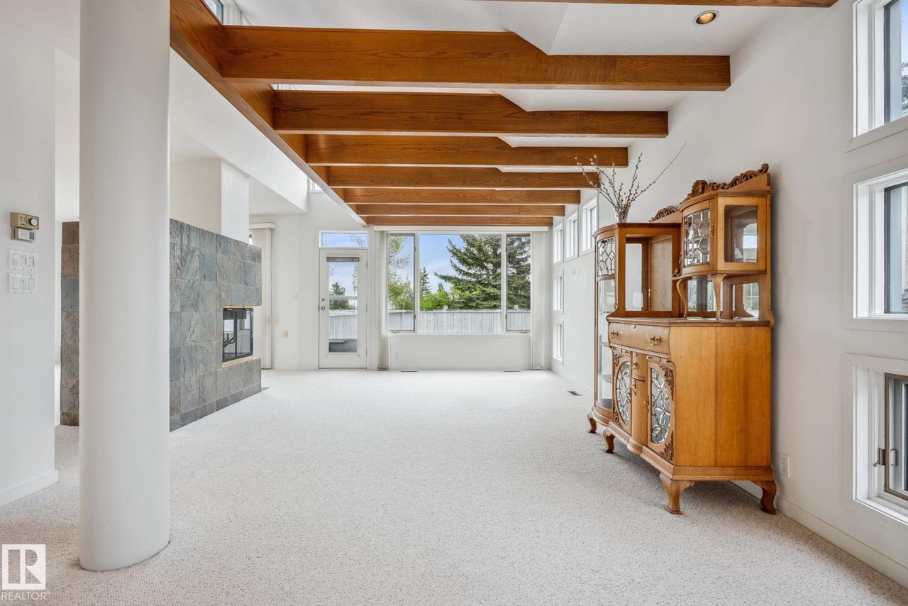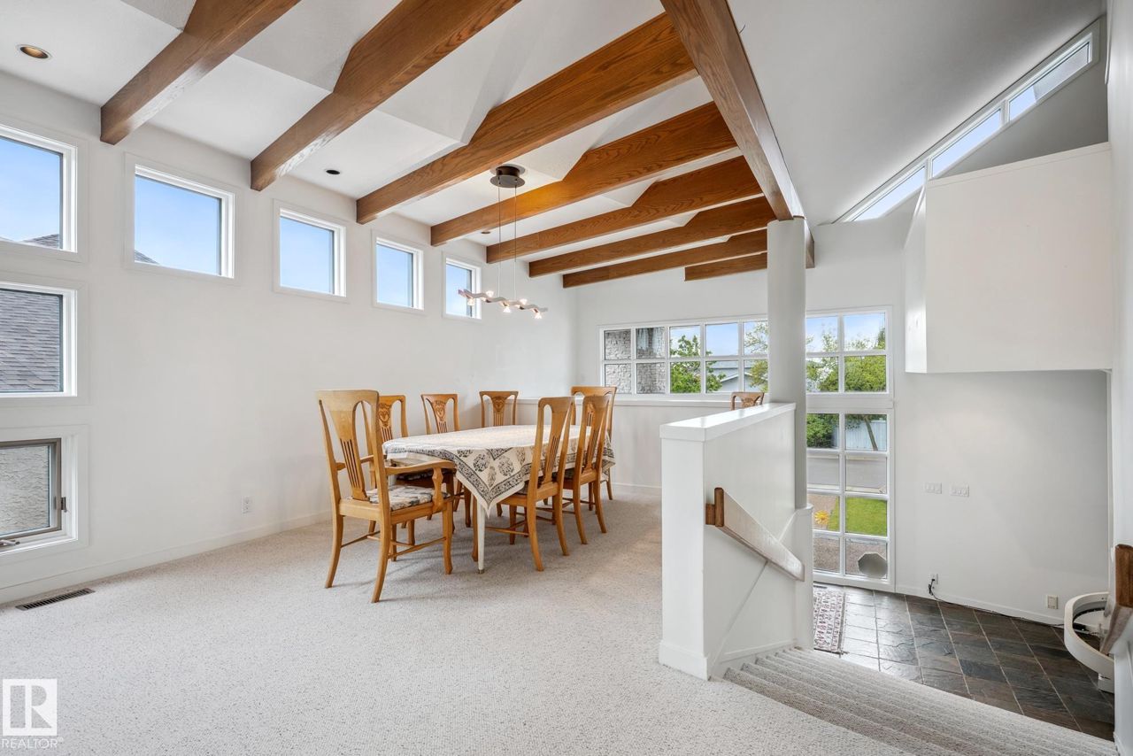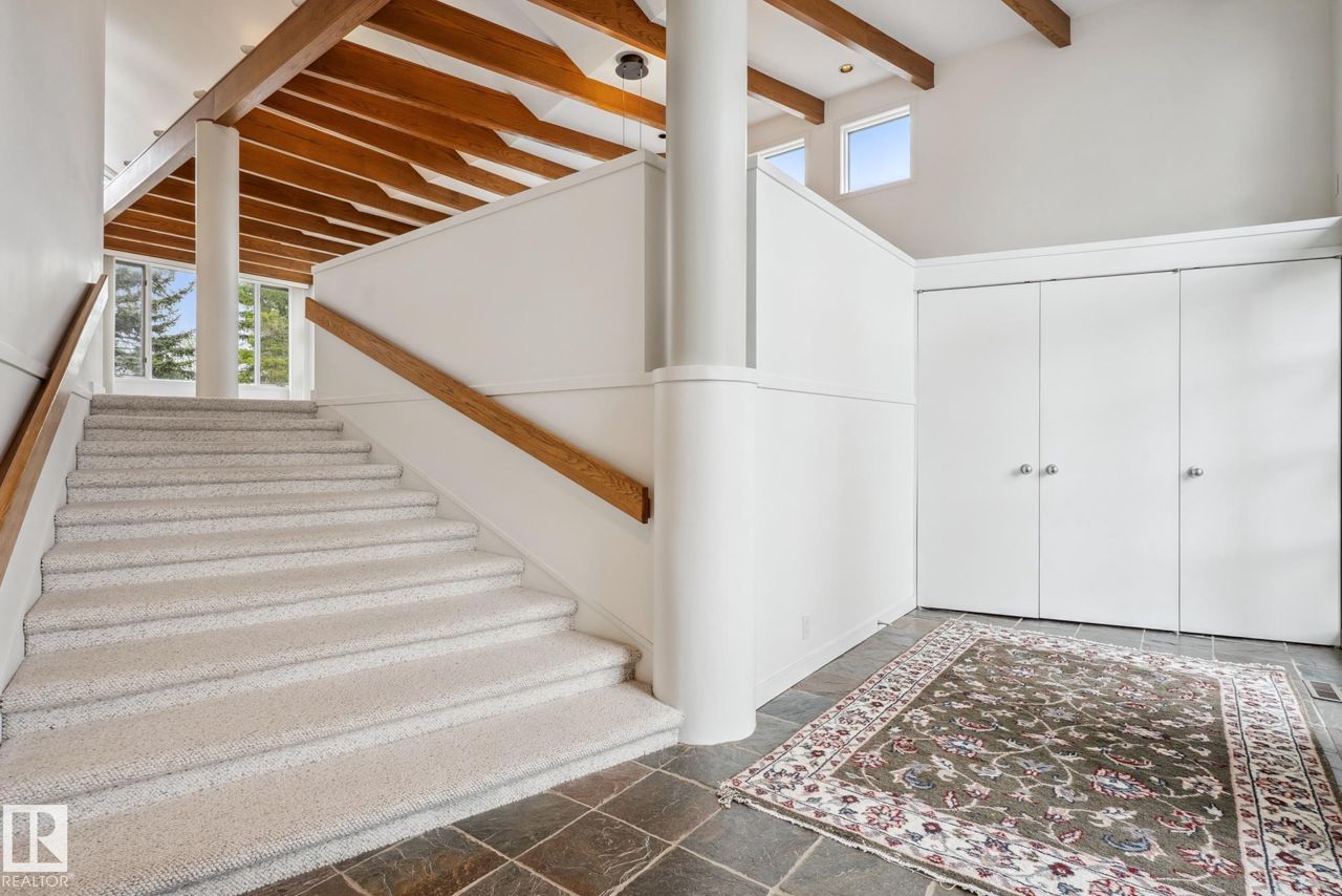 Welcome to this one of a kind, truly remarkable home in Rhatigan Ridge, designed by architect Terry Frost. This spacious 4 bed, 4 bath residence features striking exposed beams and a well thought out layout. The expansive kitchen boasts a two-tiered island, walk-in pantry, and seamless flow to the living/dining room areas, centred around a gas fireplace. Main floor bedrooms offer built-in closet shelving and private patio access, while the main 5 piece bath opens to the patio as well. The primary includes a walk-in closet, 5 piece ensuite with jacuzzi, steam shower and a private deck with downtown views. Additional highlights include a sunroom with new windows, spacious laundry, and triple garage. The basement is ready for development with large windows. Backing onto a green space, this home is full of character and ready for your personal touch.