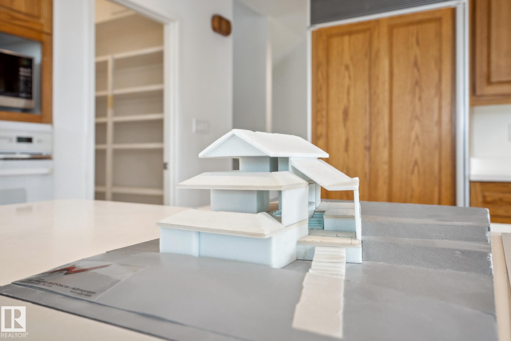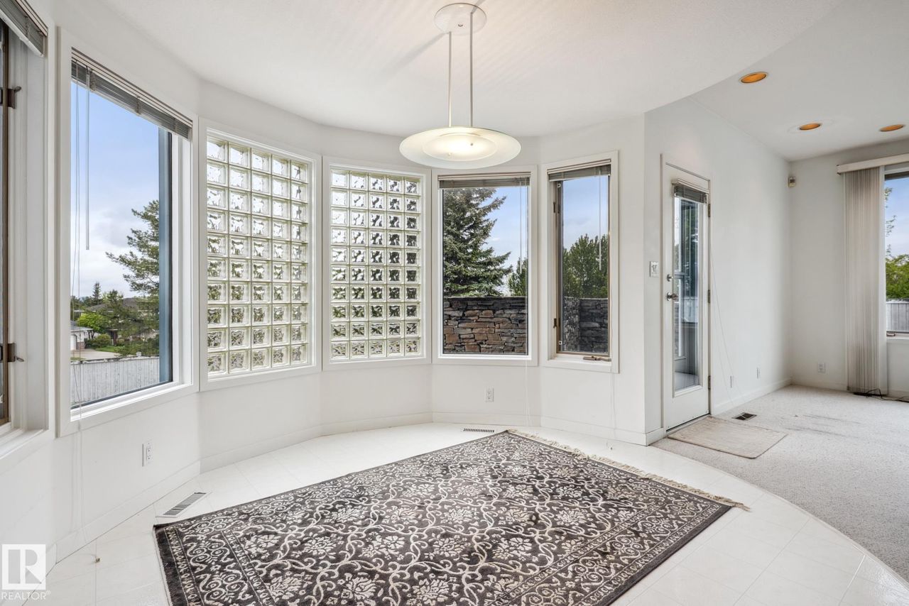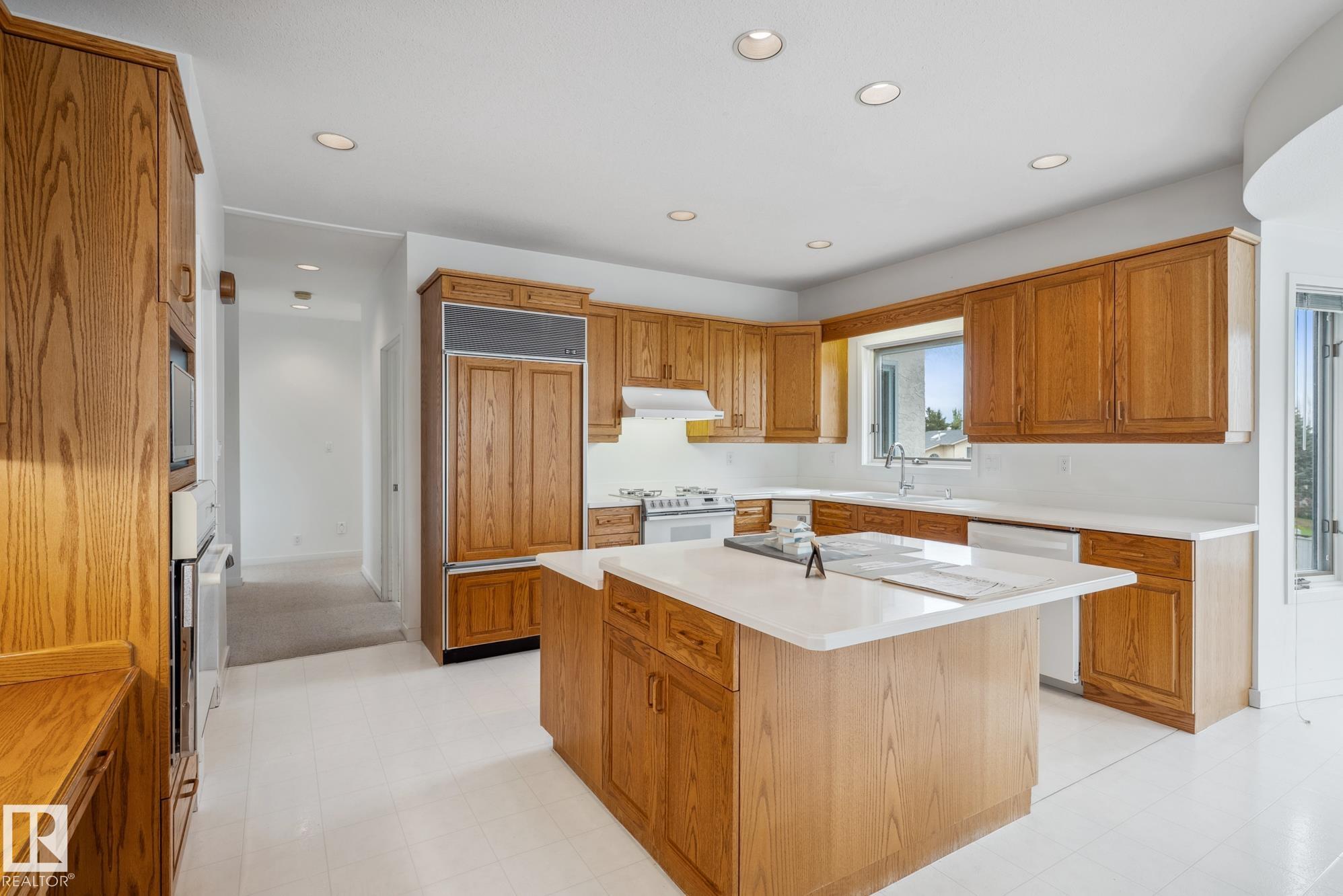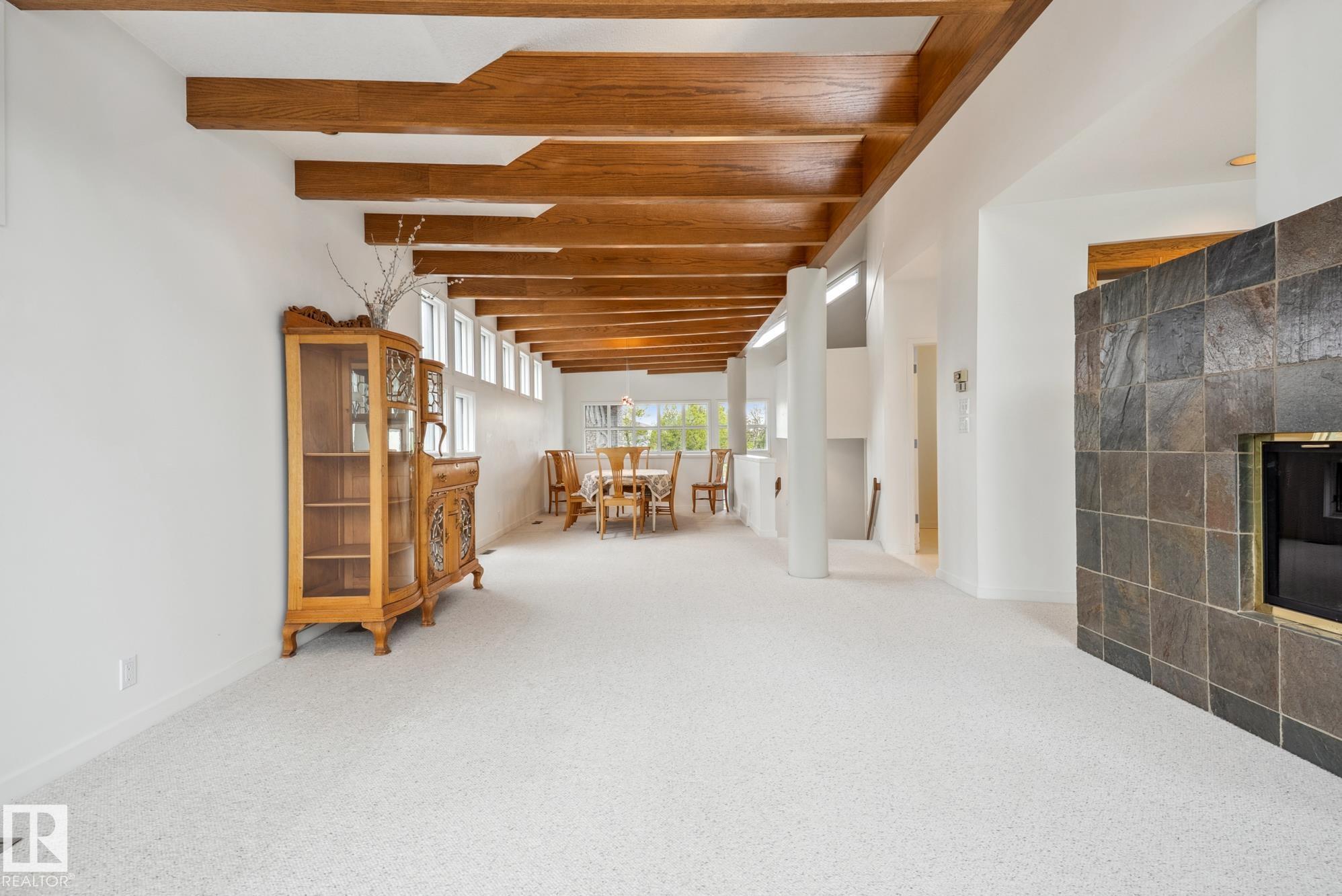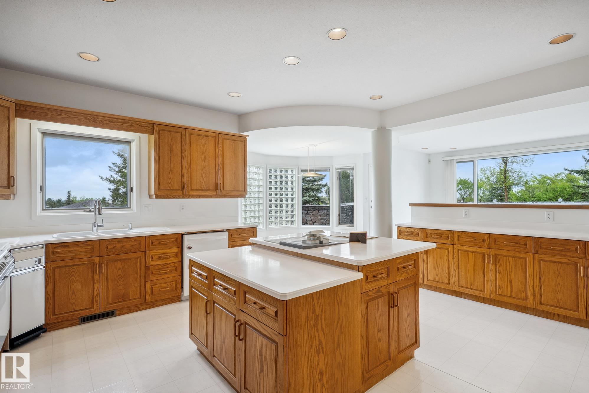 Welcome to this one of a kind, truly remarkable home in Rhatigan Ridge, designed by architect Terry Frost. This spacious 4 bed, 4 bath residence features striking exposed beams and a well thought out layout. The expansive kitchen boasts a two-tiered island, walk-in pantry, and seamless flow to the living/dining room areas, centred around a gas fireplace. Main floor bedrooms offer built-in closet shelving and private patio access, while the main 5 piece bath opens to the patio as well. The primary includes a walk-in closet, 5 piece ensuite with jacuzzi, steam shower and a private deck with downtown views. Additional highlights include a sunroom with new windows, spacious laundry, and triple garage. The basement is ready for development with large windows. Backing onto a green space, this home is full of character and ready for your personal touch.